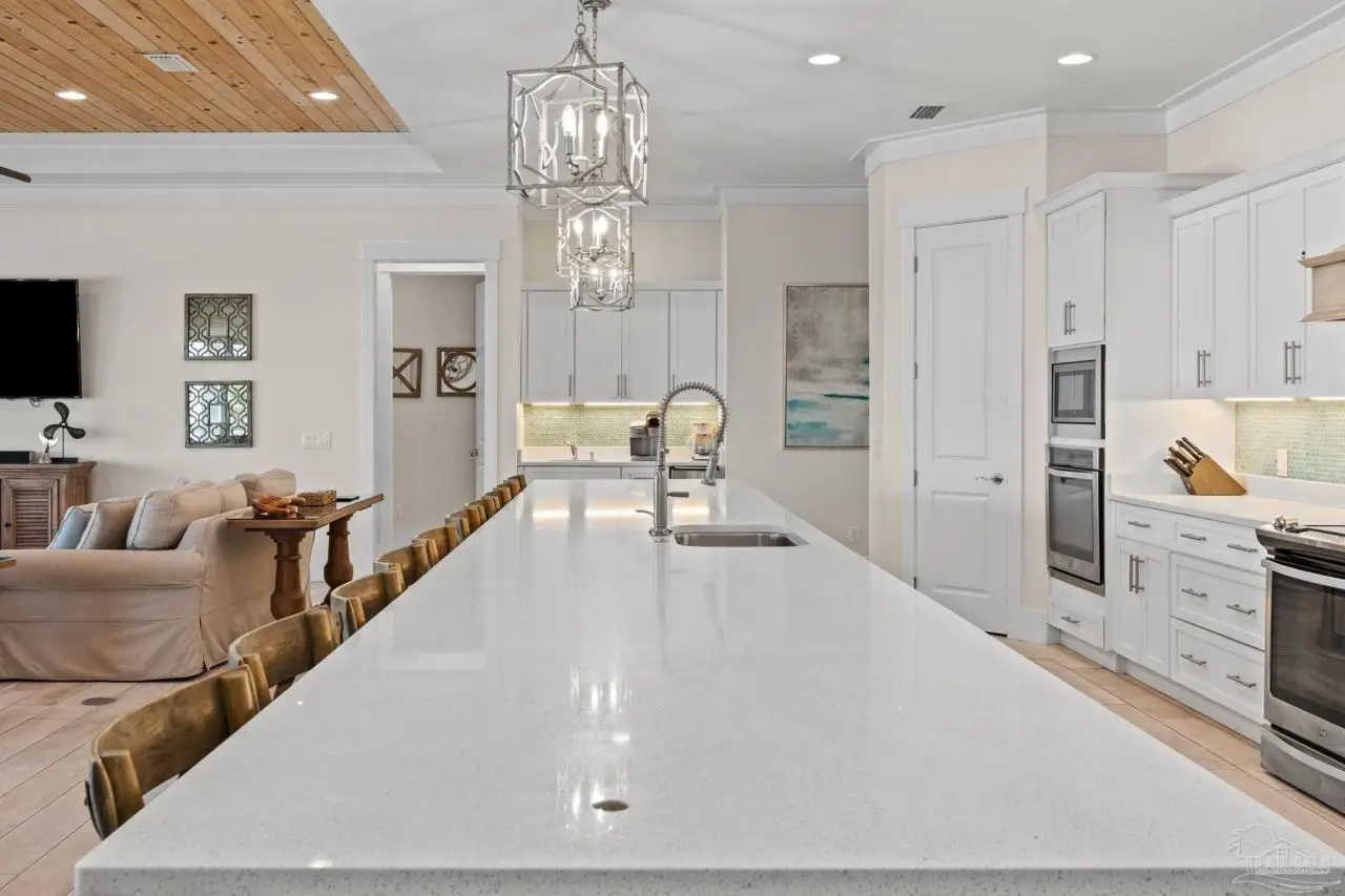 Welcome to one of Navarre Beach's most captivating coastal retreats - where breathtaking Gulf views, refined design, and resort-style amenities come together in perfect harmony. Professionally designed and furnished in a fresh coastal style, this remarkable residence sleeps up to 22 guests and offers exceptional flexibility as a primary home, second residence, or luxury vacation rental. Impeccably maintained, the home delivers the ultimate beachside lifestyle with a heated pool, expansive outdoor living areas, and light-filled interiors. Walls of windows fill the home with natural light, highlighting the wood-look tile flooring, high ceilings, crown molding, recessed lighting, and an open-concept design. The main living area flows seamlessly to a spacious covered deck and crow's nest which offers the perfect setting for alfresco dining and soaking in panoramic Gulf and Santa Rosa Sound views. The chef's kitchen is both stunning and functional, featuring stainless steel appliances, white shaker cabinetry, a white-washed oak vent hood, dual dishwashers, dual ovens, a striking glass tile backsplash, and stunning quartz countertops throughout. The highlight of the kitchen is its 20-foot-long oversized island that can comfortably seat up to twelve guests. A wet bar with an ice maker and an additional refrigerator in the laundry room add convenience for entertaining. Each bedroom is bright and private, offering versatile space for guests. Shiplap accents and neutral finishes create warmth and coastal character, while spa-inspired bathrooms feature quartz countertops, earth-tone tile, and sleek modern fixtures. You can access the backyard by using the elevator or navigating the stairway, and step into an oasis featuring a 27'x17' pool with a 10-foot sun shelf, a spacious pool deck with a half bath, and two outdoor showers. The expansive area beneath the home provides parking for up to ten vehicles, a golf cart charging station, and a covered entertainment area.