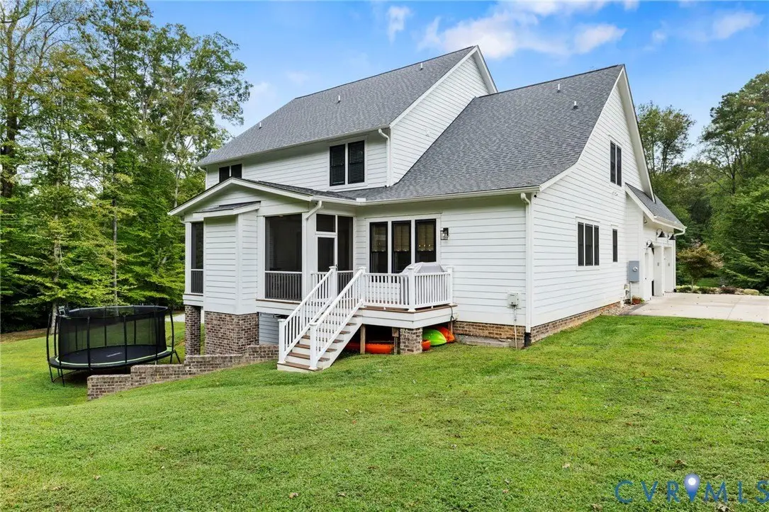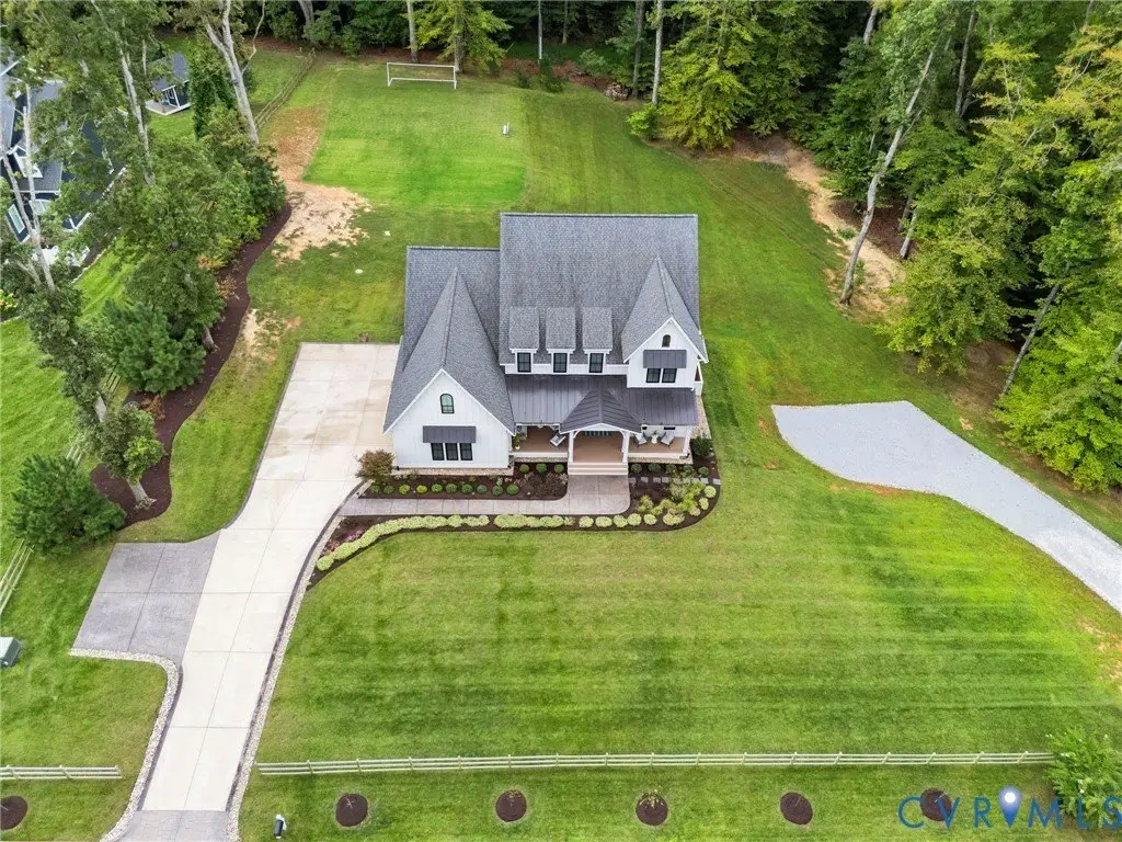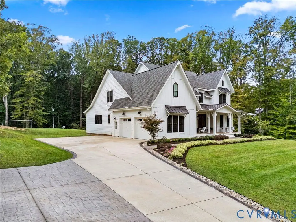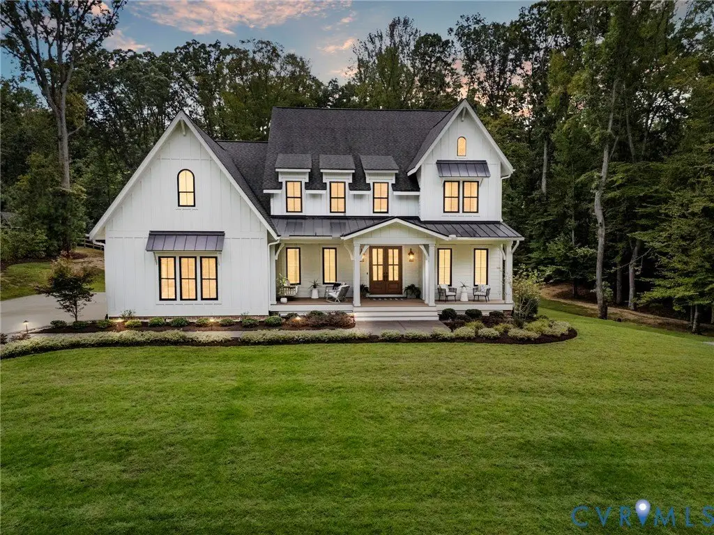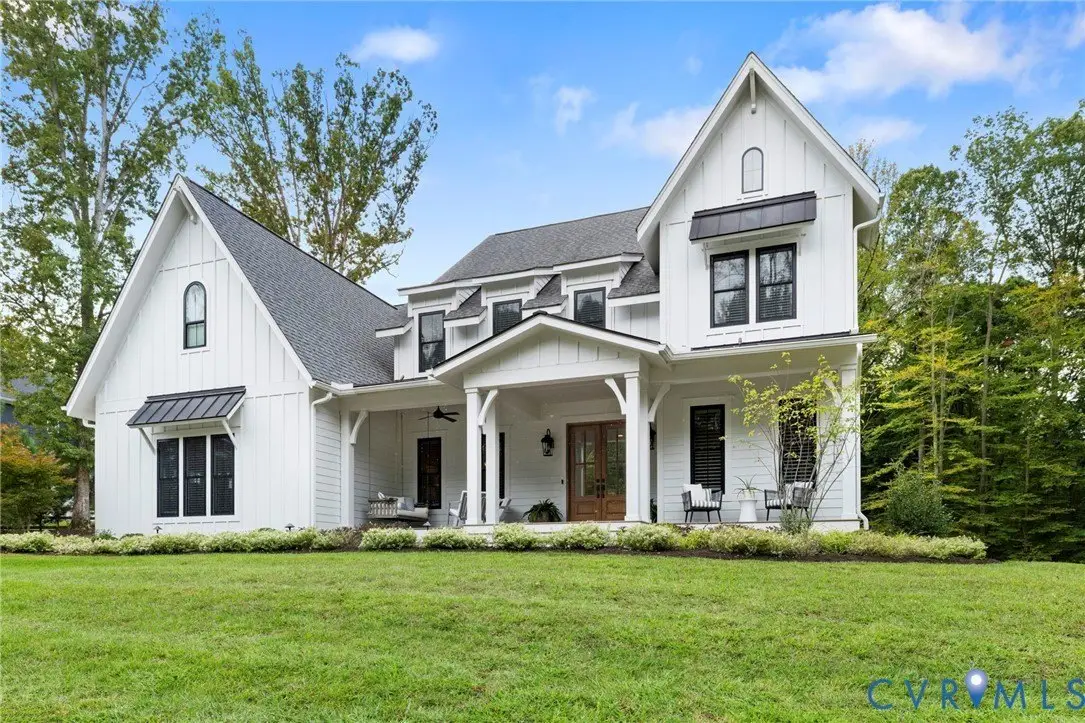 This custom-designed Pacific Farmhouse by Biringer Builders is a masterpiece of craftsmanship & design, blending elevated sophistication with everyday comfort. Situated off of historic Old Gun Road on 2 private acres, the home offers the serenity of a retreat while remaining minutes from conveniences. From the inviting front porch to the welcoming foyer, every detail has been thoughtfully curated. Soaring 10' ceilings, exquisite moldings & wide-plank wood floors establish an atmosphere of refinement. A paneled dining room & butler's pantry provides the perfect setting for gatherings, while the light-filled family room with beamed ceilings, fireplace, and built-ins flows seamlessly to a three-season screened porch with a stone fireplace-ideal for entertaining & relaxation. The chef's kitchen is a true showstopper, featuring a large quartz island with breakfast bar, floor-to-ceiling cabinetry, designer backsplash, luxury appliances, and a sunlit dining area. A walk-in pantry, office/mudroom, powder room and laundry enhance main-level living. The primary suite is a luxurious retreat, wrapped in windows with refined crown molding. The spa-inspired bath offers a double vanity, walk-in shower, private water closet, linen storage, and a boutique-style walk-in dressing room with custom built-ins. Upstairs, a versatile loft connects four spacious bedrooms, including a Jack-and-Jill suite plus a second laundry room with cabinetry. An additional suite with full bath offers flexible space for a media room, office or guest accommodations with expansion potential in the wired storage area. The finished lower level provides abundant living space with a great room, playroom, guest suite and direct walk-out to a private patio. An oversized two-car garage offers excellent storage. Outdoors, the property is designed for both recreation & retreat with a sports field and wooded trails and convenient second stone driveway. This remarkable residence offers a rare opportunity to enjoy elevated living in the heart of beautiful Midlothian.
