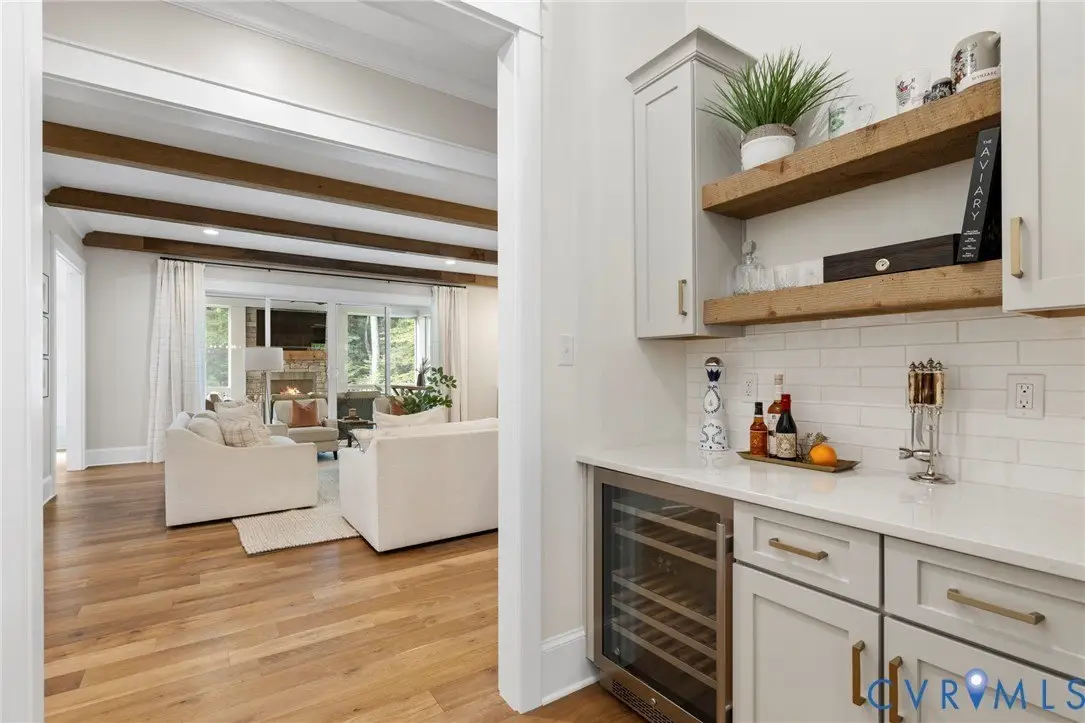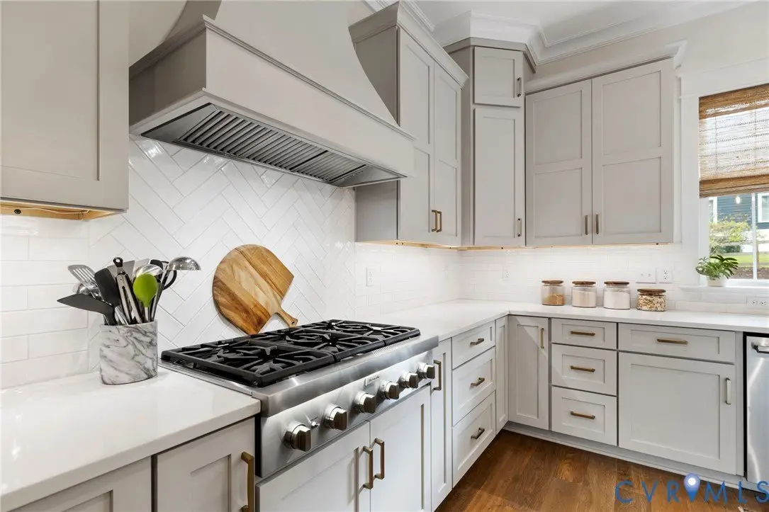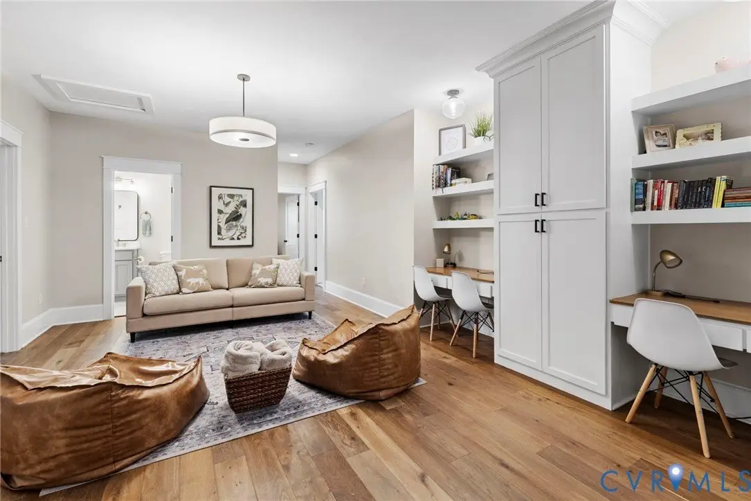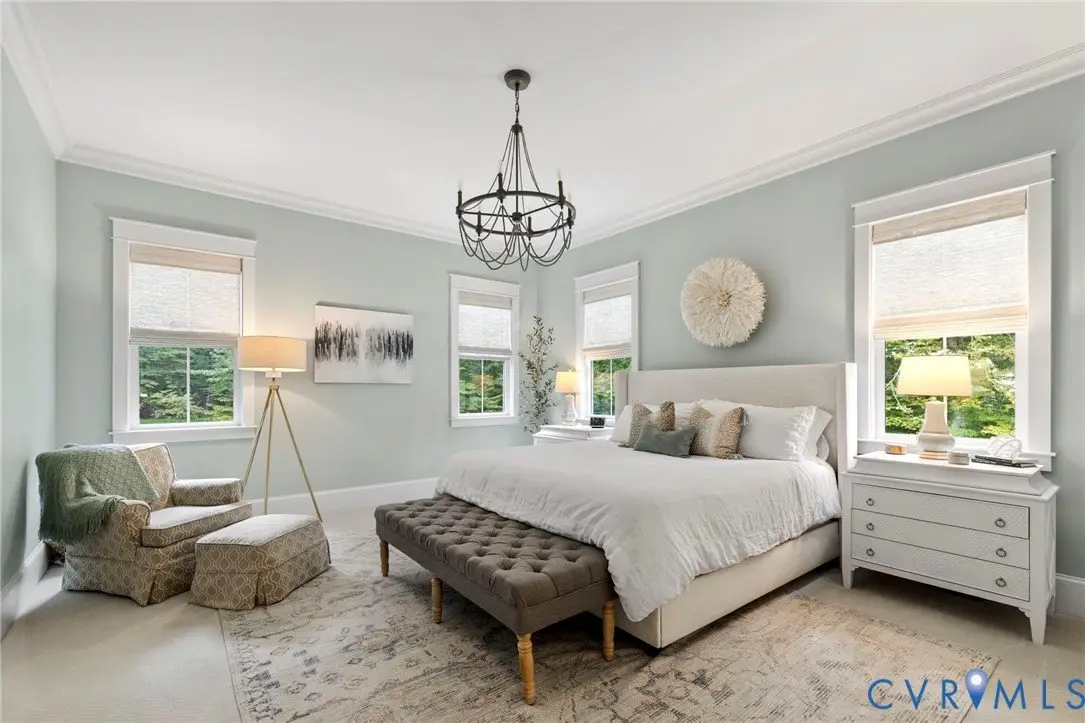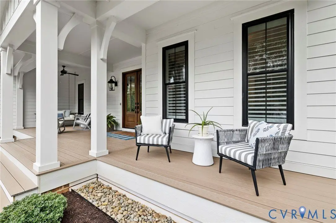 This custom-designed Pacific Farmhouse by Biringer Builders is a masterpiece of craftsmanship & design, blending elevated sophistication with everyday comfort. Situated off of historic Old Gun Road on 2 private acres, the home offers the serenity of a retreat while remaining minutes from conveniences. From the inviting front porch to the welcoming foyer, every detail has been thoughtfully curated. Soaring 10' ceilings, exquisite moldings & wide-plank wood floors establish an atmosphere of refinement. A paneled dining room & butler's pantry provides the perfect setting for gatherings, while the light-filled family room with beamed ceilings, fireplace, and built-ins flows seamlessly to a three-season screened porch with a stone fireplace-ideal for entertaining & relaxation. The chef's kitchen is a true showstopper, featuring a large quartz island with breakfast bar, floor-to-ceiling cabinetry, designer backsplash, luxury appliances, and a sunlit dining area. A walk-in pantry, office/mudroom, powder room and laundry enhance main-level living. The primary suite is a luxurious retreat, wrapped in windows with refined crown molding. The spa-inspired bath offers a double vanity, walk-in shower, private water closet, linen storage, and a boutique-style walk-in dressing room with custom built-ins. Upstairs, a versatile loft connects four spacious bedrooms, including a Jack-and-Jill suite plus a second laundry room with cabinetry. An additional suite with full bath offers flexible space for a media room, office or guest accommodations with expansion potential in the wired storage area. The finished lower level provides abundant living space with a great room, playroom, guest suite and direct walk-out to a private patio. An oversized two-car garage offers excellent storage. Outdoors, the property is designed for both recreation & retreat with a sports field and wooded trails and convenient second stone driveway. This remarkable residence offers a rare opportunity to enjoy elevated living in the heart of beautiful Midlothian.