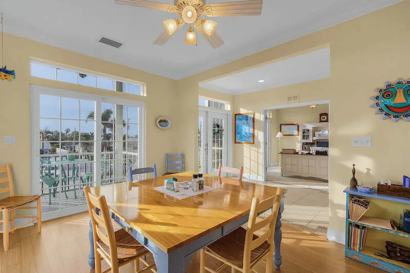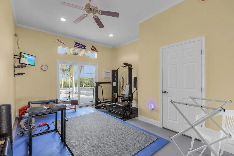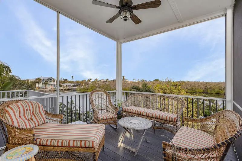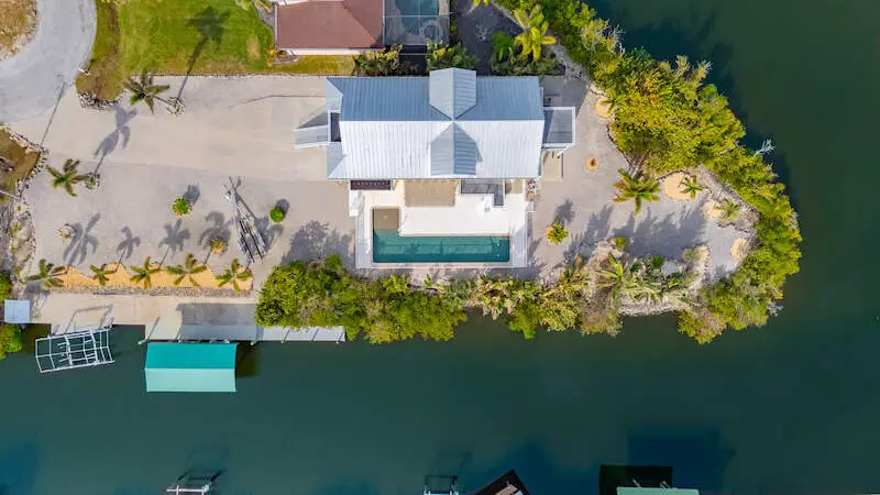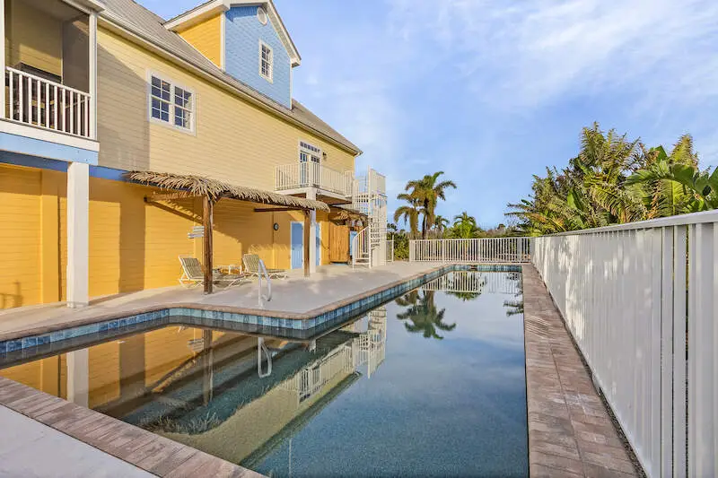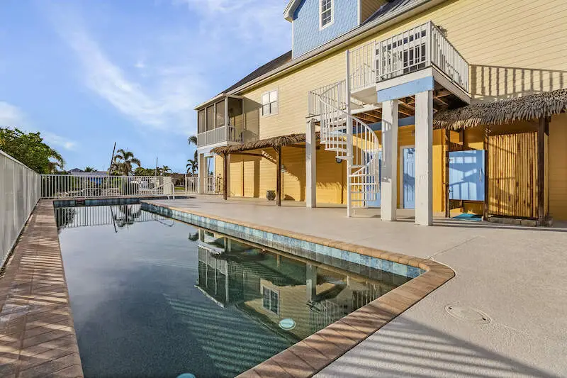 As you enter this unique custom home you will be surrounded by tropical colors accented with the warm tones of bamboo, cypress and mahogany. The architecture and decor was inspired by the current owners' travels to the Keys, Caribbean and South Pacific. The floor plan was designed with the retired couple in mind anticipating many visits from adult children and grandchildren. The master suite is located on the main floor, while the third floor has three bedrooms and its own bathroom. This giving privacy to all when wanted. A very comfortable home for day to day living. With its many windows and screened porches this home is bright and airy often times not even needing the AC due to the flow through breezes. There is even a small screened porch directly off the kitchen that was designed just for the grill. The floor treatments are a combination of tile, carpet, and wood for easy maintenance and sound control. Just inside the front door is a room that was designed as an office with double entry doors, perfect for a business in the home. There is a conveniently located elevator that goes to all three floors. On the main floor the elevator stop is in the kitchen making bringing up groceries from the garage to the kitchen a breeze. The ground level offers a large garage and an air conditioned bonus room with an attached bath and outdoor shower. The garage doors are 9 foot high along with a 10 foot ceiling in the garage. Lots of room for vehicles and storage. Outside you will find nearly one half acre of land with approximately 360 feet of waterfront. The environmentally friendly landscape includes many palms, bamboo, bougainvillea, hibiscus, oleander and even a gumbo limbo tree. The shoreline is lined with sea grapes and mangroves, true Florida native plants. As you step down onto the approximately 100 feet of dock you will find a 20,000 pound and a 7000 pound boat lift along with a covered fish cleaning station. From the main floor of the home you will enjoy descending the spiral staircase and onto the pool deck of the 50 foot by 10 foot lap pool. The pool also has an adjacent shallow area especially for the toddler grandchildren. On those hot Florida days you will like the pool deck option of the shade of the tiki and using the wonderful outside tiki shower. As an added feature all outside deck railings are low-maintenance aluminum, and decks and docks are composite planked. While not included in the price the price, some furnishing and the 21 foot Key West boat are negotiable.