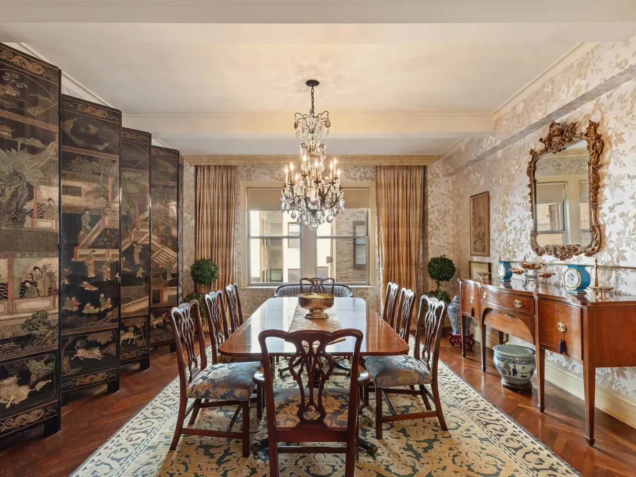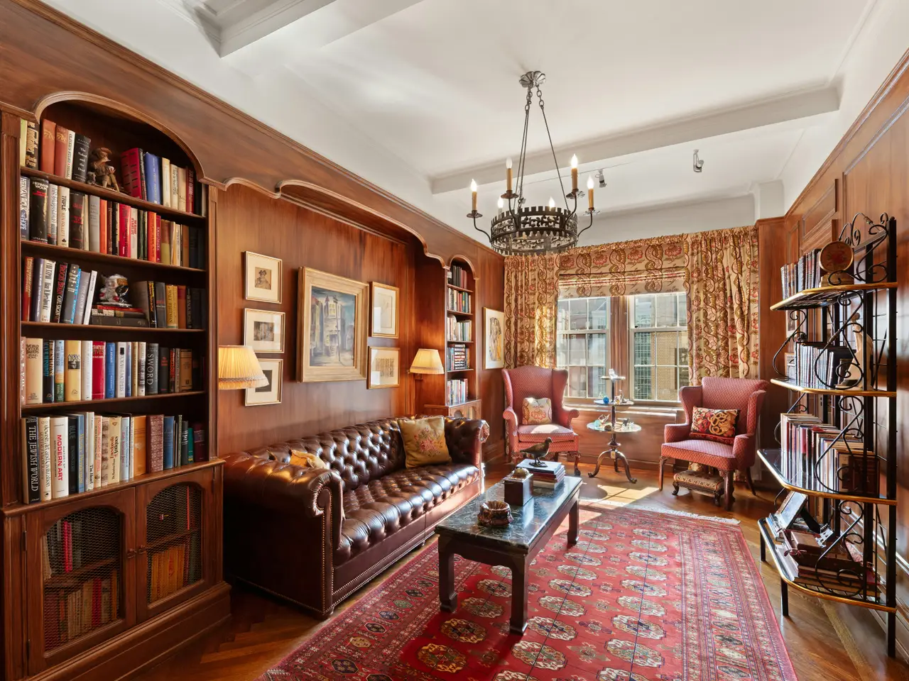 885 Park Avenue, 12B Grand in scale and full of pre-war elegance and charm, this sprawling nine-room, three-and-a-half-bath residence can accommodate sophisticated, large-scale entertaining as well as quiet refinement and comfort for everyday living. Apartment 12B is perched high above tree-lined 78th Street just off Park Avenue, with several rooms enjoying southern exposures with abundant sunlight and open city views. A semi-private landing leads to an entrance foyer and square gallery which centers the apartment's gracious layout. The living room is nearly 30' in length, with ceilings just under 10', original oak herringbone floors and wood-burning fireplace. An adjacent library (which could easily be converted to a fourth bedroom) features custom built-in bookshelves, a stylish recessed bar and large walk-in closet. Opposite the library is an exceptionally spacious formal dining room flanked by mahogany and etched glass doors. The adjacent, windowed eat-in-kitchen's generous proportions can accommodate a variety of configurations with abundant space for both storage and seating. There are two former staff rooms off the kitchen, one currently configured as a laundry room with full-size washer and vented dryer and the other as a home office, with a renovated half-bathroom in between. The private residential wing is comprised of three bedrooms, all with expansive dimensions, high ceilings and abundant closets. The primary bedroom is bathed in southern light and features a private vestibule and en suite, windowed, marble full bath. 885 Park Avenue is a premier, full-service cooperative designed and built in 1927 by renowned pre-war architects Schwartz & Gross. The building offers a large, renovated fitness center, live-in resident manager, attentive staff and is pet-friendly. Private storage transfers with the apartment. Fifty percent financing is allowed and there is a 3% flip tax payable by purchaser.