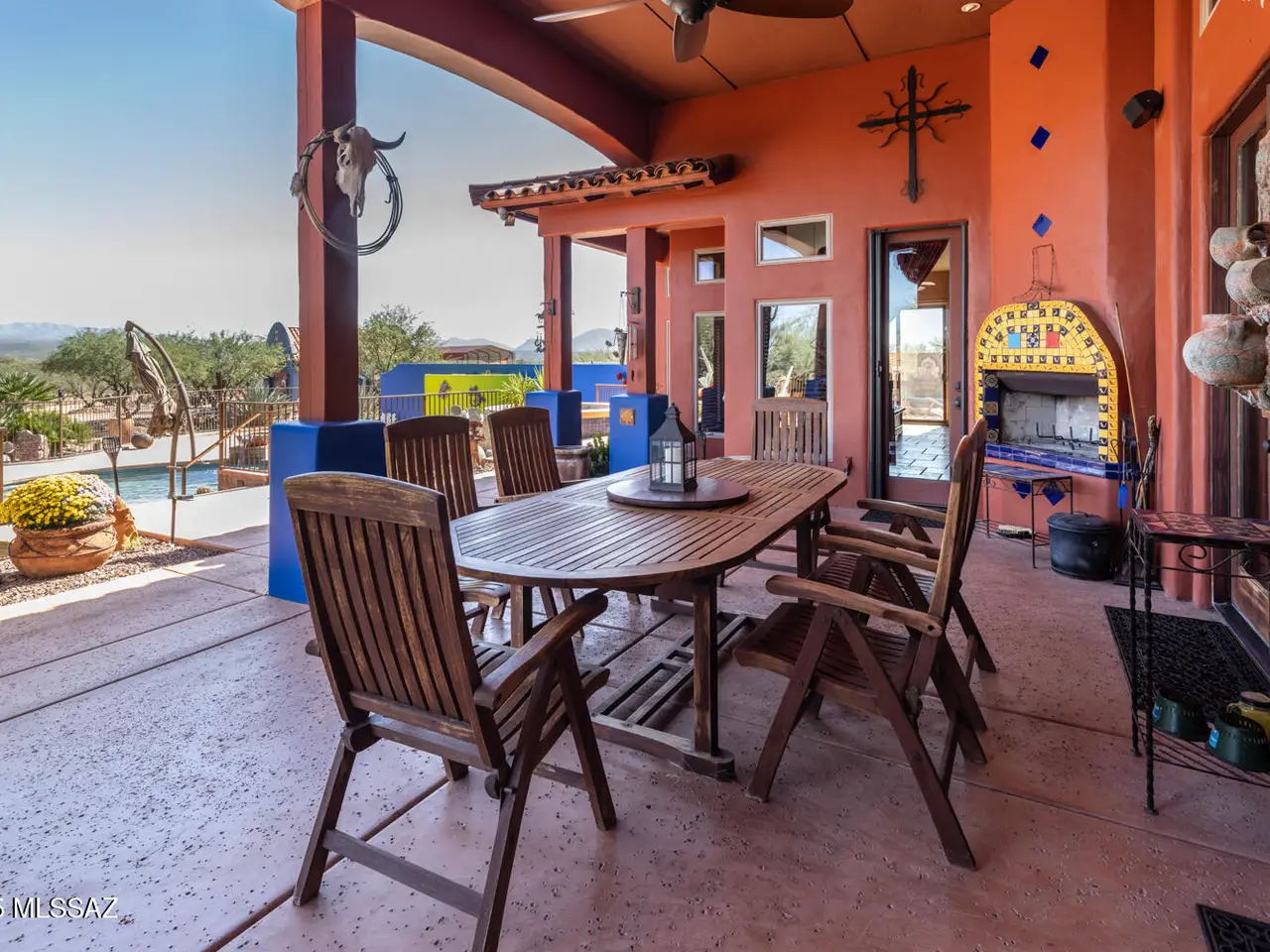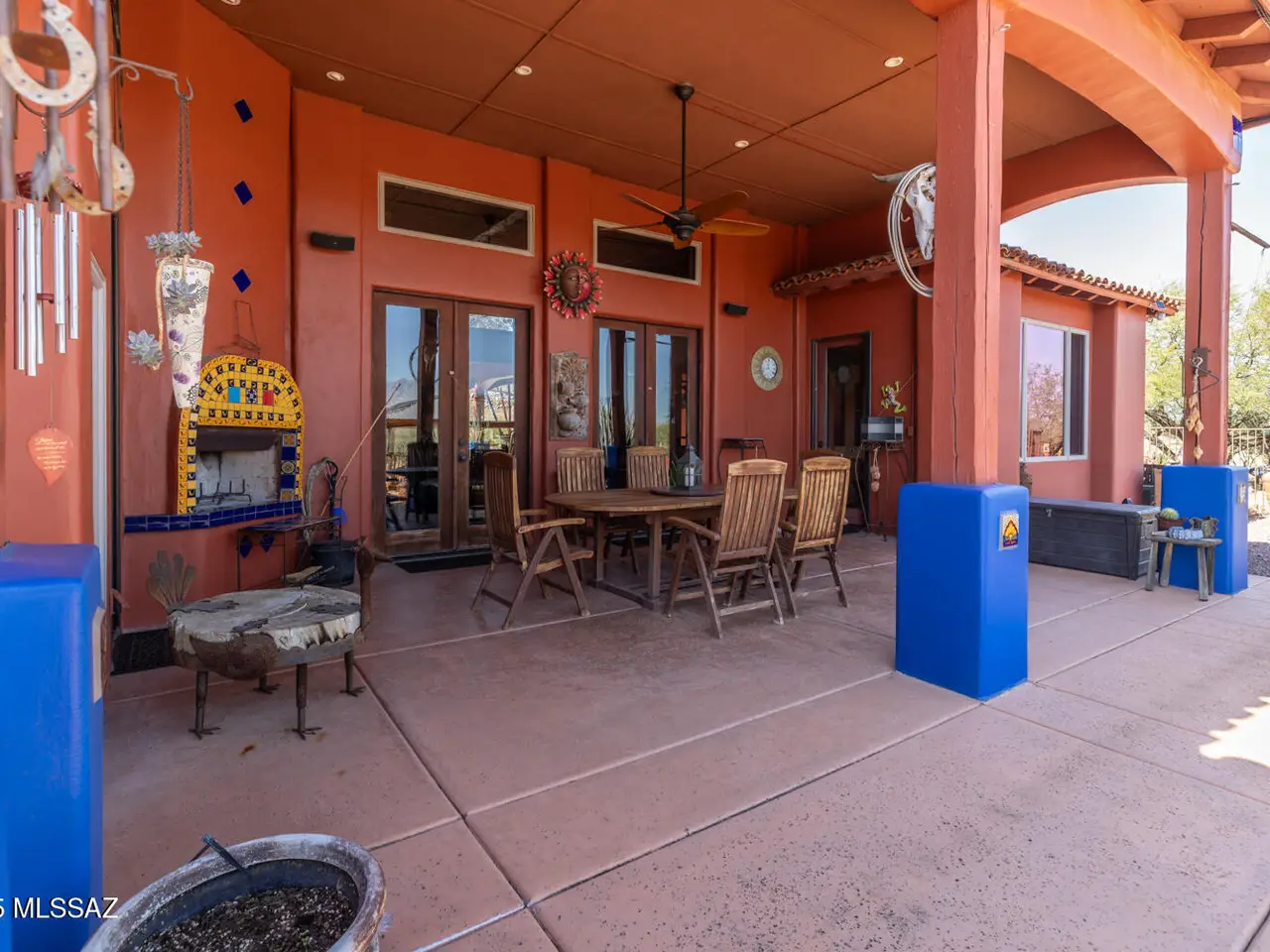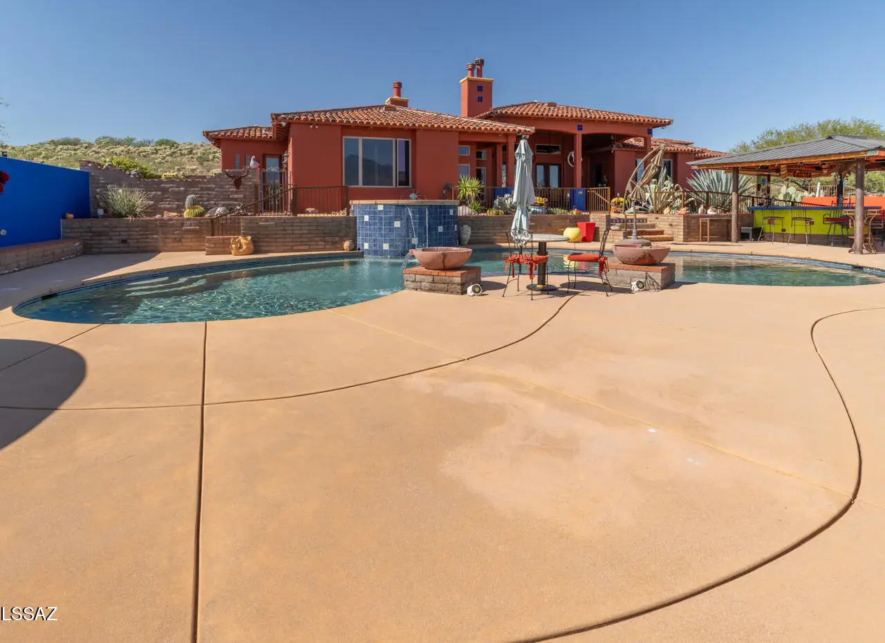 Nestled in a quiet, gated, non-HOA community sits a custom-built home on 3.77 acres boasting exceptional architectural details and modern amenities. The property is surrounded by majestic mountain ranges and desertscapes.The main house consists of rooms that are thoughtfully designed to maximize comfort and functionality. It includes two large bedroom suites, each with separate shower and jetted tub. The main bedroom has a fireplace and sliding doors which lead to the private patio and fountain. Its bathroom includes dual sinks, a vanity, roman shower and walk-in closet. The large open living room has a kiva fireplace, beamed ceiling and windows looking out to the pool and mountains. The kitchen features a large mesquite center island and newly refurbished mesquite countertops,