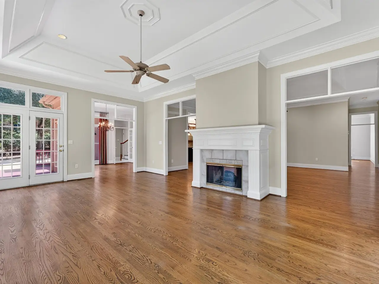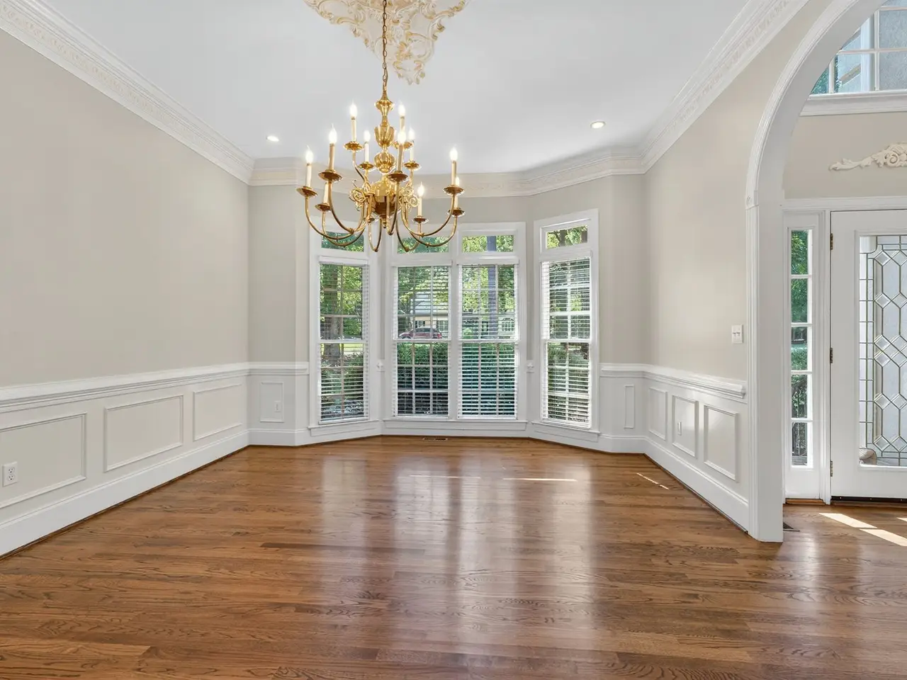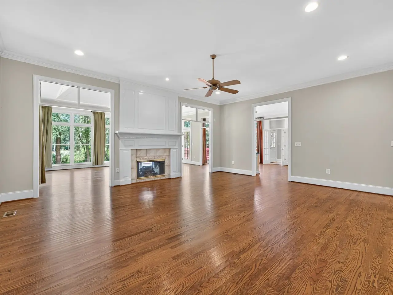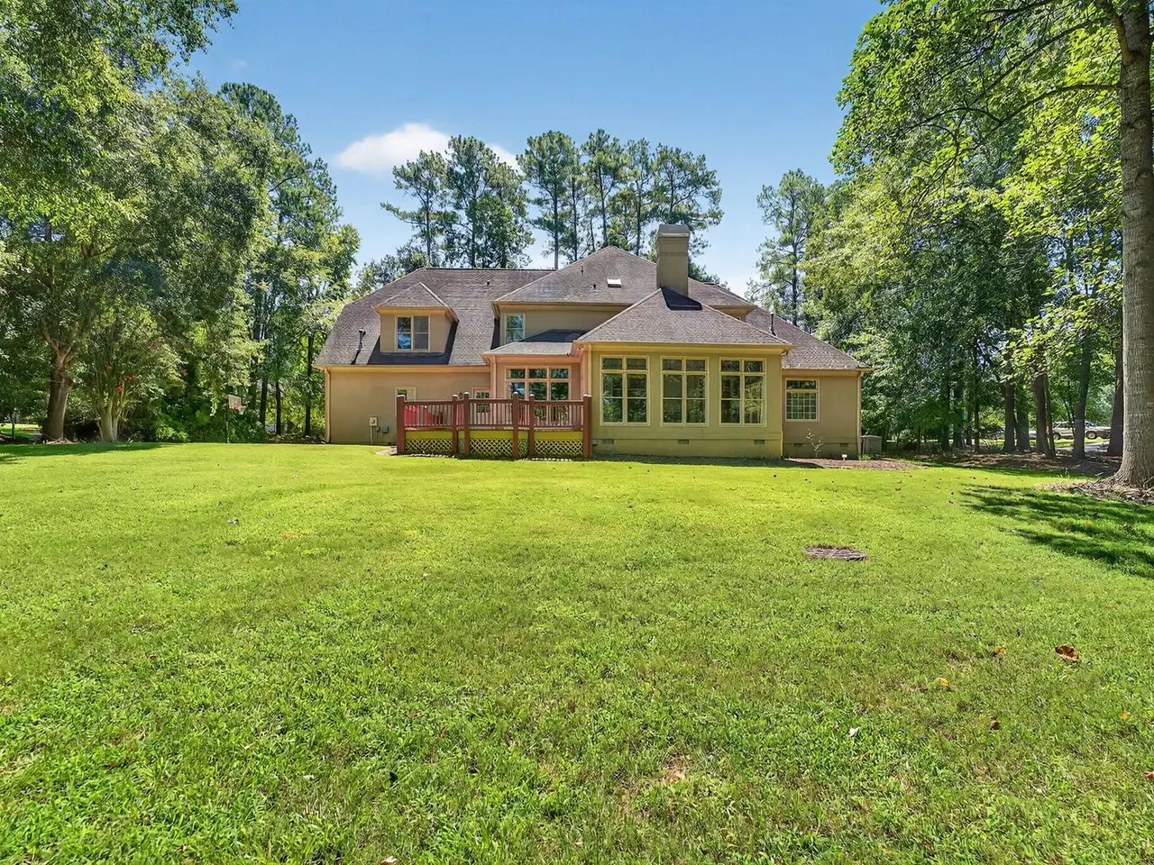 Welcome to refined luxury living in the prestigious Carolina Country Club! Nestled within a gated and 24/7 guarded community, this exceptional 5-bedroom, 4.5-bath estate offers over 5,000 square feet of timeless elegance, perfectly positioned along the 13th hole of the golf course. Step inside and be greeted by gleaming hardwood floors and a grand, open layout. To your right, a stately dining room easily accommodates 12+ guests, ideal for hosting unforgettable dinner parties. To the left, a cozy den offers the perfect setting for a private library or your Baby Grand piano. The heart of the home unfolds in the spacious living room, where a double-sided fireplace connects seamlessly to the light-filled sunroom. With soaring ceilings and walls of windows, the sunroom opens to a deck that overlooks the rolling fairways an ideal backdrop for entertaining or quiet relaxation. The expansive kitchen is a chef's dream, featuring granite countertops, stainless steel appliances, abundant cabinetry, and generous prep space for all your culinary creations. The main-level primary suite is a true retreat, complete with dual walk-in closets and separate his-and-hers bathrooms for the ultimate in comfort and privacy. Upstairs, you'll find four additional bedrooms, including two with en suite bathrooms and two sharing a convenient Jack-and-Jill bathroom. An office with built-in bookcases provides the perfect work-from-home environment. Above the extended three-car garage, a spacious recreation room awaits perfect for a pool table, game nights, or a workout studio. A set of back stairs offers easy access to the kitchen and rear entry, enhancing the home's thoughtful design. Living here means more than owning a beautiful home?it's a lifestyle. Enjoy golf, tennis, pickleball, swimming, fine dining at the Clubhouse, wine tastings, and a vibrant social calendar?all within your own neighborhood. This immaculate property combines classic sophistication with modern comfort, making it a rare opportunity in one of the area's most sought-after communities. Schedule your private tour today and experience Carolina Country Club living at its finest!