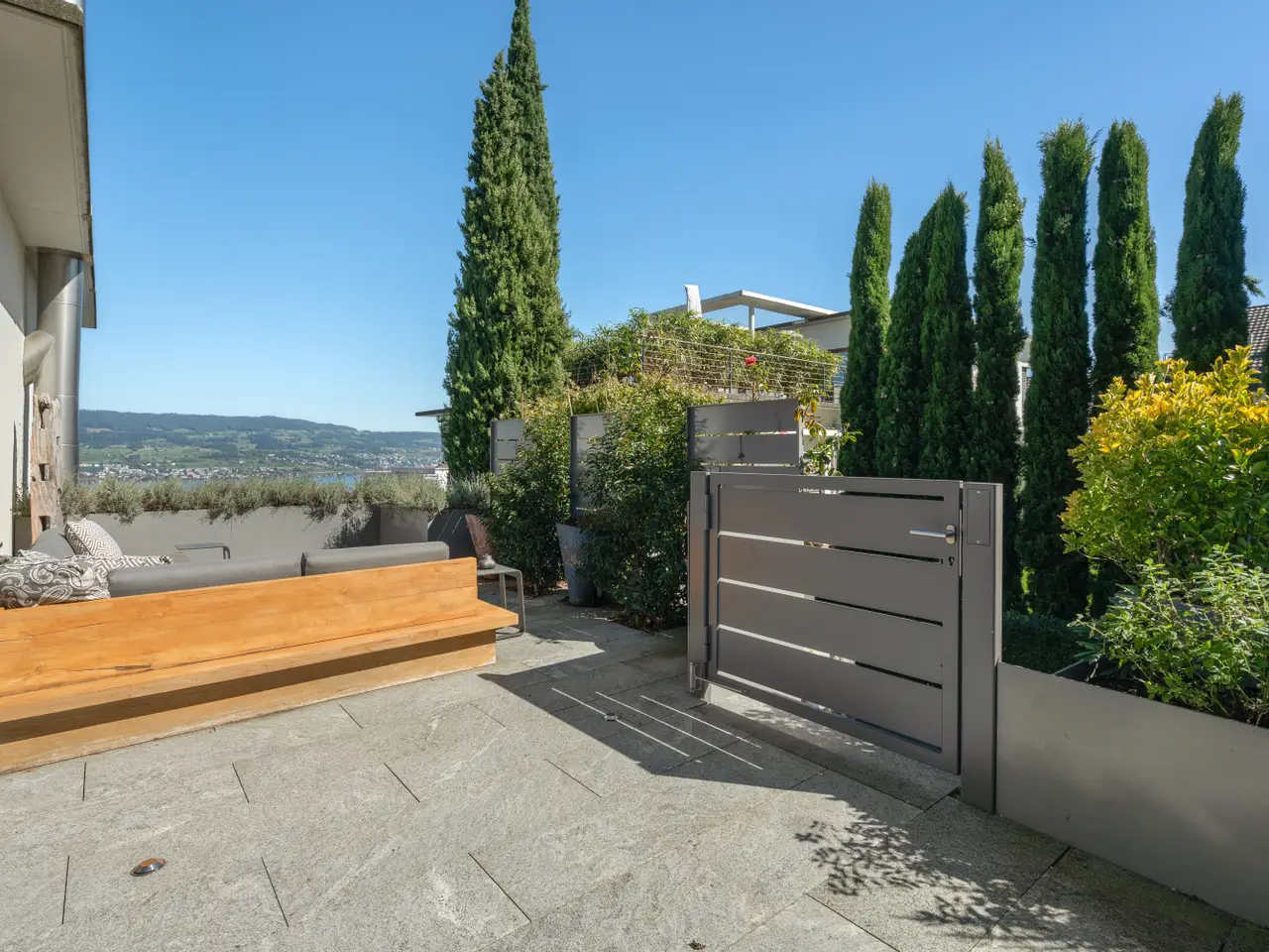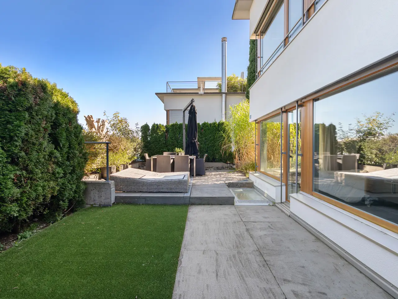 This luxurious 6.5-room semi-detached villa in Horgen combines timeless architecture, state-of-the-art technology, and an incomparable sense of living – featuring breathtaking panoramic views over Lake Zurich and the surrounding mountains. Here, design, privacy, and quality of life come together in perfect harmony – a home for those who appreciate aesthetics, space, and comfort. With a net living space of approximately 292 m² spread across three floors, the home offers room for individuality, comfort, and style. The spacious living and dining area with its fireplace opens harmoniously onto the terrace, creating a seamless transition between indoor and outdoor living. Every detail of this home reflects an uncompromising commitment to quality and design. Premium materials, refined details, and cutting-edge home technology define the concept. Each room has been carefully planned – from the open designer kitchen to the bright bedrooms and the elegantly appointed bathrooms. The interior design combines comfort with understated aesthetics, creating a sense of calm sophistication.
