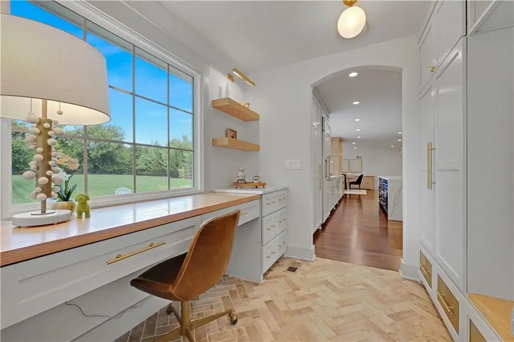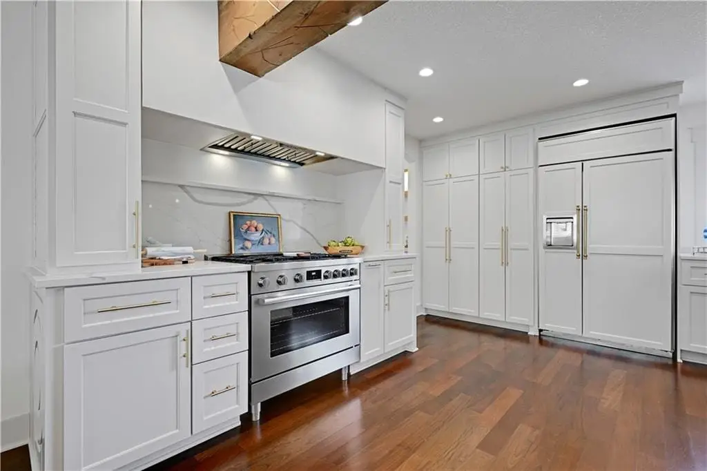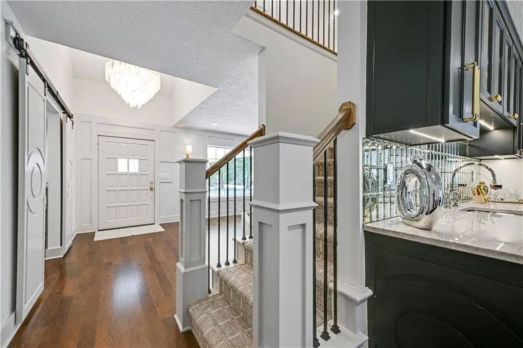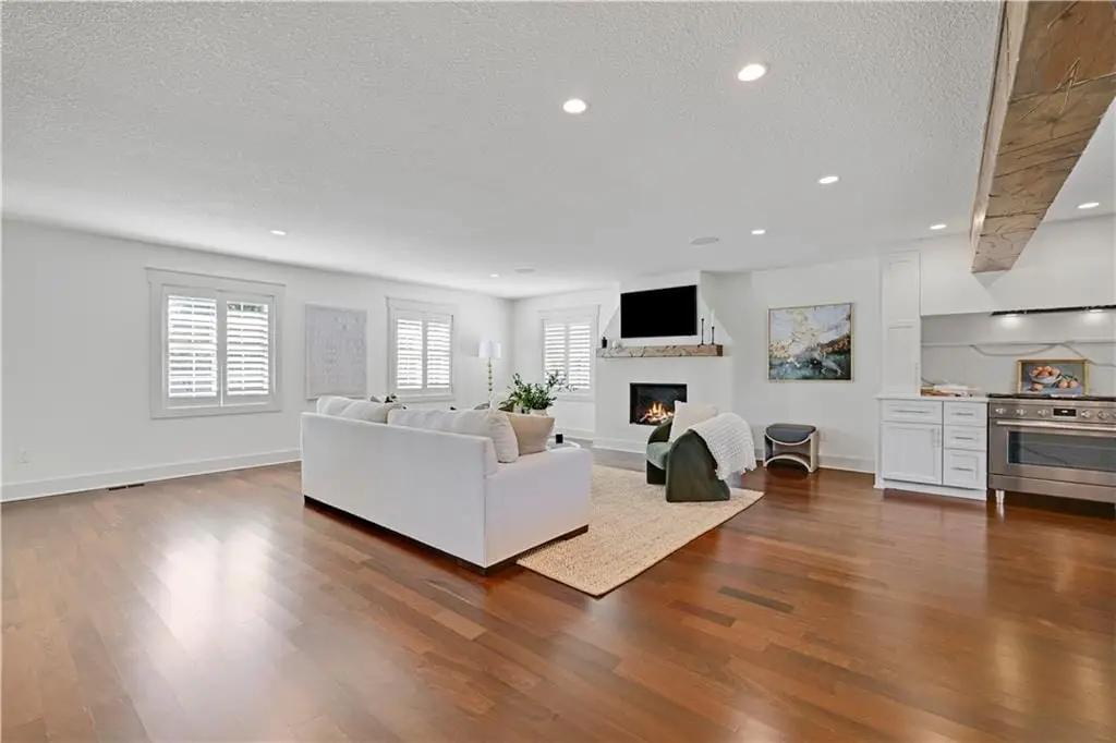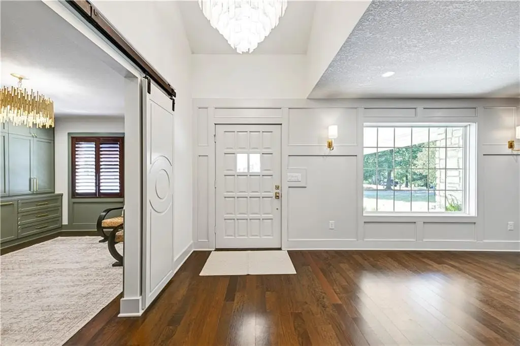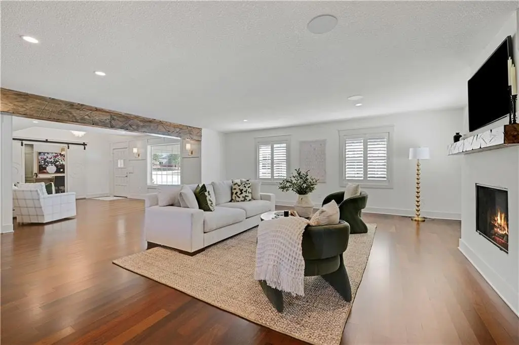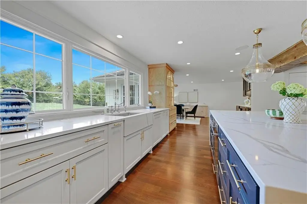 Stunning, remodeled 1.5-story estate on a beautifully landscaped corner lot spanning over 1 acre in the heart of Leawood. This home has been thoughtfully redesigned with extensive renovations, floor plan enhancements, and premium upgrades throughout. Upon entry, a formal living room and dining room, with elegant fireplaces create inviting spaces for both everyday living and entertaining. A custom wet bar with beverage fridge adds to the homes hosting appeal. The show-stopping chef's kitchen features a quartz waterfall island, top-of-the-line appliances, and an oversized window overlooking the private backyard. Adjacent to the kitchen, a well-appointed mud hall includes built-in cabinetry, a desk, cubbies, connecting to the spacious three-car carriage garage. The main-level primary suite offers peaceful backyard views, two walk-in closets (one with its own washer and dryer), and a fully renovated spa-like bathroom with a private water closet. Upstairs, three large bedrooms each include ensuite bathrooms and custom closets. A second laundry room w/ washer/dryer that stays completes the upper level. High-end finishes include Brazilian hardwood floors, designer lighting, quartz and quartzite surfaces, surround sound on the main floor, and custom millwork. Major mechanical updates include a brand-new septic system, partial concrete driveway, new water heater, new sprinkler system in backyard and professional landscaping. The property is enclosed by 558 feet of 5-foot steel fencing. With the newly installed septic system, the property is now perfectly suited for the addition of a poolan ideal setup for creating your dream backyard retreat. A rare opportunity to own a fully updated, move-in ready home on a premier Leawood estate lot.