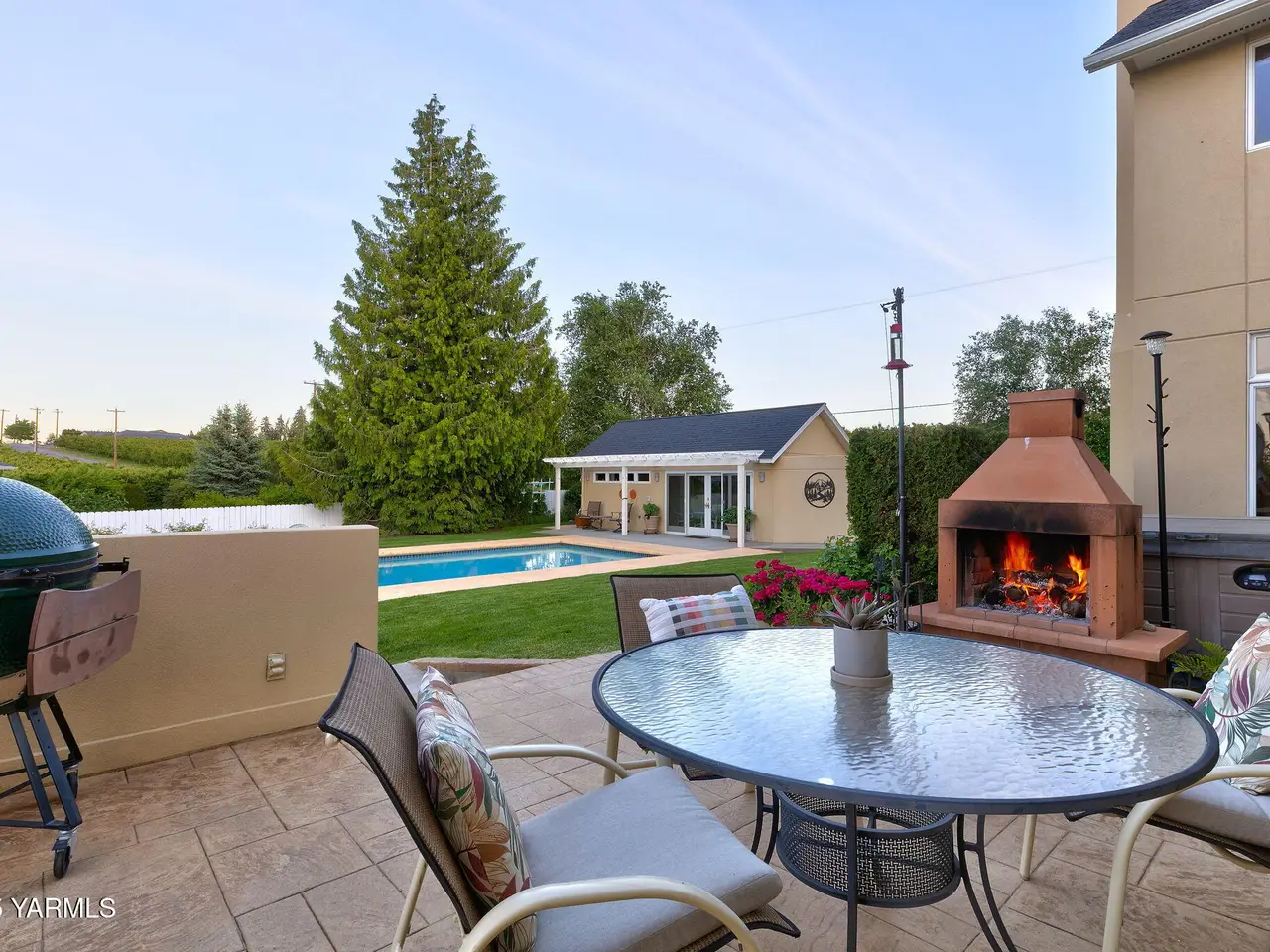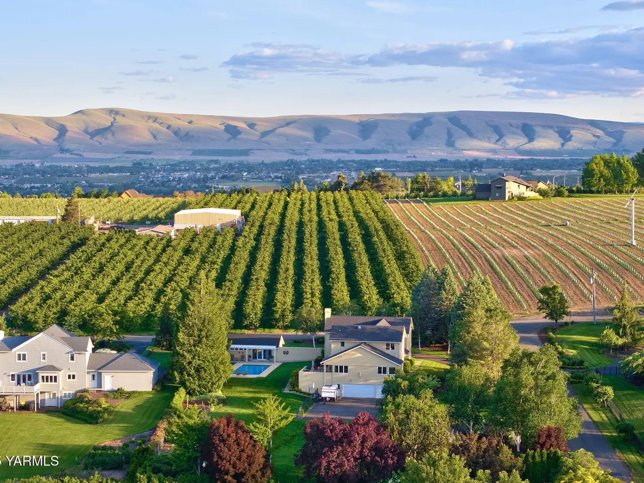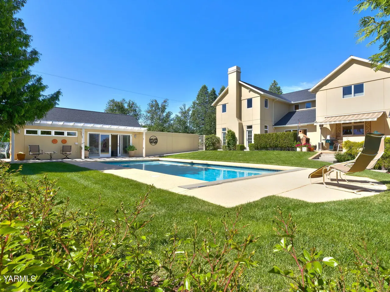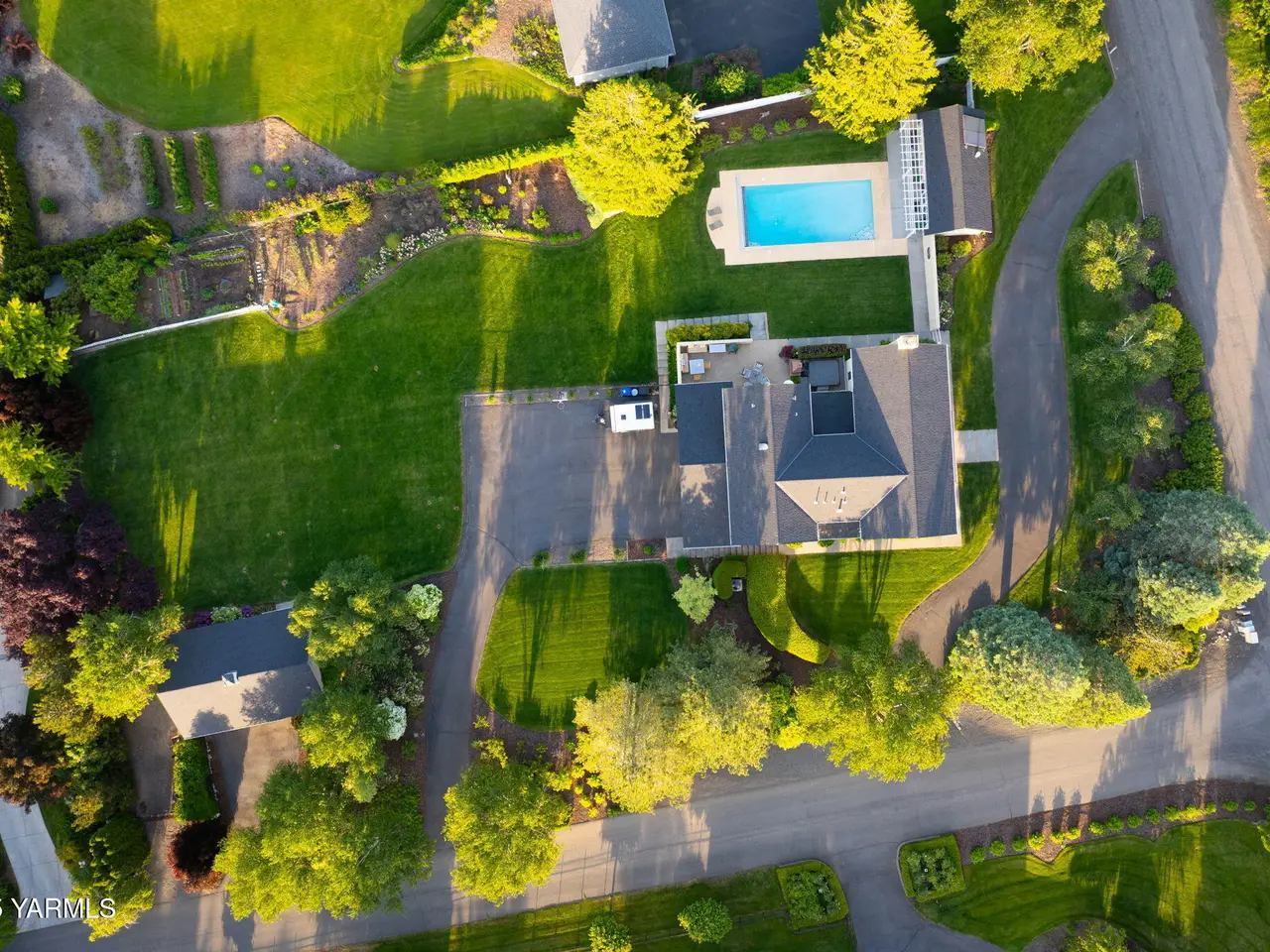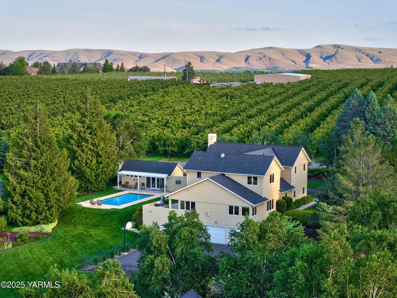 This architecturally designed one owner, custom built home crafted by Jim Sevigny and Artisan Construction, is tucked in on a private lane and set on an acre of rural scenic heaven with close and distant views from Scenic Ridge yet minutes to city life and services. It can best be described as an estate setting! You arrive on a gently curving, tree shaded driveway to the front door. Stepping inside you will be impressed by gleaming hardwood floors, graceful arches and a grand staircase that leads to the primary ensuite, 2 additional bedrooms and a conveniently located laundry room. The living room is defined by high ceilings, light-filled windows and a gas fireplace framed by a pair of window paned doors that allow direct access to entertaining and relaxing on the patio and pool area. Follow the main hallway past what is currently a very spacious two-person office/study that provides an option to repurpose for your own use and enjoyment if desired. Nearby is an ensuite bedroom designed with curb-less shower and wall hung sink which can be used by all family members and guests. The dining area is generous and can accommodate many diners comfortably. The heart of this home is the spacious gathering room with high ceilings warmed by a gas fire stove in the informal eating area and a chef's kitchen with high end counter tops and cabinetry, newer appliances including an induction range, pantry cabinet and direct access to the patio and deck. Meal prep is enhanced by soothing views of orchards and hills beyond. Step outside onto the patio for relaxation and entertaining which is enhanced by the retractable awning, wood burning fireplace, availability of natural gas for barbecues and hot tub overlooking the sparkling inground swimming pool with powered retractable cover and adjoining cabana all overlooking, in cool comfort, the sweeping views of manicured lawn and flower gardens.