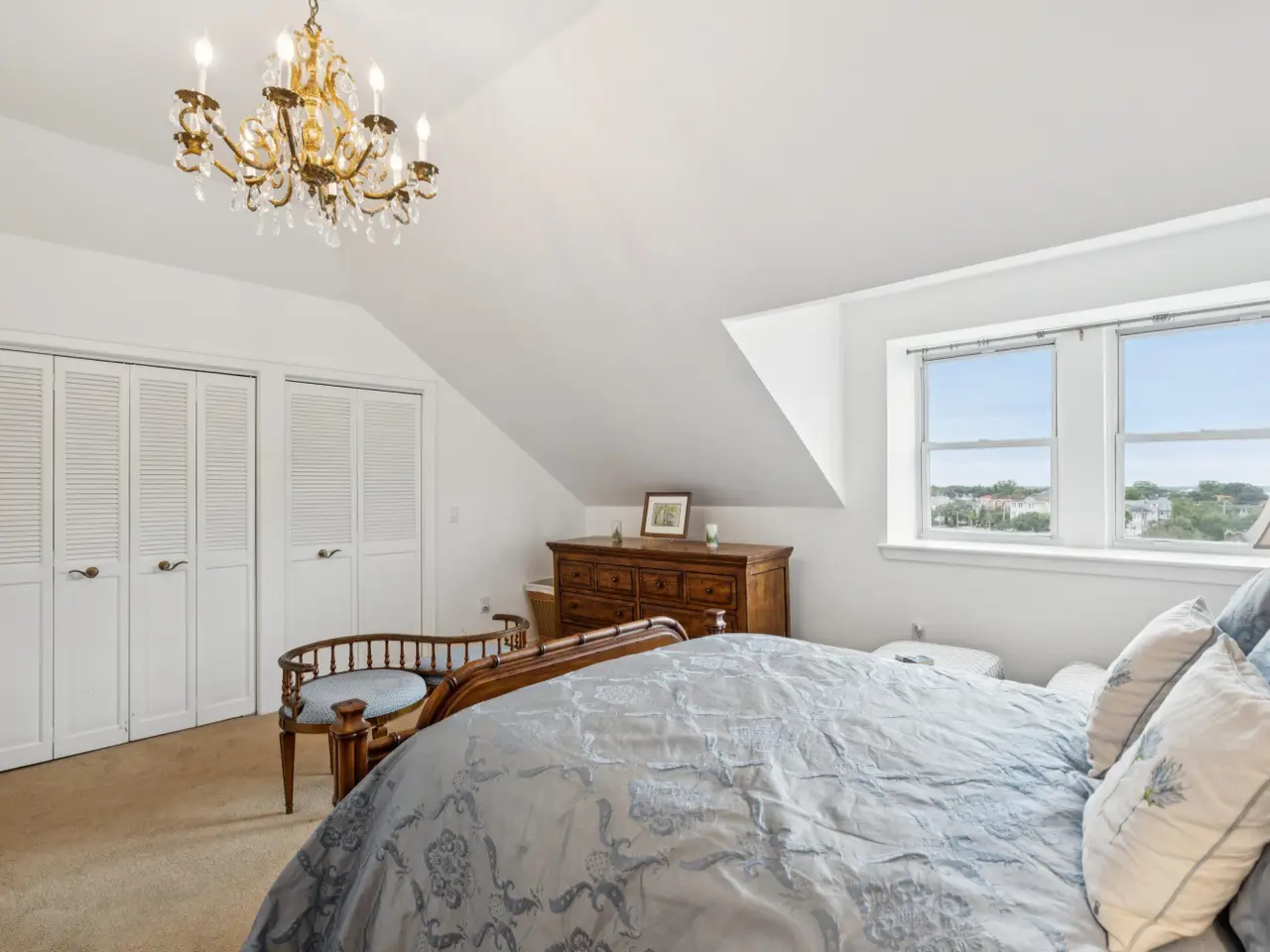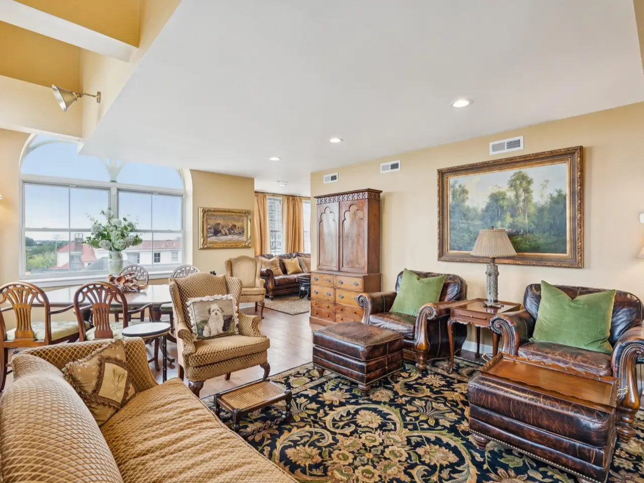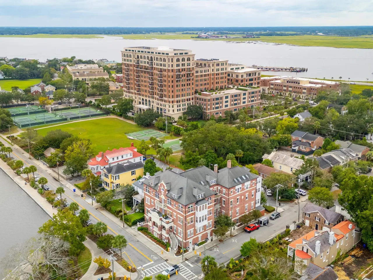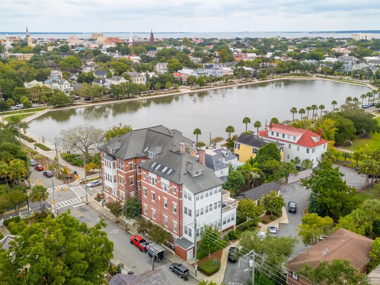 Experience breathtaking views stretching from the Ravenel Bridge to The Jasper on Broad Street from this unique, top floor, corner condominium at the historic Baker House overlooking Colonial Lake. Enjoy passive, park life and interesting wildlife, spectacular sunrises silhouetting the Charleston skyline in the mornings and colorful sunsets reflecting in the many windows of The Jasper and on the lake in the evenings. Built as a private hospital in the early 1900s, Baker House was converted into condominiums in the early eighties and Number 18 was renovated in 2021 and named ''Seven Spires''. The first level boasts three huge, Palladian style windows that showcase the panoramic vista from the living and dining area, beautiful wide plank flooring, a galley kitchen and half bath. This levelalso includes a large beverage bar with a wine cooler, coat closet and additional space separating the living area and kitchen for use as a media room, office or smaller dinette. Three bedrooms and two full bathrooms comprise the second level with unusually ample closets throughout. No storage issues here! The spacious, primary bedroom features a tiled, en-suite bathroom with a large shower and quartz countertop. The other two bedrooms are generously sized as well with skylights that enable one to sleep under the moon and the stars! A second, large, tiled bathroom with a combination tub and shower and quartz countertop is located off the hallway just a few steps from both bedrooms. Moultrie Park, a large, active park offering sports such as tennis, pickleball, and basketball, abuts the large, private parking lot for Baker House residents. Restaurants within close walking distance include The Alcove Market, Costa and Circa 1886. The Crosstown (Highway 17), connecting to all points north, east and west, is a three minute drive. This offering is an exceptional opportunity to live in an historic building, Baker House, in an historic neighborhood, Harleston Village, on the quiet, residential side of the peninsula and to enjoy fabulous views of Charleston above the tree tops! Chandeliers do not convey.