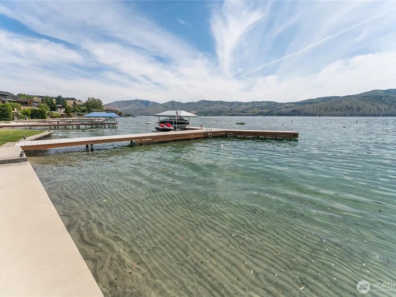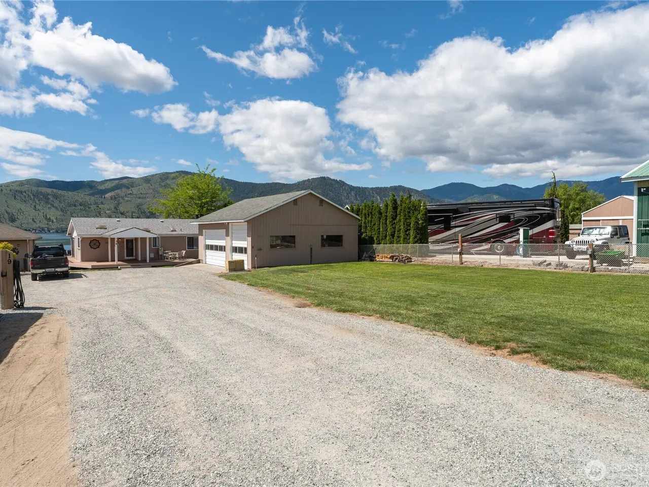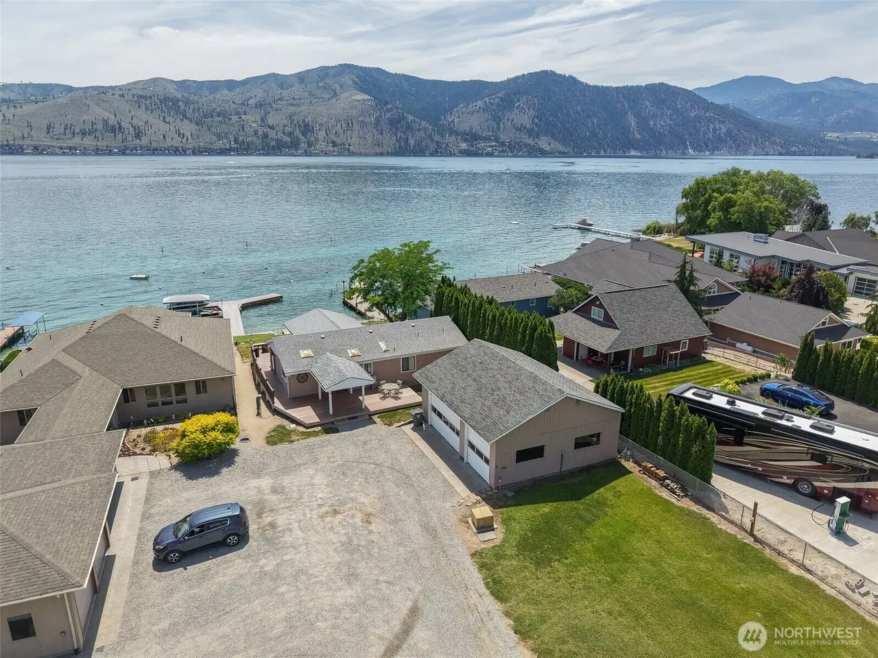 Welcome to 34 Leisure Lane! This rare .9-acre property boasts 56 feet of low bank waterfront with a concrete bulkhead and stairs to a sandy beach. Enjoy a resurfaced shared dock and a stunning, newer lake-facing deck off a charming three bed, two bath, 1,300 square foot home. Two lots (front and back) offer exceptional flexibility and space, including a three-bay shop, four RV hookups, and tons of parking. Mostly flat with a gentle slope - perfect for outdoor living and future development/building. Prime location with easy, level access off a paved road. On sewer, with LCRD domestic water and irrigation. One of the nicest stretches of real estate on Lake Chelan & amongst some incredible new homes and remodels. House plans by Complete Design can be included!