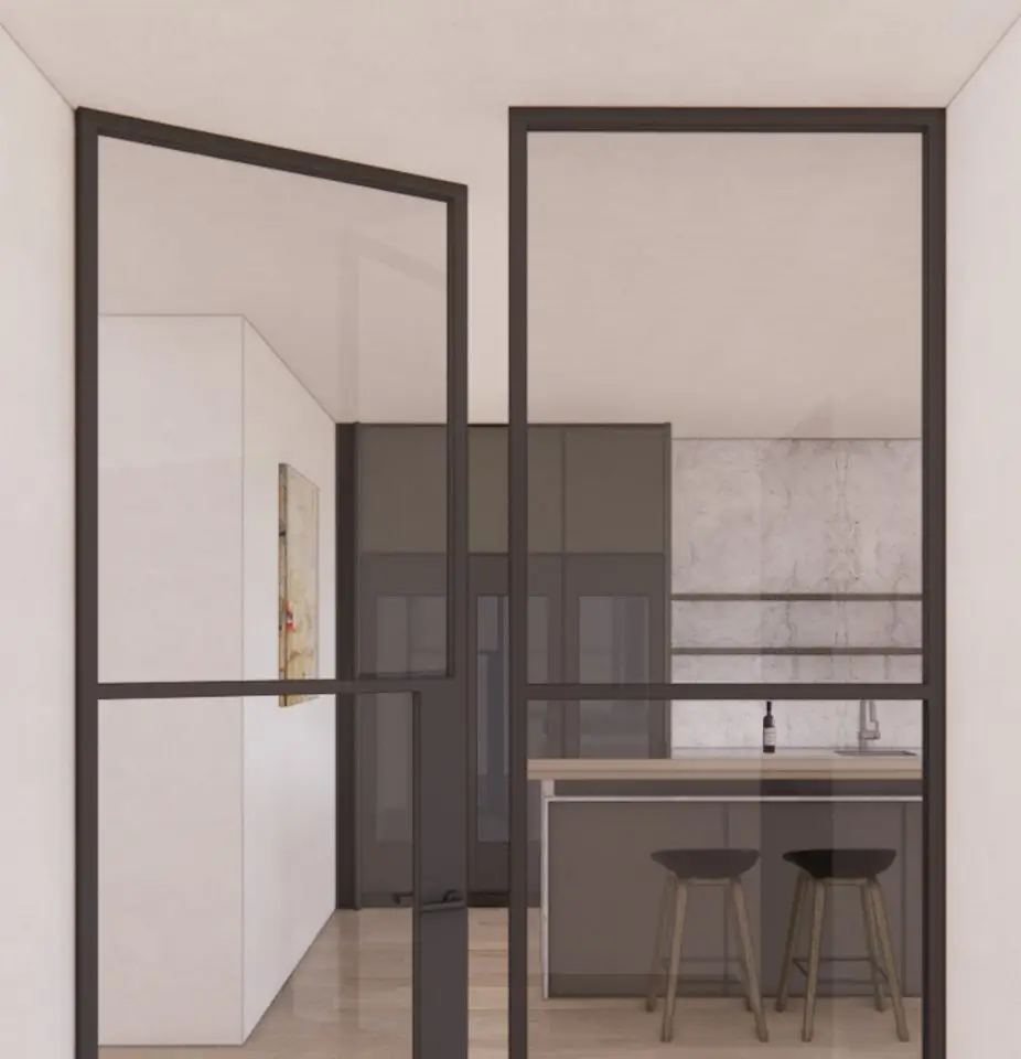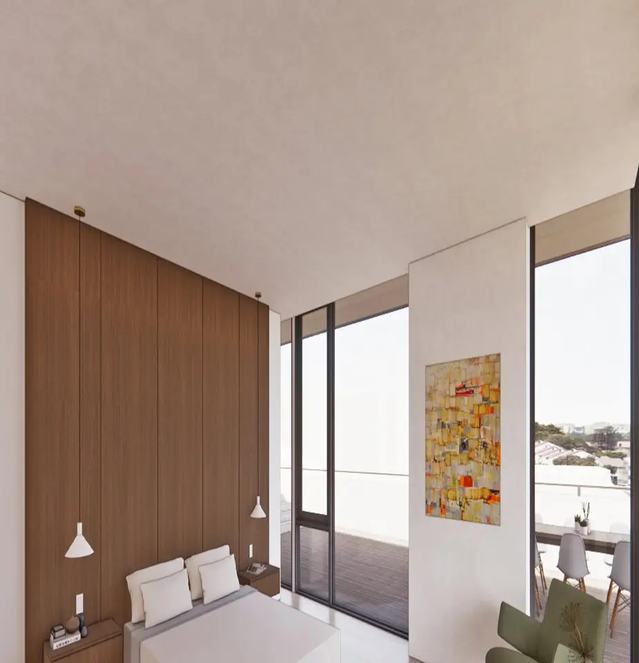 • Floor-to-ceiling windows with city skyline views
