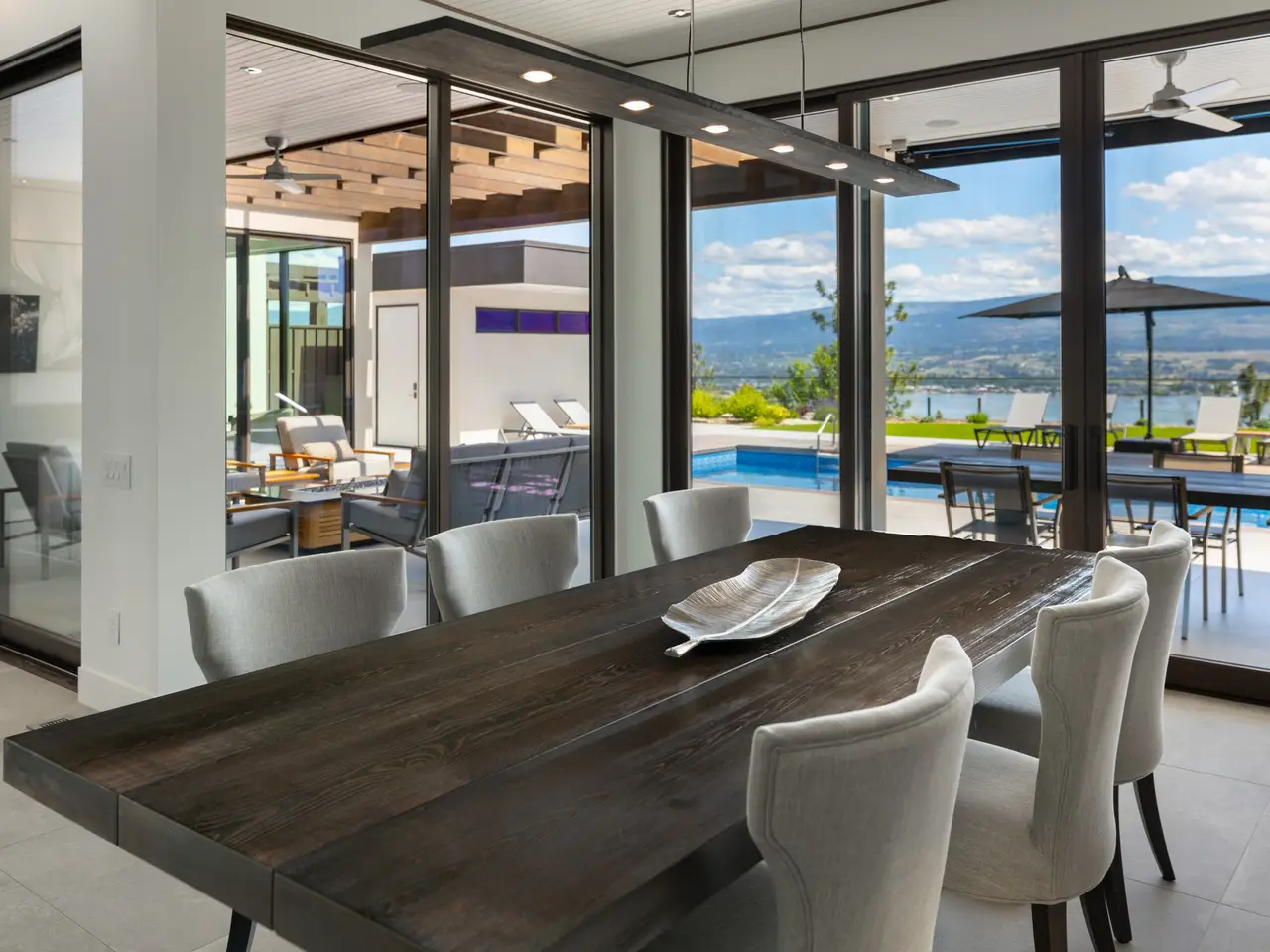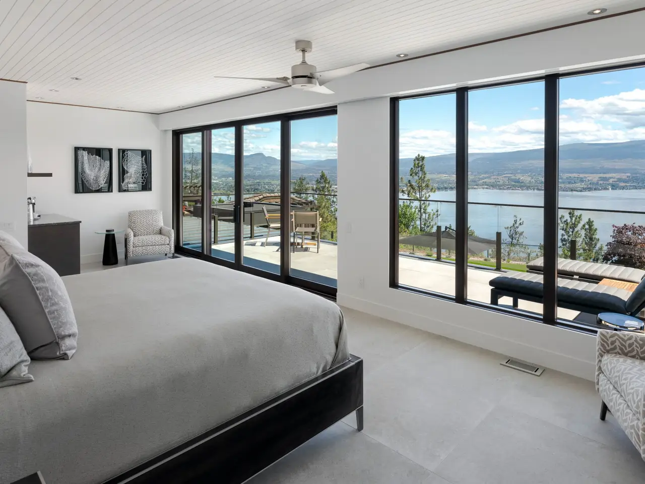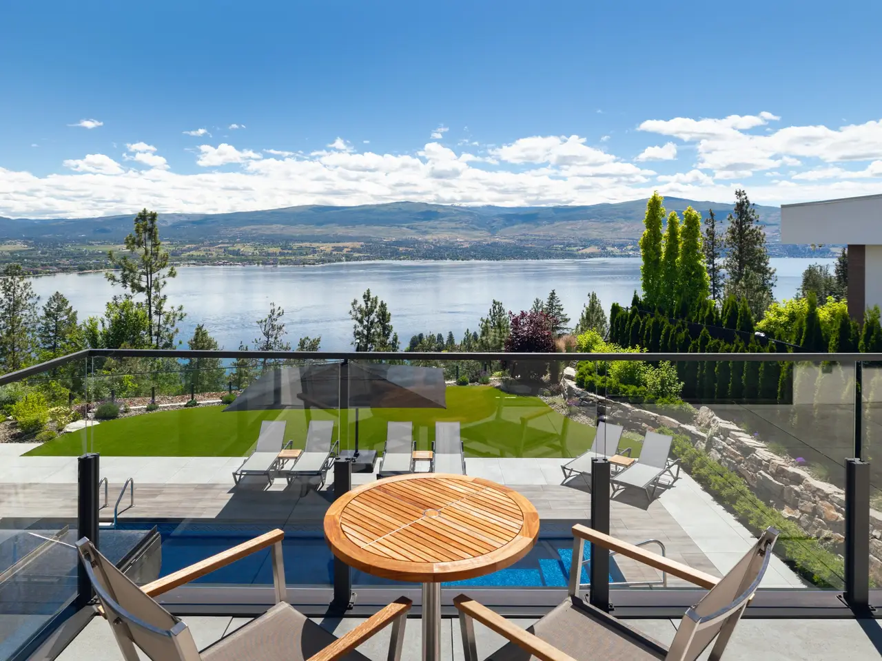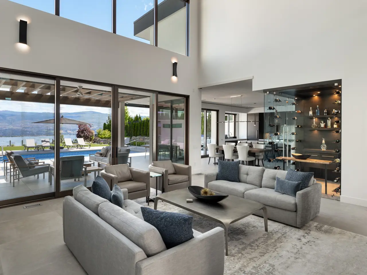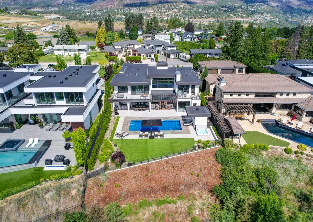Listed by Unison Jane Hoffman Realty | Custom SanMarc home on desirable Thacker Drive in Lakeview Heights. This property boasts exceptional attention to detail that is sure to impress. Expertly designed, it offers a remarkable layout inside & out for everyday living while maintaining its allure as a modern masterpiece. From nearly every room & the backyard, enjoy expansive, unobstructed Okanagan Lake views. A solid wood 12-ft pivot door welcomes you to the foyer with a 20-ft marble tiled entry wall leading to the catwalk on the 2nd level, connecting the 2 wings of the home. The great room boasts 23-foot ceilings, floor-to-ceiling windows, & an 80-inch linear gas fireplace. Gourmet kitchen with Carolyn Walsh-designed cabinetry, waterfall edge island, professional appliances & a window that fully retracts, creating a passthrough to the outdoor kitchen. Glass-enclosed 75+ bottle temperature-controlled wine room. Sliding doors on the main level open to a remarkable outdoor retreat: saltwater pool with auto cover, synthetic lawn, Jacuzzi hot tub, outdoor kitchen, $12K sound system, covered patio with glass ceiling. Luxurious main floor primary with pool access, spa-inspired 5-piece ensuite with views of the lake, heated floors, custom closet, and a linear gas fireplace. Main floor living with elevator that accesses all three floors. Upstairs offers 4 large bedrooms, all with ensuites, and 2 featuring private lake view patios. Laundry on both levels. Oversized 3-car garage with built-ins, custom cabinetry, and prewired for EV.