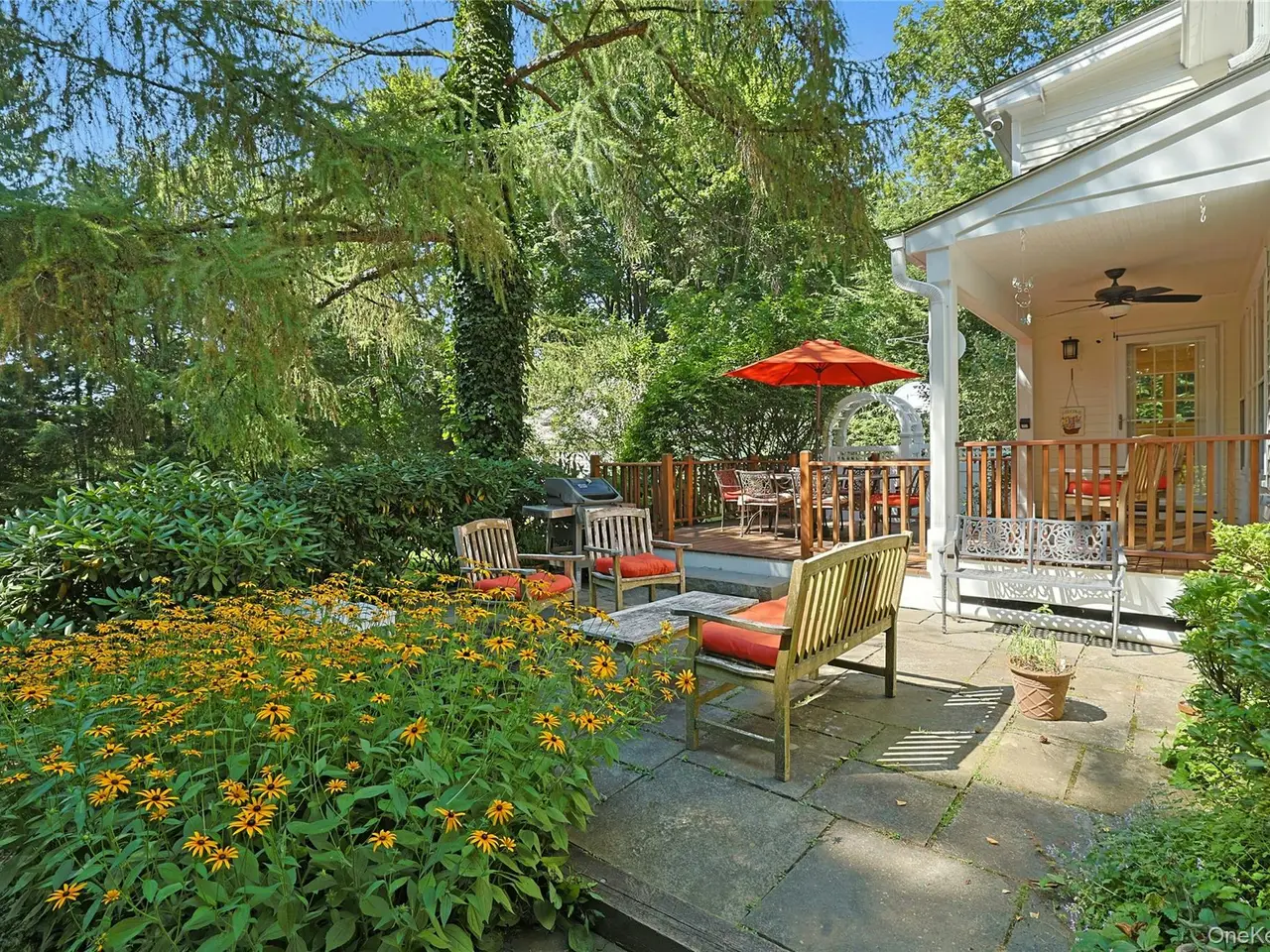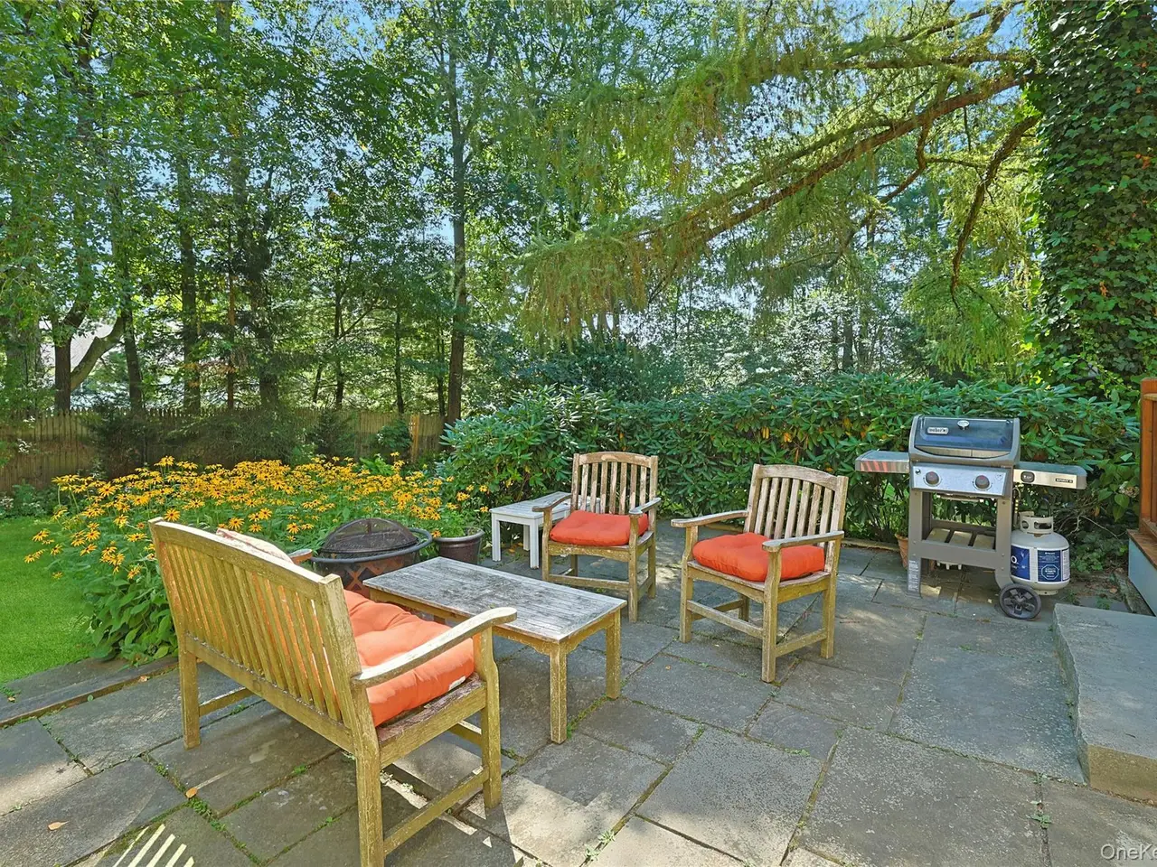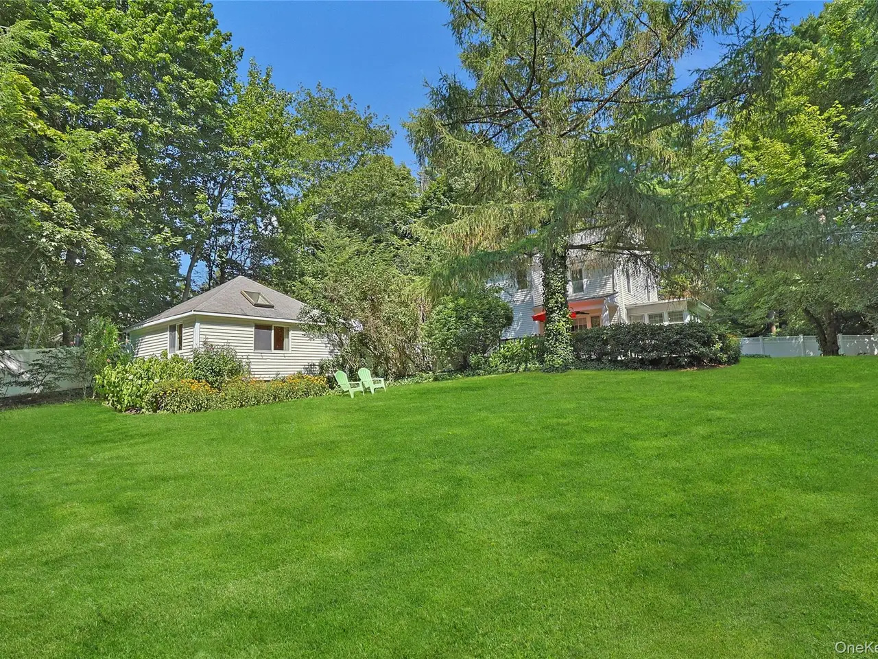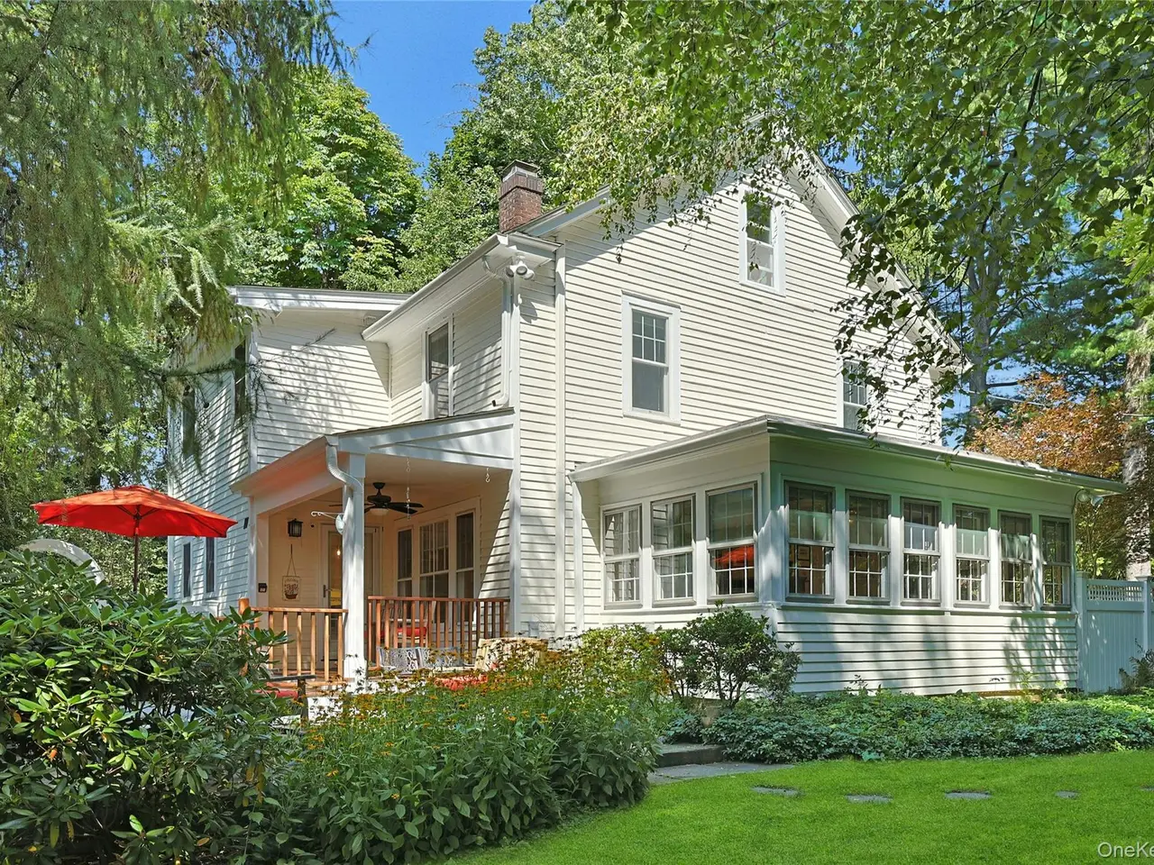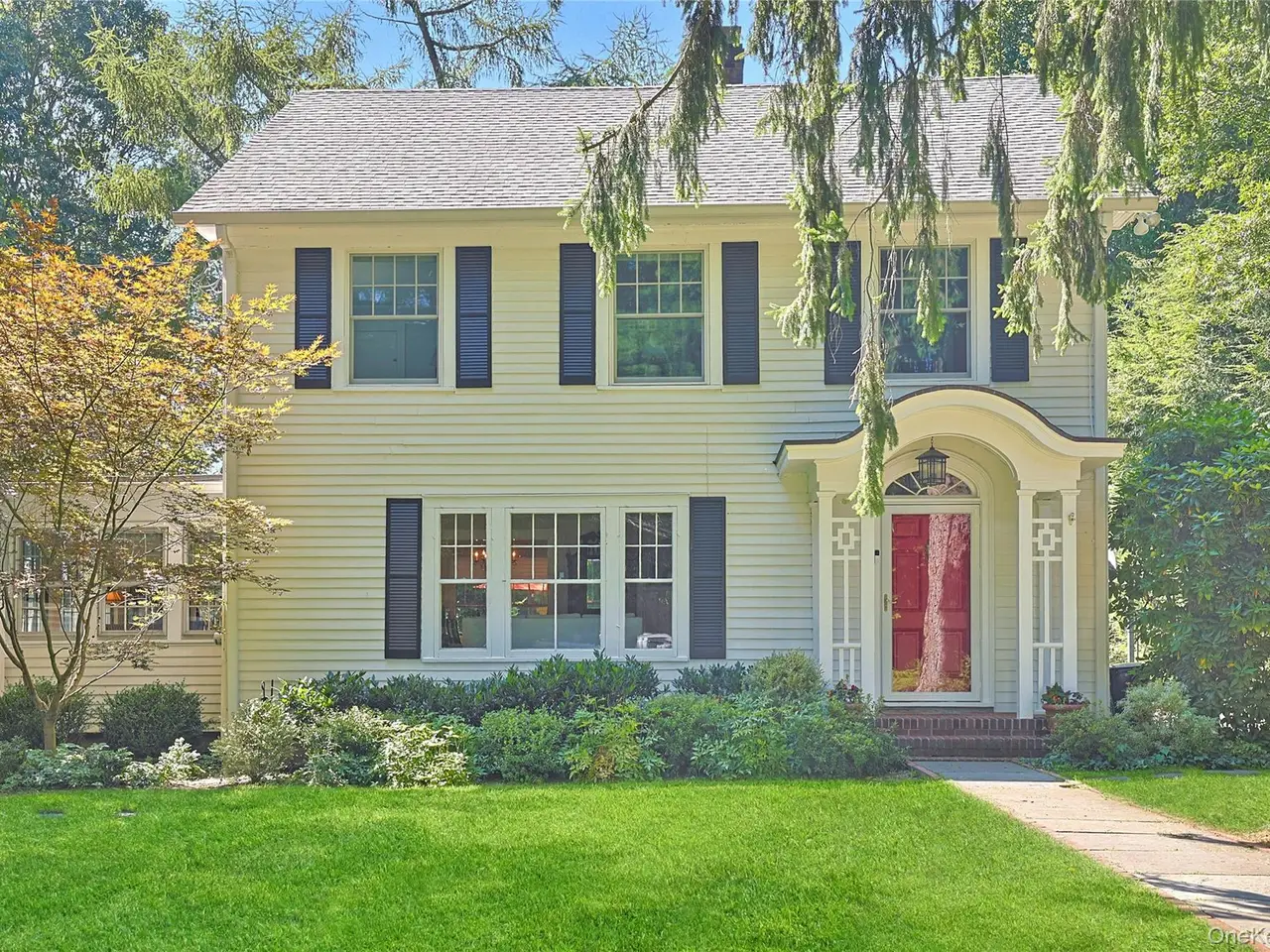 Welcome to 26 Kings Court, Chappaqua, a storybook, village Colonial enchantingly set among towering trees on a quiet cul-de-sac just a short stroll to schools, shops, town and train. If your Brooklyn brownstone could move to the suburbs, this would be it. Regal, barrel-vaulted front portico. Welcoming front entry. French doors introduce the gracious front-facing living room warmed by morning sun and a wood-burning fireplace and accented with built-in cabinetry and hardwood flooring. Adjoining is a traditional formal dining room with chair-rail molding and hardwood flooring. Afternoon sunshine streams into the wonderful white, designer kitchen outfitted with high-end, stainless-steel appliances from Wolf, Sub-Zero and Bosch, and anchored by a large center island with striking butcher block top and breakfast bar. A French door to the deck makes for easy BBQ and alfresco dining. Retreat to the coziness of the sunroom, illuminated by natural light on three sides. Comfort abounds throughout the four, upstairs bedrooms, including the primary with its own sitting/dressing area and private ensuite bath, and in the updated hall bath with marble tile and shower over jetted bathtub. An unfinished, walk-up attic adds more charm and storage. The basement is unfinished and houses laundry, mechanicals and storage. A convenient side entry connects to a flat driveway leading to a detached garage with a separate studio offering flexible space for home office, exercise, or more introspective pursuits. Lush landscaping and lovely yards envelope the residence. A quintessential Chappaqua Colonial.