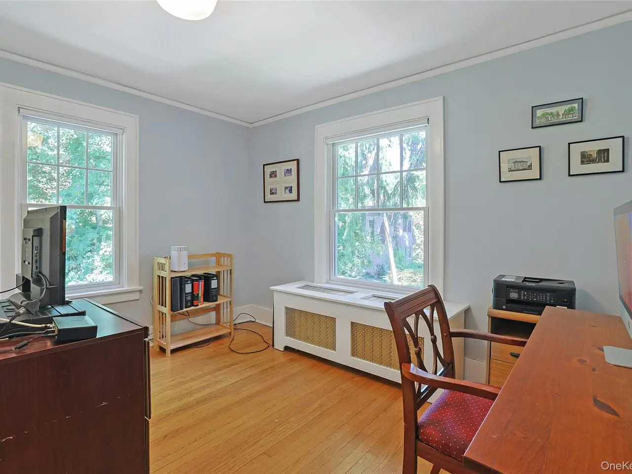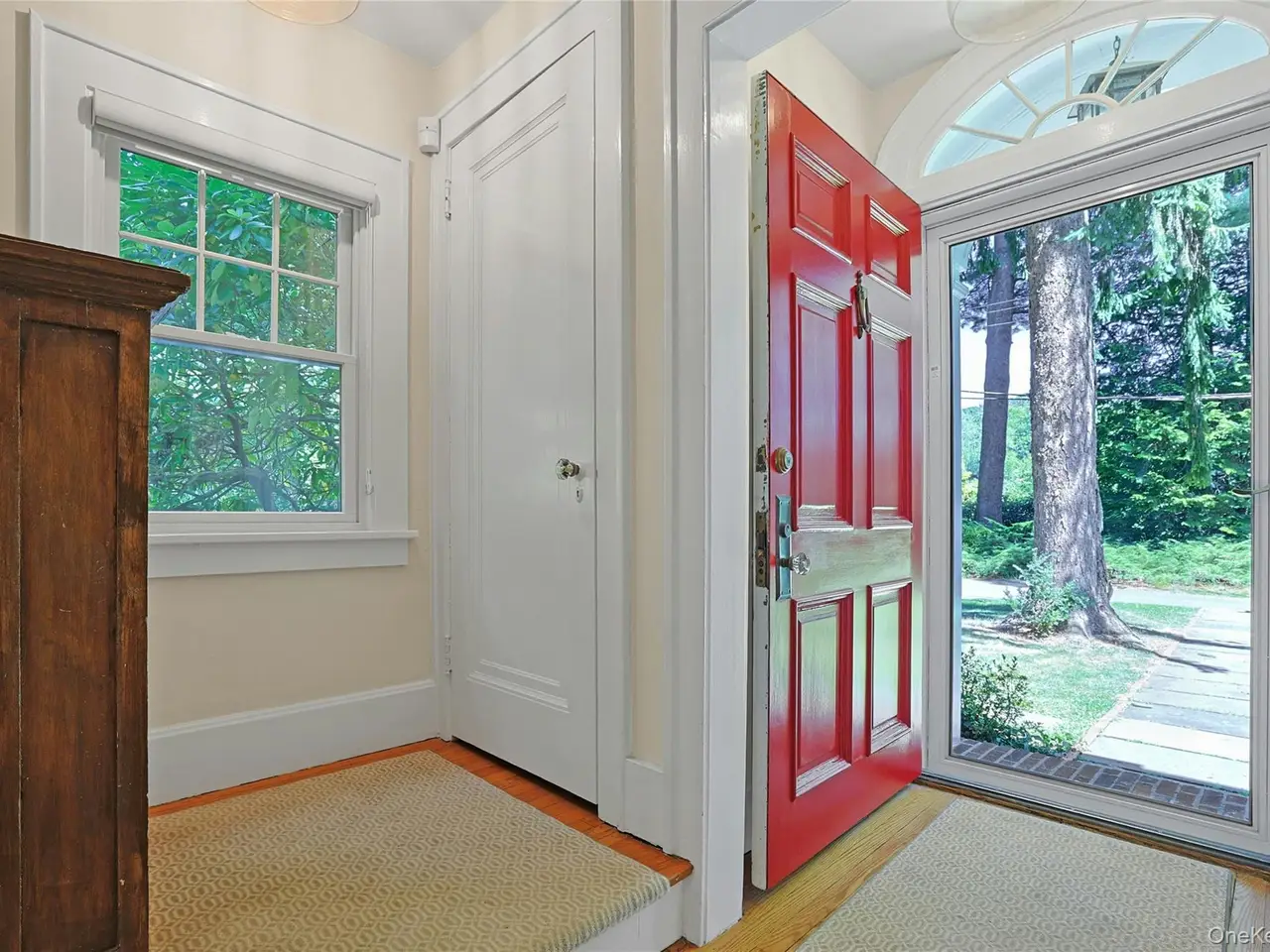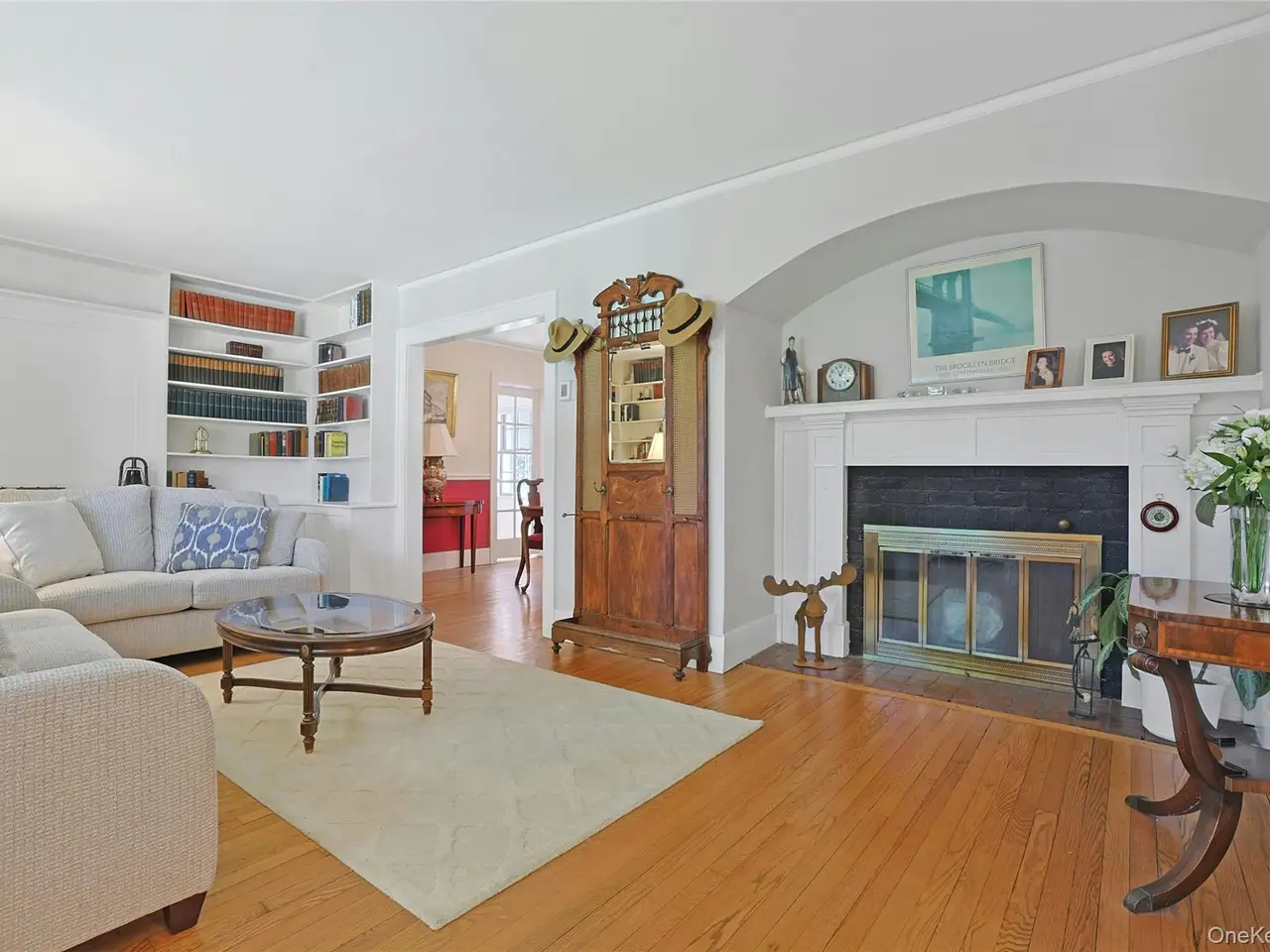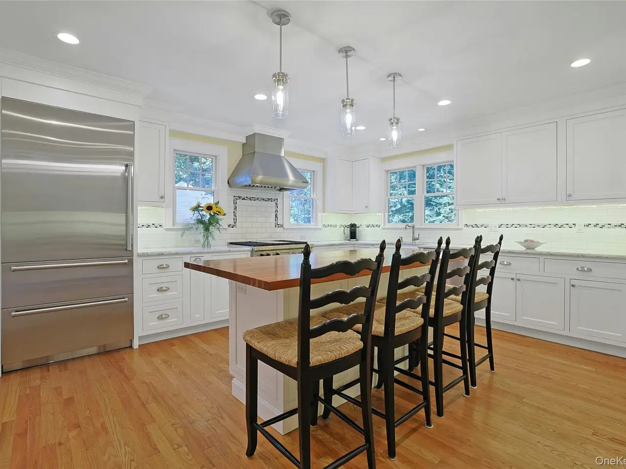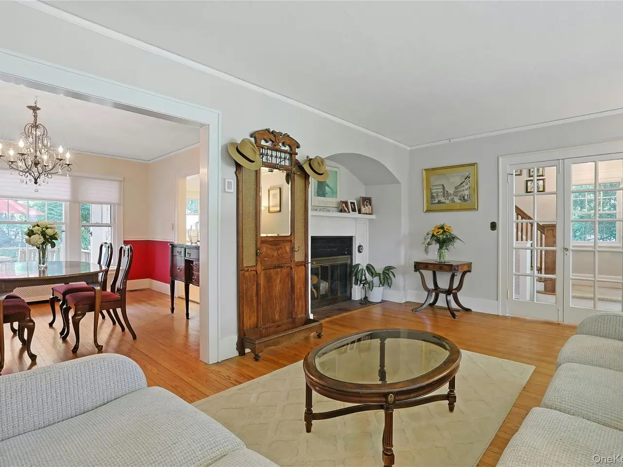 Welcome to 26 Kings Court, Chappaqua, a storybook, village Colonial enchantingly set among towering trees on a quiet cul-de-sac just a short stroll to schools, shops, town and train. If your Brooklyn brownstone could move to the suburbs, this would be it. Regal, barrel-vaulted front portico. Welcoming front entry. French doors introduce the gracious front-facing living room warmed by morning sun and a wood-burning fireplace and accented with built-in cabinetry and hardwood flooring. Adjoining is a traditional formal dining room with chair-rail molding and hardwood flooring. Afternoon sunshine streams into the wonderful white, designer kitchen outfitted with high-end, stainless-steel appliances from Wolf, Sub-Zero and Bosch, and anchored by a large center island with striking butcher block top and breakfast bar. A French door to the deck makes for easy BBQ and alfresco dining. Retreat to the coziness of the sunroom, illuminated by natural light on three sides. Comfort abounds throughout the four, upstairs bedrooms, including the primary with its own sitting/dressing area and private ensuite bath, and in the updated hall bath with marble tile and shower over jetted bathtub. An unfinished, walk-up attic adds more charm and storage. The basement is unfinished and houses laundry, mechanicals and storage. A convenient side entry connects to a flat driveway leading to a detached garage with a separate studio offering flexible space for home office, exercise, or more introspective pursuits. Lush landscaping and lovely yards envelope the residence. A quintessential Chappaqua Colonial.