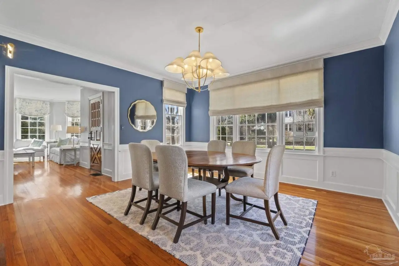 Stunning two-story Tudor-style brick pool home on a coveted corner lot in historic East Hill effortlessly blends timeless charm with modern sophistication. This updated 1937 gem offers elevated views of Pensacola Bay and an award-winning front yard that sets the stage for its character and elegance. Inside, original hardwood floors, crown molding, and impressive ceiling height speak to the craftsmanship, while thoughtful updates enhance everyday comfort. The first floor welcomes you with a spacious living room flooded with natural light, while an adjacent Florida room offers the perfect space for relaxation-seamlessly extending the home's interior living area. The heart of the home, the gorgeous remodeled eat-in kitchen impresses with KitchenAid stainless steel appliances, marbled Quartzite countertops, soft-gray shaker-style cabinetry, and a striking Arabesque lantern tile backsplash. A generous island provides ample prep space and storage, while the built-in butler's pantry, complete with a beverage refrigerator and wine cooler, ensures effortless entertaining. The first-floor study, featuring original built-in shelving and a fireplace, offers versatile use as an additional bedroom. The master suite boasts a private deck with serene water views, while its sophisticated, completely remodeled bathroom exudes luxury. A 600 sq. ft. multi-purpose room serves as the ultimate entertainment space, and the fourth bedroom-currently converted into an impressive walk-in closet-can easily be repurposed. Designed for outdoor living, the backyard is surrounded by lush landscaping, fruit trees, and a play area. The sparkling pool is complemented by brick pavers and a covered outdoor entertainment area with bar seating, and sink-all tucked away behind a stately brick wall with wrought iron fencing and accent lighting. Additional highlights include a two-bay garage and within walking distance to Publix, neighborhood dining, parks and more.