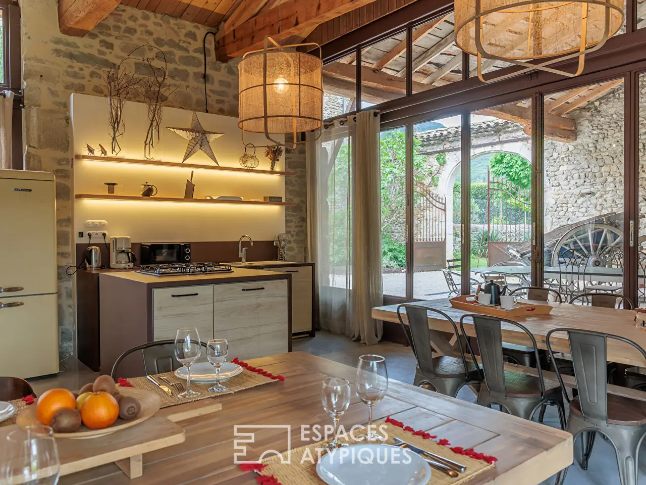 Espaces Atypiques has singled out this exclusive property for you, a timeless place nestled in the unspoilt environment of the Drome provencale. This splendid 18th-century residence is a real real estate nugget, rare for its volume, elegance and the exceptional quality of its renovation. Offering over 800 m2 of living space, it is set in 1.7 hectares of wooded parkland, with plantations of truffle oaks in production, an elegant swimming pool and several carefully renovated outbuildings, cellar and garage. How to divide spaces, organize circulation and make the most of incredible natural light? Here, the answer is found in a composition of unbridled charm, both timeless and resolutely contemporary, where the signature of the owner-architects is expressed in these vast, functional, cheerful and luminous spaces, deploying a varied chromatic palette in which you won't pout at the pleasure. Every detail has been carefully thought out, every room optimized with respect for the site and a concern for beauty. Several living units offer 11 bedrooms, 10 bathrooms, 12 toilets, 4 lounge areas and much more! All these rooms offer a refined, comfortable environment in which to welcome family, friends or guests in a warm, intimate setting. To mark the different rooms, the walls move from one color palette to another without ostentation, playing subtly with light and volume. A sumptuous main living area, comprising a large lounge and kitchen-dining area, is warm and inspiring. With its access to and view of the 10 by 4 swimming pool and spectacular inner courtyard, it lends a theatrical and convivial dimension to the whole. The art of beauty plays a key role here, between authenticity and modernity. Nothing has been left to chance. Perfect insulation, coupled with a heating system featuring a wood pellet boiler, underfloor heating and a wood-burning stove for the pleasure of authenticity, means that energy costs are kept under control and energy performance is exceptional (rated C in the DPE) for a property of this size. You know you've found the real gem. The exterior matches the interior: fully landscaped garden, large plantation of truffle oaks, vast terraces, garage of over 130 m2 , offering the possibility of workshops or complementary projects. Everything is in place to seduce, to live and entertain, or to continue an existing high-end charming gites business. This exceptional residence is also ideal for organizing events such as weddings, seminars, artistic or spiritual retreats: this property lends itself perfectly to this, in a region highly coveted for its art of living, its nature and its sunshine. A unique property, remarkable both for the magic it exudes and for the services it offers, which has been honored on several occasions in the national press, both in specialized design and decoration magazines and television publications. As soon as you step through the door, you realize that this place won't be available for long. You'll fall in love immediately, and forever. Pay us a visit! Contact Alexandra CASTELLON 06 30 64 85 15 Energy class C Greenhouse effect A Estimated annual energy costs between 3630 and 4980 euros Average energy prices indexed to 2021 / 2022 / 2023 REF. 517DA Additional information * 15 rooms * 11 bedrooms * 1 bathroom * 9 shower rooms * 3 floors in the building * Outdoor space : 17021 SQM * Parking : 10 parking spaces * 00000 co-ownership lots * Property tax : 1 192 € Energy Performance Certificate Primary energy consumption c : 161 kWh/m2.year High performance housing