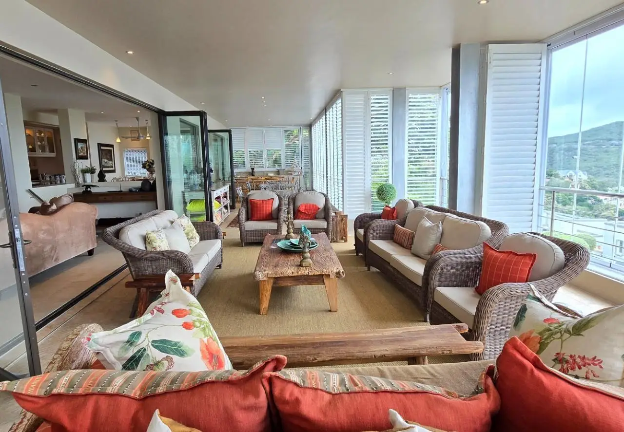 Luxurious Lagoon-Front Living: Elegant Home with Panoramic Views The property features beautifully designed bedrooms, each blending comfort with functionality to ensure a restful environment. On the ground floor, one bedroom benefits from a full en-suite bathroom, perfect for guests or family members preferring easy access. The upper level houses three more bedrooms, enhancing privacy and providing versatile living options. The master suite is particularly impressive, boasting a spacious private veranda, a large dressing room, and a luxurious en-suite bathroom. The second bedroom also features a full en-suite bathroom, while the third bedroom has access to a separate bathroom equipped with a shower. The home is designed with a flowing open-plan layout that maximizes the stunning lagoon views and creates a seamless transition between living spaces. The formal lounge, set against the backdrop of the lagoon, leads into a dining area that connects directly to a well-equipped kitchen featuring both gas and electric hobs, an eye-level oven, and a separate scullery. Adjacent to this space is a cozy TV lounge and a dedicated study, providing ample room for relaxation and work. A double garage with direct access into the house adds convenience and security. This property is not just a house but a blend of luxury, comfort, and stunning views, making it a must-see for those seeking an exceptional home in Knysna. Call today to schedule a viewing and experience the splendor first-hand! This home comes with the option of being Furnished.