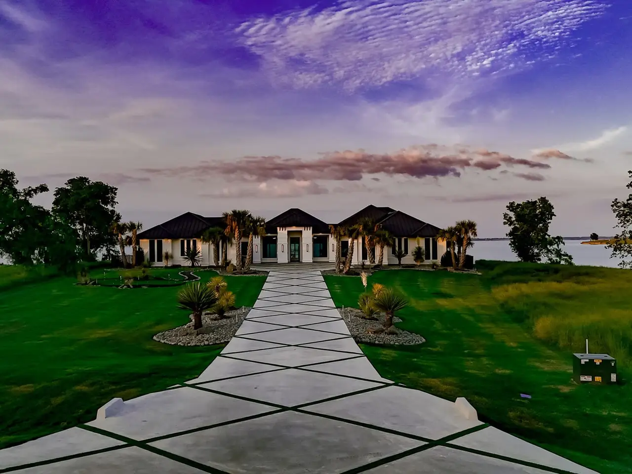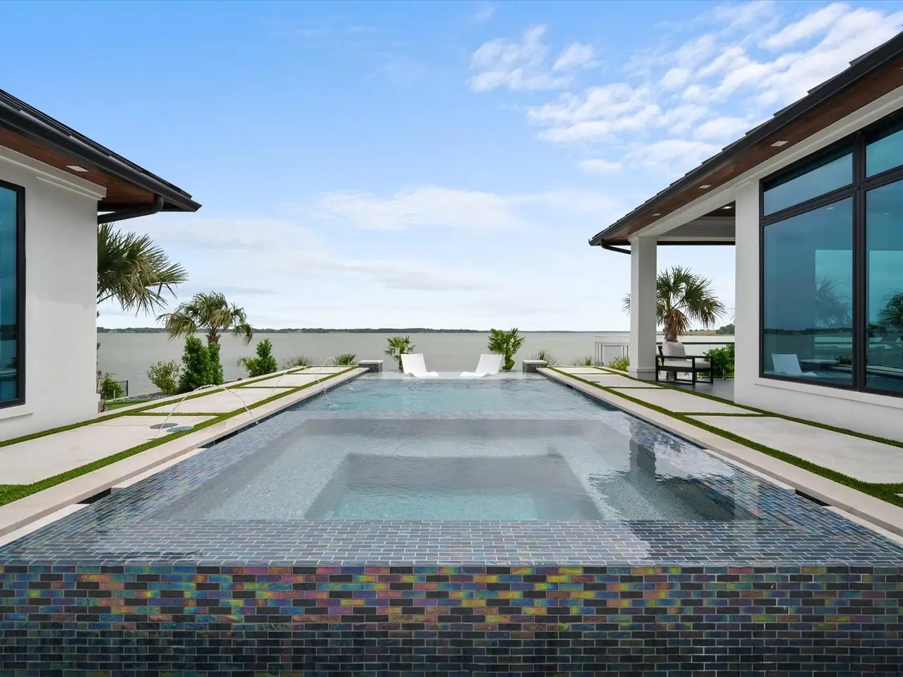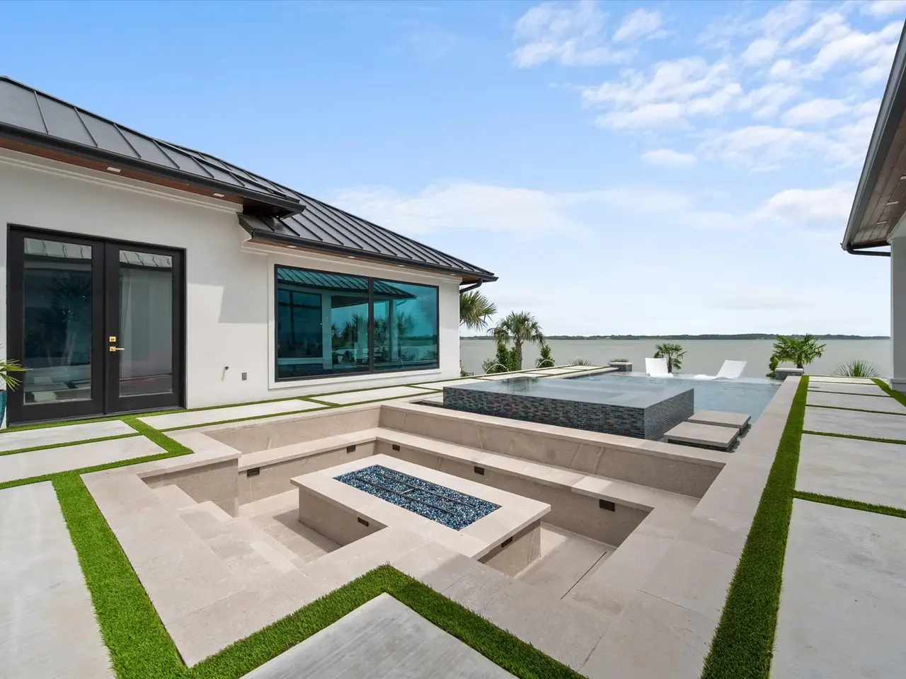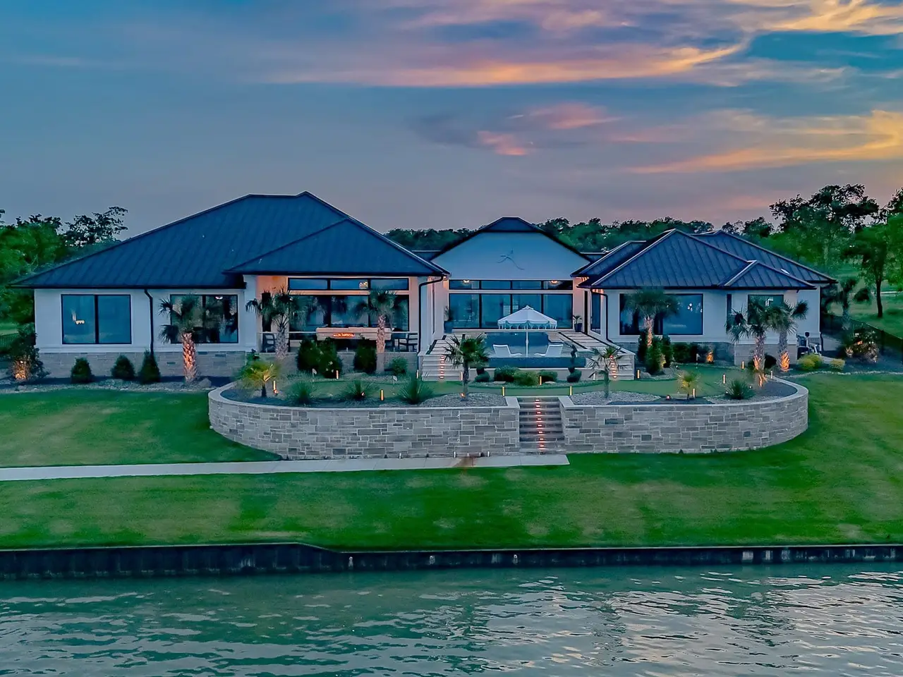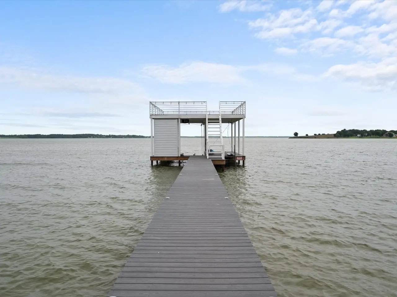 Modern luxury meets lakeside living in this stunning 4-bedroom, 4-bathroom home on just over an acre of waterfront property. Designed with clean lines and top-tier finishes, this home offers a perfect balance of elegance, comfort, and functionality. Arrive in style on a turf-inlay driveway leading to a 4-car garage with epoxy flooring, heated and cooled climate control, and a modern glass door. Inside, the open-concept living space features large windows with breathtaking views of the lake and heated infinity pool, plus an electric fireplace for cozy ambiance. The chef's kitchen is equipped with a massive island, built-in granite sink, brass refrigerator and freezer, Scotsman ice maker, and a walk-in pantry. Entertain with ease thanks to the wet bar located in one of the bedrooms. Retreat to the luxurious primary suite with an electric fireplace, spa-inspired ensuite bathroom with double vanities, garden tub, separate shower, and a custom walk-in closet. The dedicated office features sleek glass walls, perfect for working from home in style. Step outside to tile-covered porches and patios, glass railing for unobstructed views, and a porcelain tile fire pit for relaxing evenings. Enjoy two putting greens, and a custom boat lift with remote control- designed for effortless lake access. With a heated LED-lit infinity pool and a seamless indoor-outdoor flow, this property is a rare blend of sophistication, comfort, and lakeside serenity. Don't miss your chance to own this fully customized modern retreat.