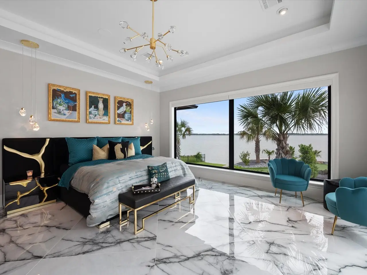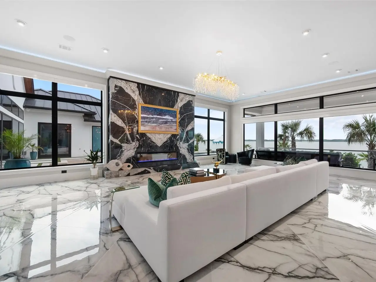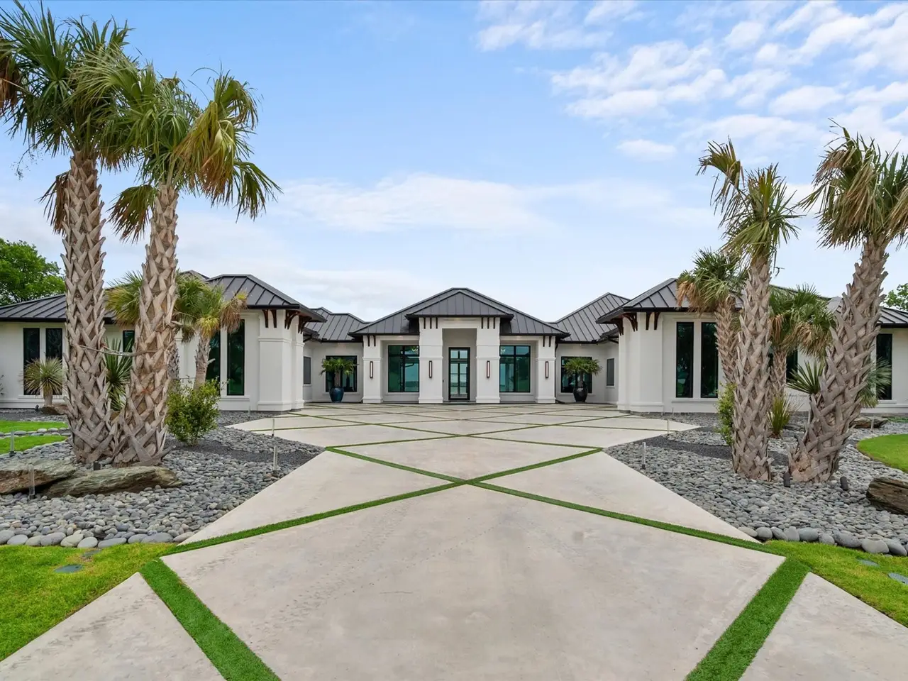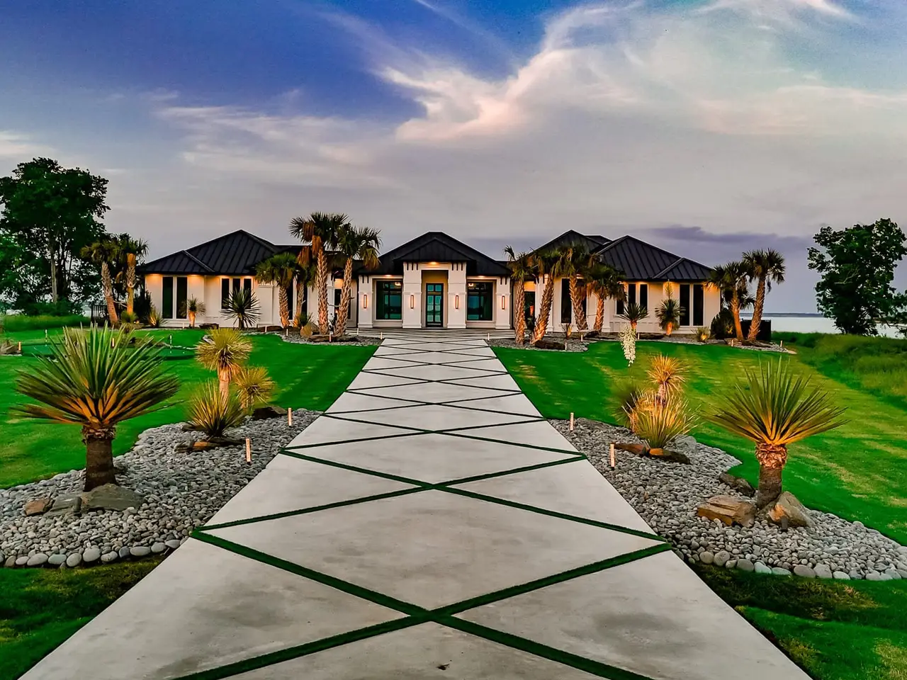 Modern luxury meets lakeside living in this stunning 4-bedroom, 4-bathroom home on just over an acre of waterfront property. Designed with clean lines and top-tier finishes, this home offers a perfect balance of elegance, comfort, and functionality. Arrive in style on a turf-inlay driveway leading to a 4-car garage with epoxy flooring, heated and cooled climate control, and a modern glass door. Inside, the open-concept living space features large windows with breathtaking views of the lake and heated infinity pool, plus an electric fireplace for cozy ambiance. The chef's kitchen is equipped with a massive island, built-in granite sink, brass refrigerator and freezer, Scotsman ice maker, and a walk-in pantry. Entertain with ease thanks to the wet bar located in one of the bedrooms. Retreat to the luxurious primary suite with an electric fireplace, spa-inspired ensuite bathroom with double vanities, garden tub, separate shower, and a custom walk-in closet. The dedicated office features sleek glass walls, perfect for working from home in style. Step outside to tile-covered porches and patios, glass railing for unobstructed views, and a porcelain tile fire pit for relaxing evenings. Enjoy two putting greens, and a custom boat lift with remote control- designed for effortless lake access. With a heated LED-lit infinity pool and a seamless indoor-outdoor flow, this property is a rare blend of sophistication, comfort, and lakeside serenity. Don't miss your chance to own this fully customized modern retreat.