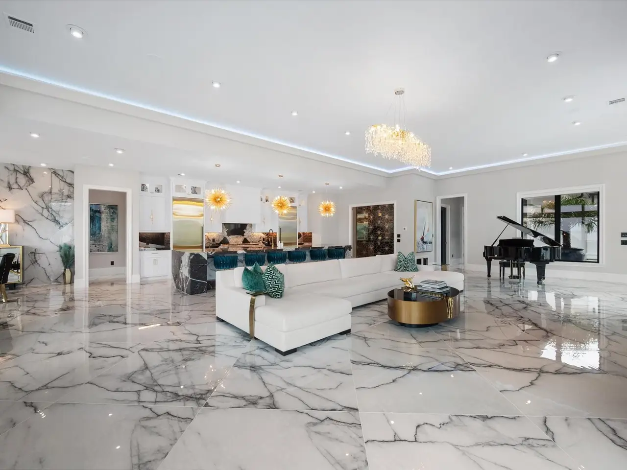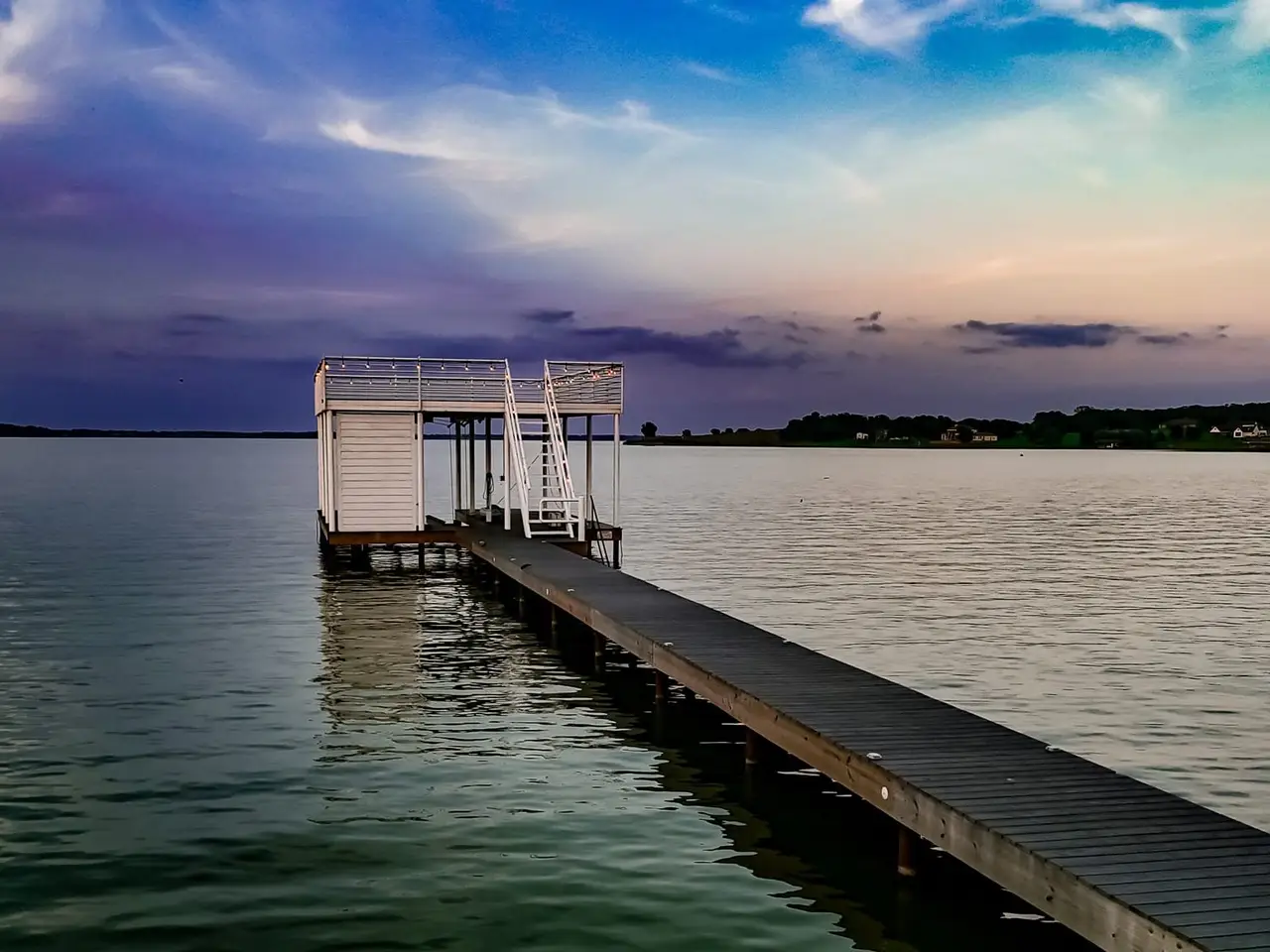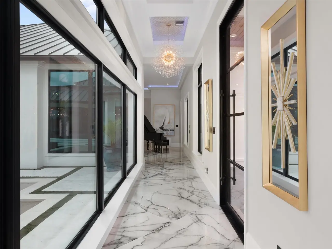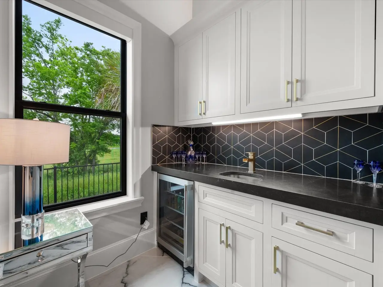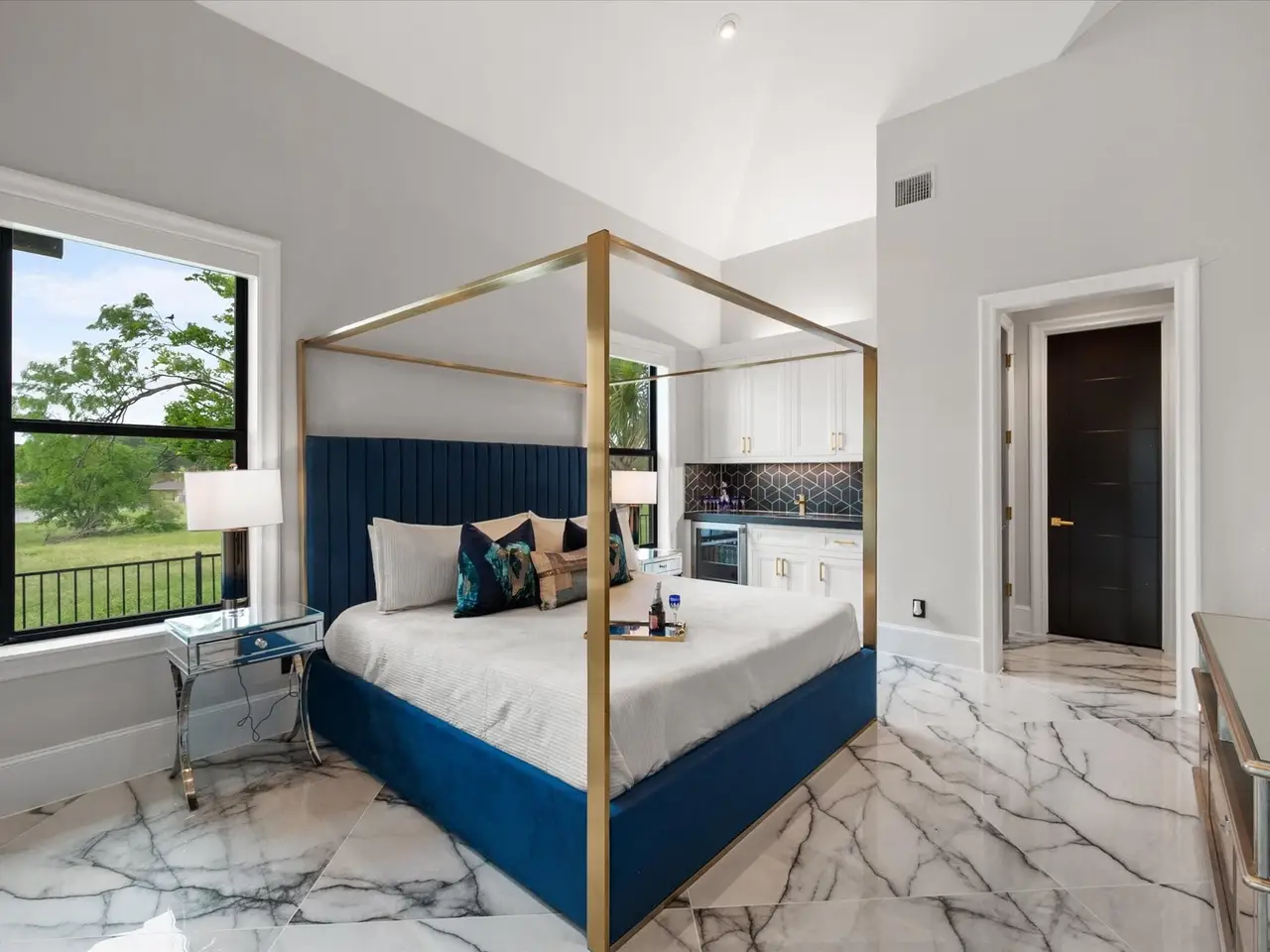Modern luxury meets lakeside living in this stunning 4-bedroom, 4-bathroom home on just over an acre of waterfront property. Designed with clean lines and top-tier finishes, this home offers a perfect balance of elegance, comfort, and functionality. Arrive in style on a turf-inlay driveway leading to a 4-car garage with epoxy flooring, heated and cooled climate control, and a modern glass door. Inside, the open-concept living space features large windows with breathtaking views of the lake and heated infinity pool, plus an electric fireplace for cozy ambiance. The chef's kitchen is equipped with a massive island, built-in granite sink, brass refrigerator and freezer, Scotsman ice maker, and a walk-in pantry. Entertain with ease thanks to the wet bar located in one of the bedrooms. Retreat to the luxurious primary suite with an electric fireplace, spa-inspired ensuite bathroom with double vanities, garden tub, separate shower, and a custom walk-in closet. The dedicated office features sleek glass walls, perfect for working from home in style. Step outside to tile-covered porches and patios, glass railing for unobstructed views, and a porcelain tile fire pit for relaxing evenings. Enjoy two putting greens, and a custom boat lift with remote control- designed for effortless lake access. With a heated LED-lit infinity pool and a seamless indoor-outdoor flow, this property is a rare blend of sophistication, comfort, and lakeside serenity. Don't miss your chance to own this fully customized modern retreat.