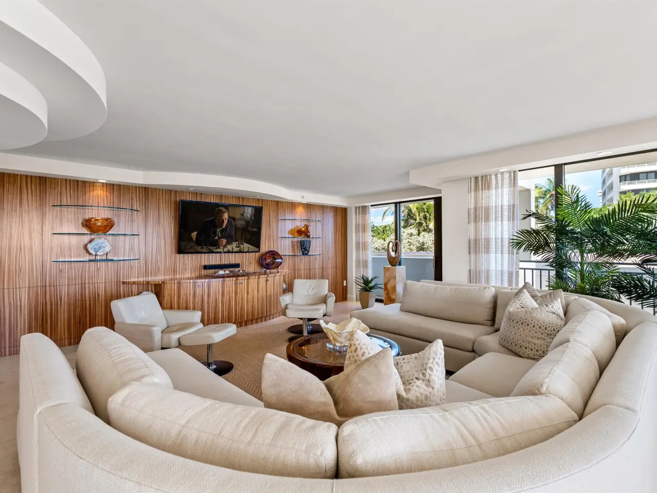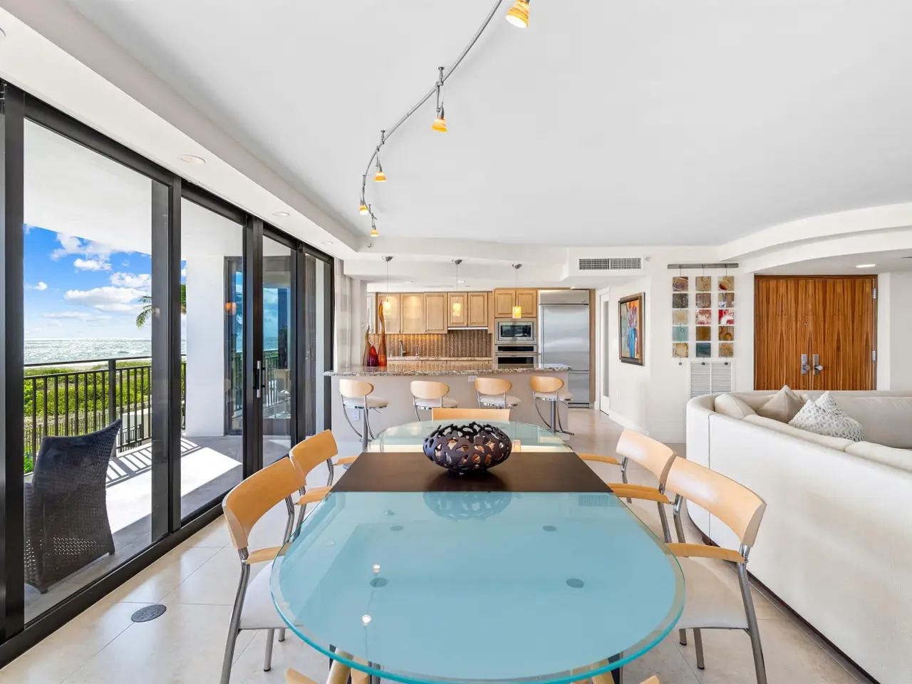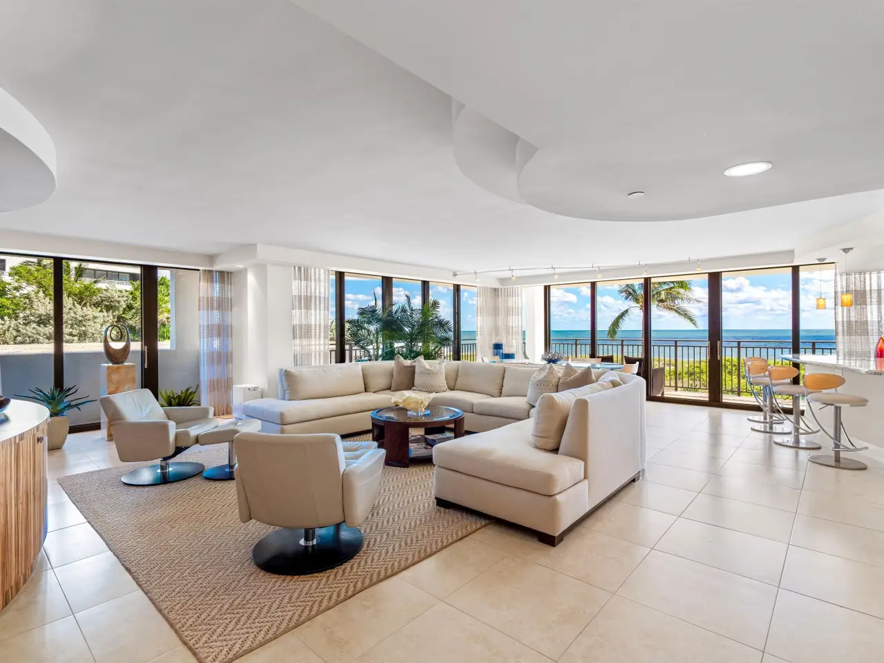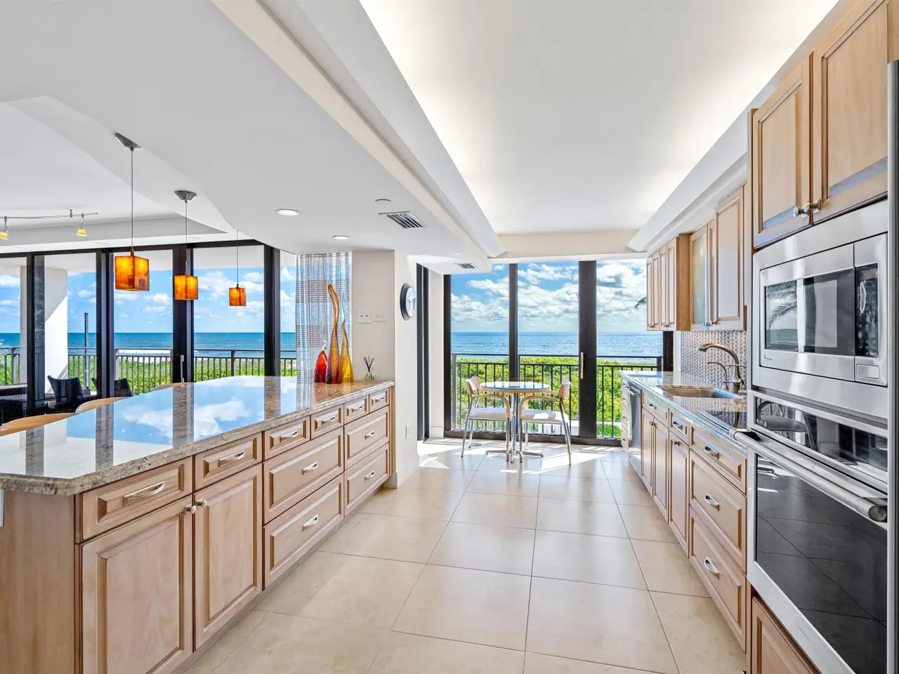 Stunningly updated residence designed by famed Boca Raton designer. This corner great room floor plan features an open kitchen that flows through walls of impact glass sliders to a spacious oceanfront balcony. The designer kitchen offers abundant storage, custom cabinetry, and high-end appliances. The great room showcases a custom media wall. A corner primary suite includes a beautifully fitted dressing room and a luxurious bath with soaking tub and glass-enclosed shower. The third bedroom is customized as a stylish office with built-ins. Enjoy boutique oceanfront living with a resort-style pool overlooking the Atlantic and direct access to miles of pristine sandy beach. Amenities include a club room, fitness center, and lobby with doorman. Pet friendly building!