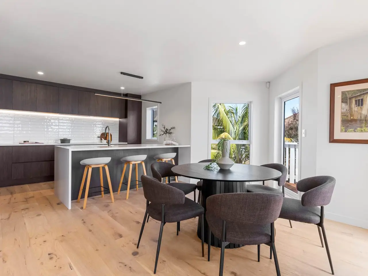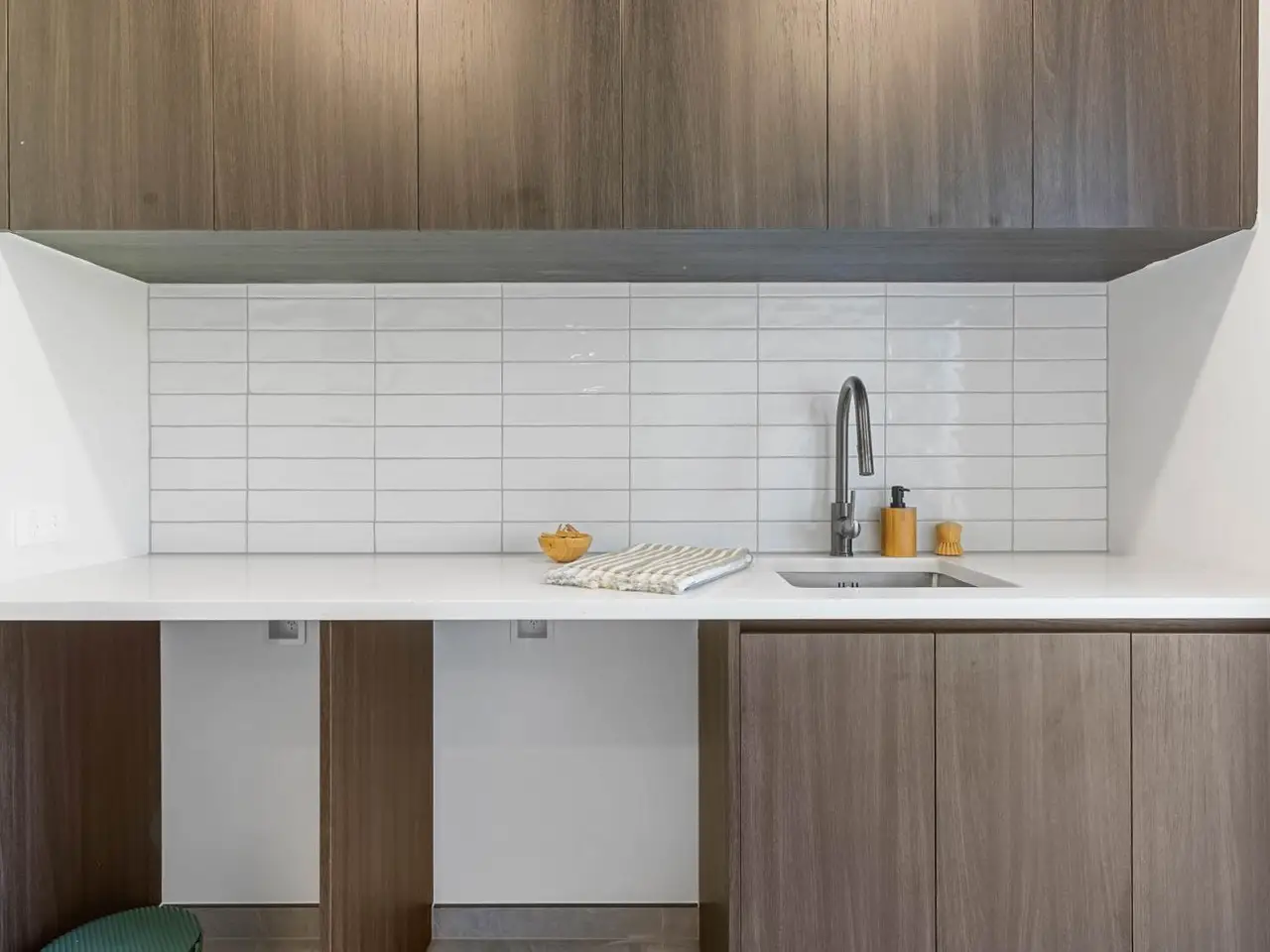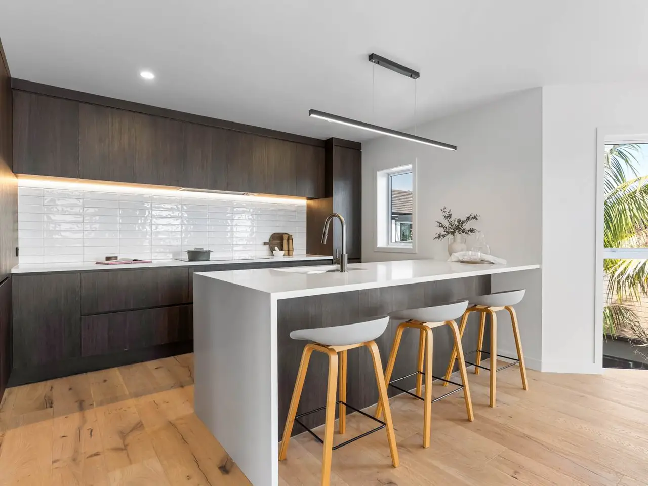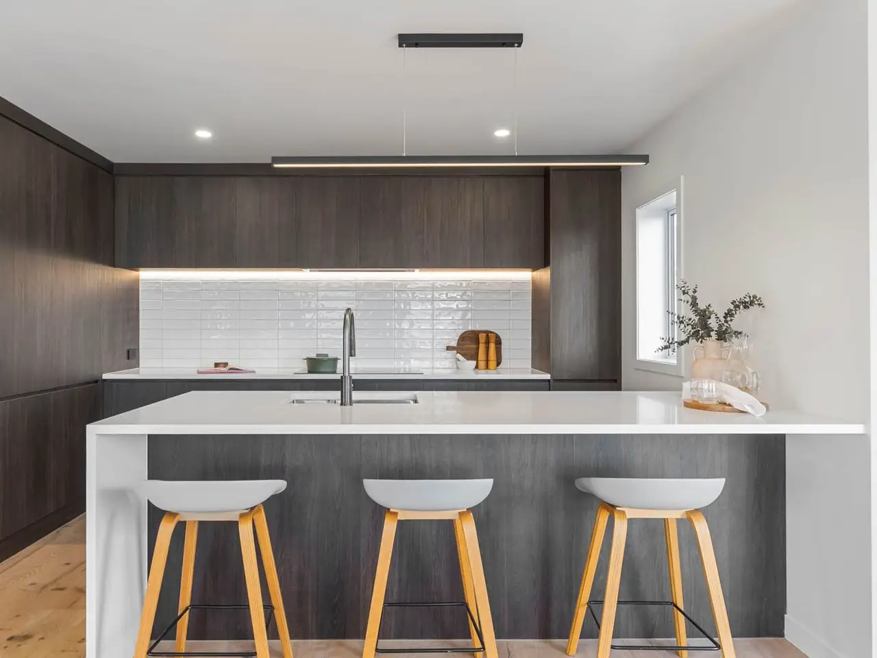 • Designer kitchen with dark timber-grain cabinetry