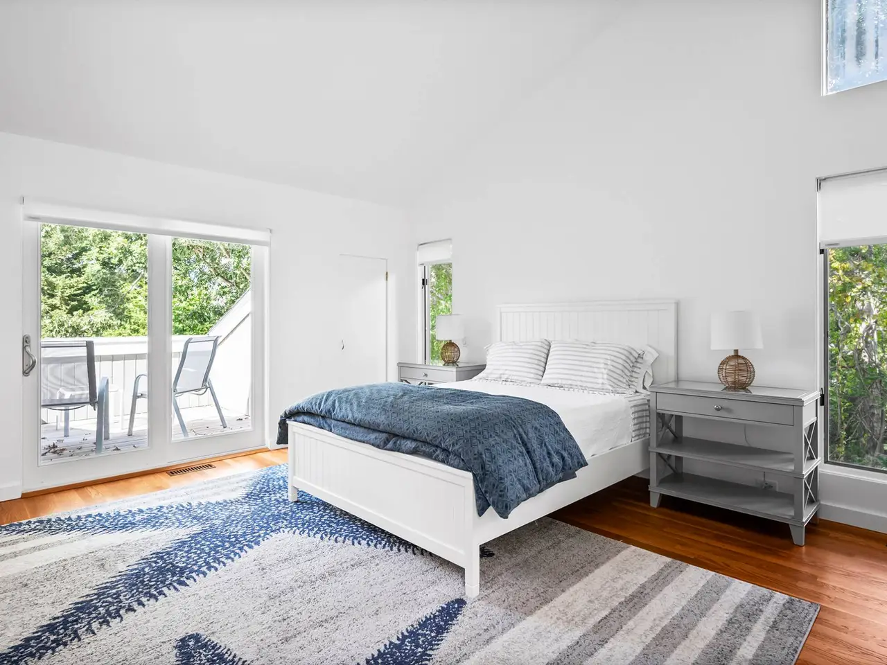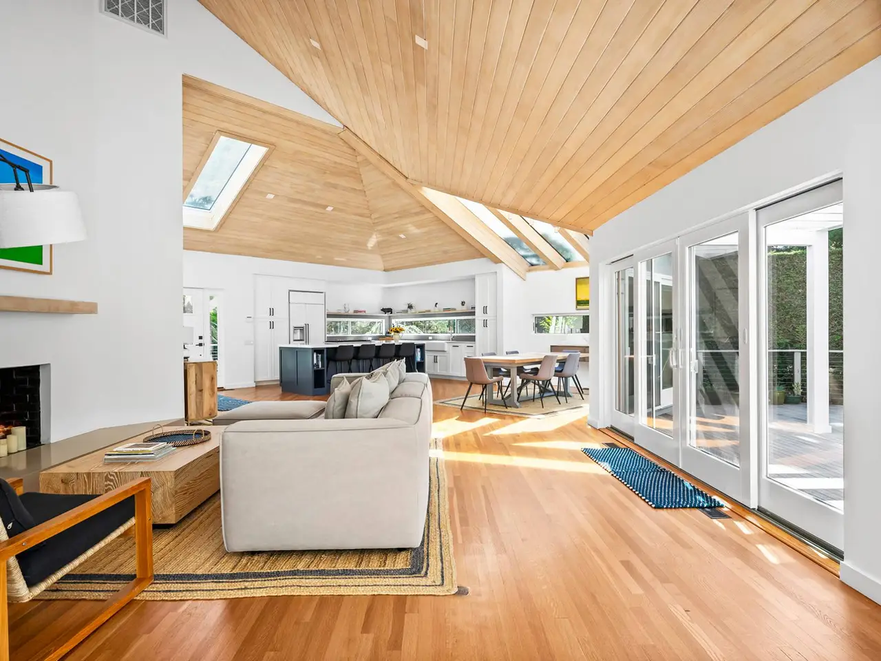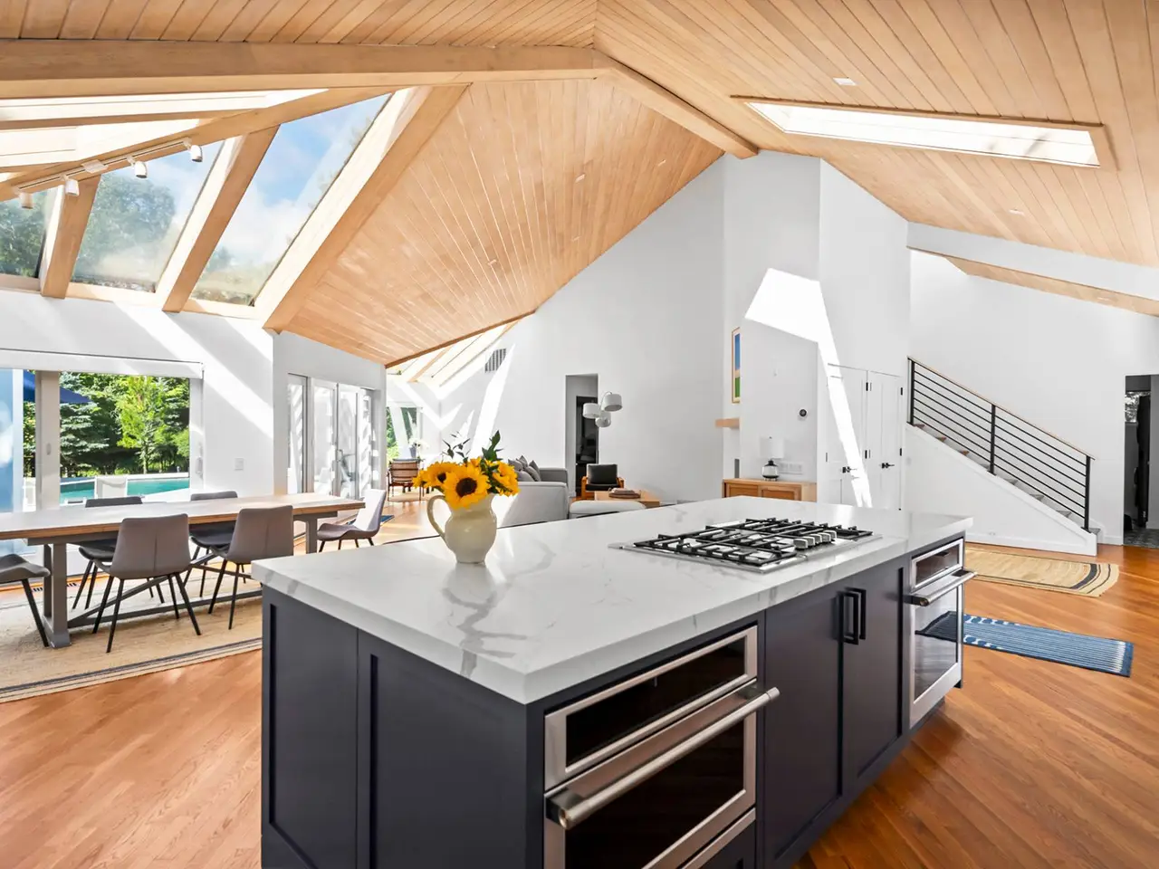 This sun-filled contemporary home situated on a private 1 +/- acre was meticulously renovated in 2021. A thoughtfully designed floor plan provides 3,500 +/- square feet of open living space, 3 bedrooms, 3 baths and a den. The dramatic open-concept layout is highlighted by expansive skylights that fill the home with natural light. The first floor features a living room with fireplace, a stylish dining area, a sleek eat-in kitchen and comfortable family room, all seamlessly integrated. Walls of sliding glass doors connect the interior to an expansive multi-level wood deck surrounding a heated gunite pool, providing a relaxing indoor-outdoor lifestyle. The first floor also includes two separate bedroom wings; a tranquil primary suite and an additional guest suite with a full bath and adjacent den. Upstairs, a private loft-style bedroom suite features its own deck overlooking the pool, offering an ideal retreat for guests. Additional amenities are a full unfinished basement, a two-car garage, and mature landscaping. Enjoy close proximity to Quogue Village shops, dining and beach - making this a perfect year-round residence or weekend escape. Listing ID: 925757