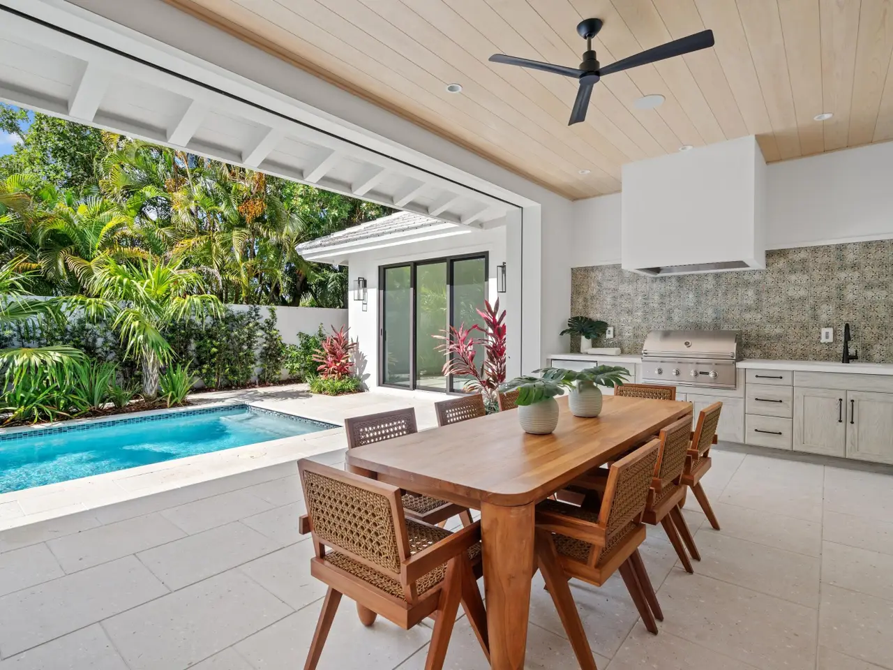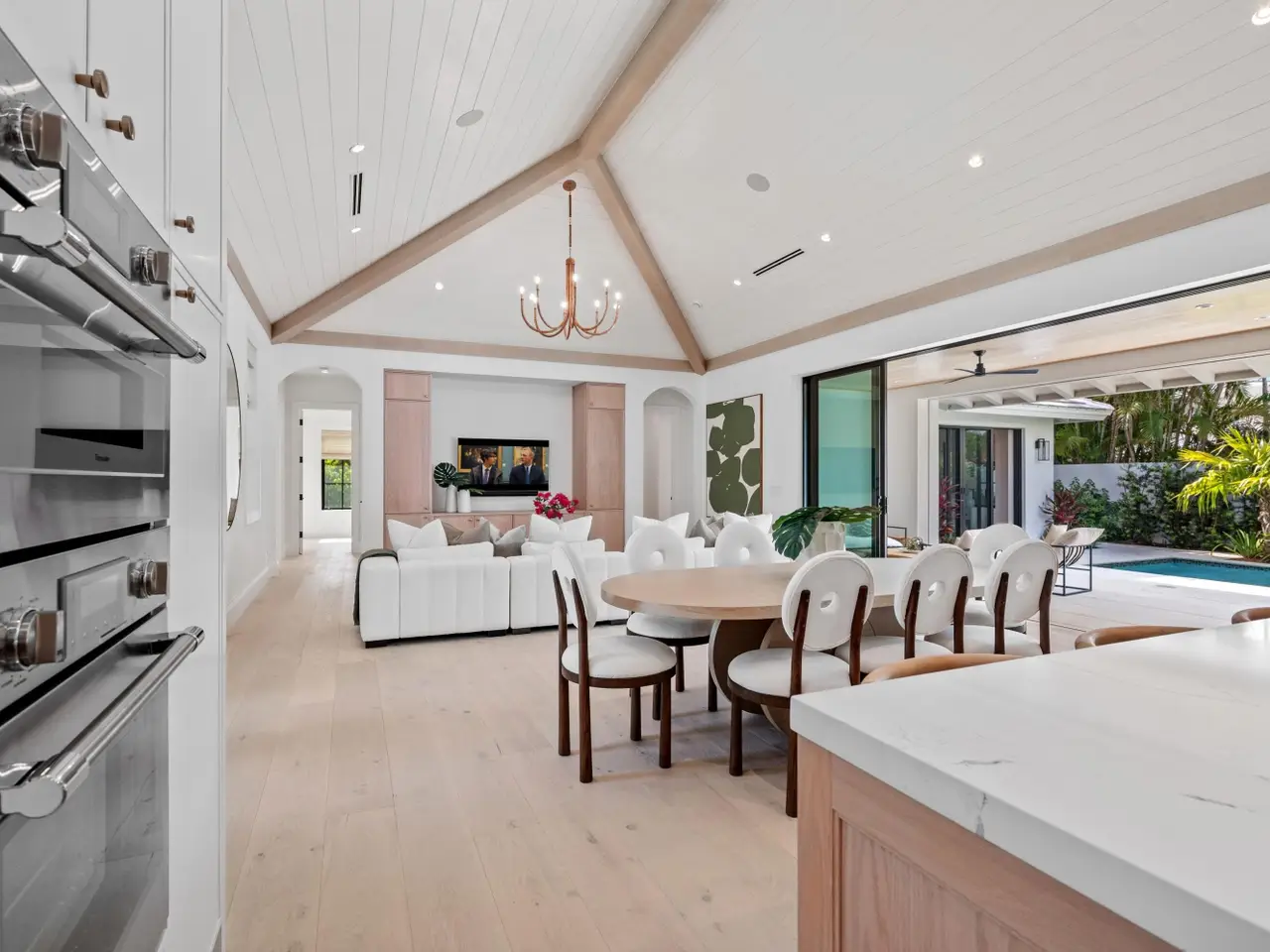 On a prime corner lot in Delray Beach's coveted Lake Ida enclave, this chic 2025-built contemporary residence offers an open floorplan great room, topped by a beamed vaulted ceiling, accessing the pool loggia and summer kitchen; four bedrooms with the primary bedroom opening to a private covered patio, a pocket office; and a cook-island kitchen with two-tone cabinetry, quartz counters and Thermador appliances.