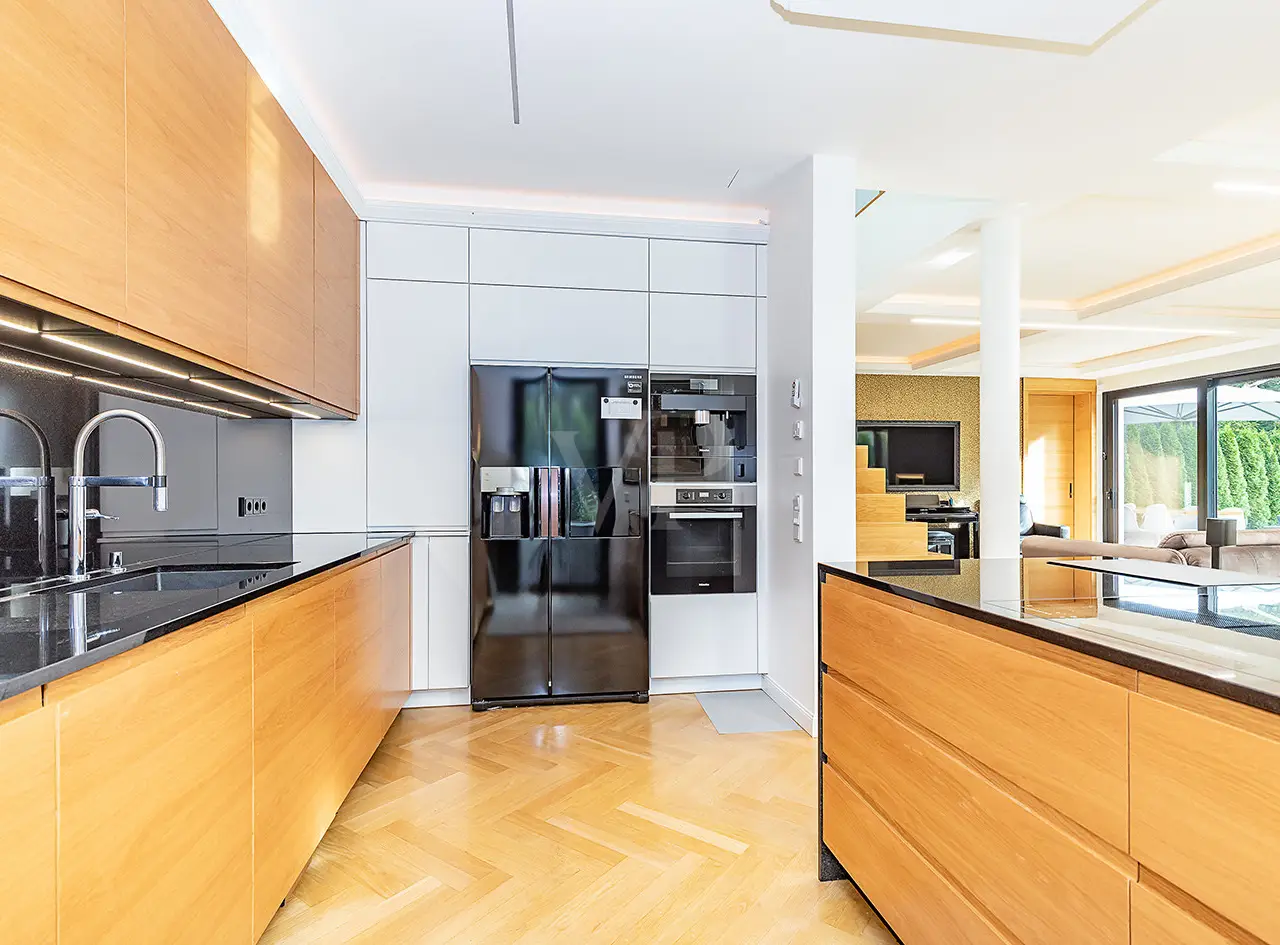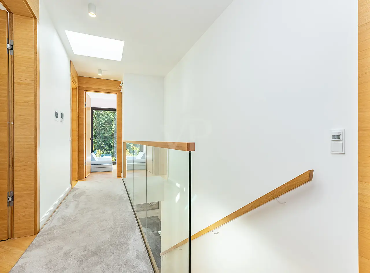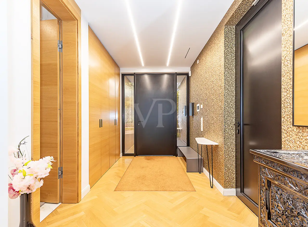 WELCOME to your dream villa, right next to the nature reserve! This special Bauhaus cube, which was built in 2018 in solid construction, impresses with its modern design and high-quality surfaces. The white cube looks imposing yet simple at the same time. As you enter the entrance on the first floor, you are greeted by brightness and an open living atmosphere. To the right of the entrance is a large checkroom with floor-to-ceiling built-in wardrobes. Everything is simple and clearly organized. To the left of the entrance is currently a study and the utility room. The guest WC is located opposite and there is also another office on the first floor. The overall interior design of the Bauhaus villa is underlined by special features, such as the approx. 2.80 meter high ceilings, the special heights of all windows and interior doors and the real wood parquet throughout the house (except bathrooms). Thanks to a controllable lighting concept - with coved lighting in the ceilings - the house can be set off in any mood. Oversized, floor-to-ceiling windows direct the view from all visual axes of the first floor into the green countryside. The property borders a nature reserve, so the view of the garden will always remain unobstructed. In the center of the living and dining area is a high-quality fireplace and another highlight on a reinforced concrete wall. A designer folding staircase covered with real wood (oak) leads to the upper floor. The first floor of the villa forms the focal point of the family's living space, where people gather around the long dining table, eat, work, chill by the fireplace or watch TV. The attractive staircase from the living area leads to the bright upper floor, which has been fitted with skylights in the roof. The air space - with all-round glass railings - emphasizes the transparency of the house. This is where the family's private rooms are located. The master bedroom with dressing room and en-suite bathroom, two children's bedrooms, a master bathroom and several exits to the balcony. The luxurious master bathroom has a large glass shower, a bathtub, two high-quality washbasins with mirror system, a WC and space for the washing machine and dryer. The balcony can also be accessed from here. Another highlight of the property is the view of the greenery. The property has an area of approx. 860 m² and is not visible to neighbors. Ornamental plants, hedges and ornamental shrubs have been planted for low-maintenance use. A lawn robot keeps the lawn short. A massive sauna house is located at the back of the garden, right next to the nature reserve. The sauna with panoramic window, the relaxation area with shower and the well-placed terrace in front complete the attractive living ensemble. The outdoor facilities are rounded off by the generous open spaces at the front of the house. A bicycle shed (aluminum) with storage space and another covered terrace directly below the balcony are located on the west side of the property. Two electric sliding entrance gates seal off the property from view. At least 4 parking spaces are available in front of the house. NOTE: The house will be handed over in consultation with the vendors.
