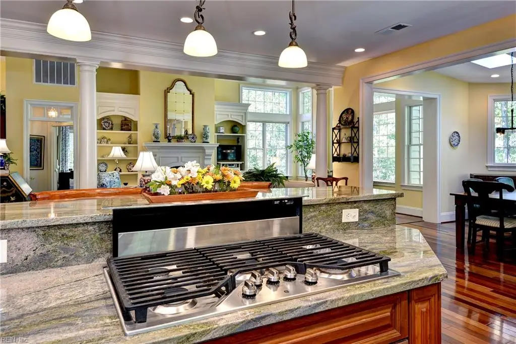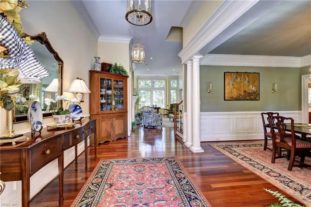 This Cape Cod-style home with its gracious Southern Living porch is perfectly sited along a tranquil estuary framed by trees and a distant tidal marsh - an ideal haven for bird-watching and privacy. Set on one of Governor's Land's most desirable streets, the home offers timeless architecture and comfortable sophistication. A dramatic 14-foot foyer opens to the dining room and a spectacular great room with soaring ceilings, gas fireplace, and walls of windows capturing the serene landscape. The open kitchen features a large center island, gas cooking, walk-in pantry, and coffee/wine bar with sink. The breakfast area opens to a grilling deck and screened porch. The first-floor primary suite includes a tray ceiling, two walk-in closets, and a luxurious en suite bath. Upstairs, a private suite offers a bedroom, recreation area, and bath. The walk-out lower level features a family room with stacked-stone fireplace, built-ins, sunroom, second primary suite, flex rooms, and conditioned storage.