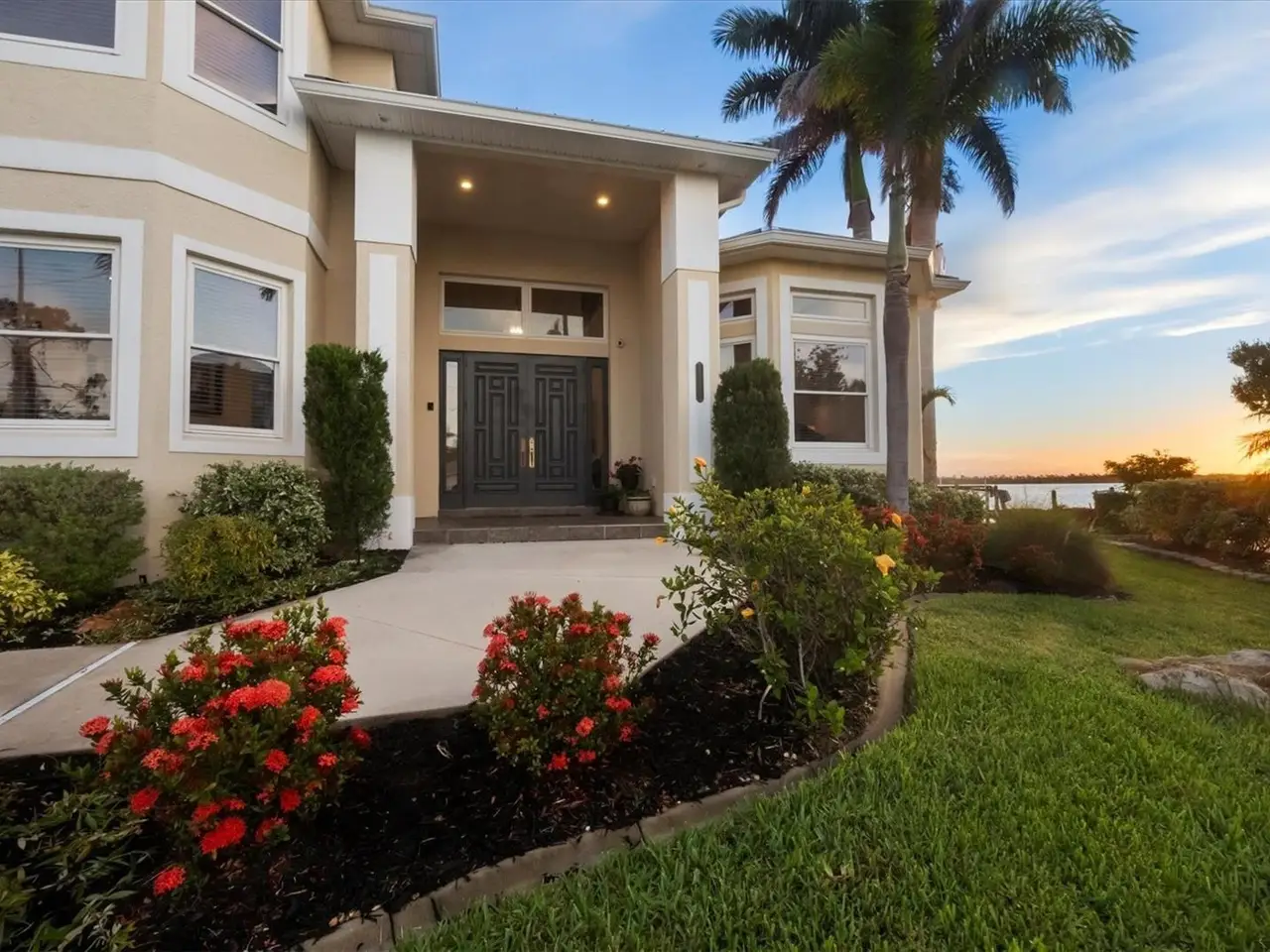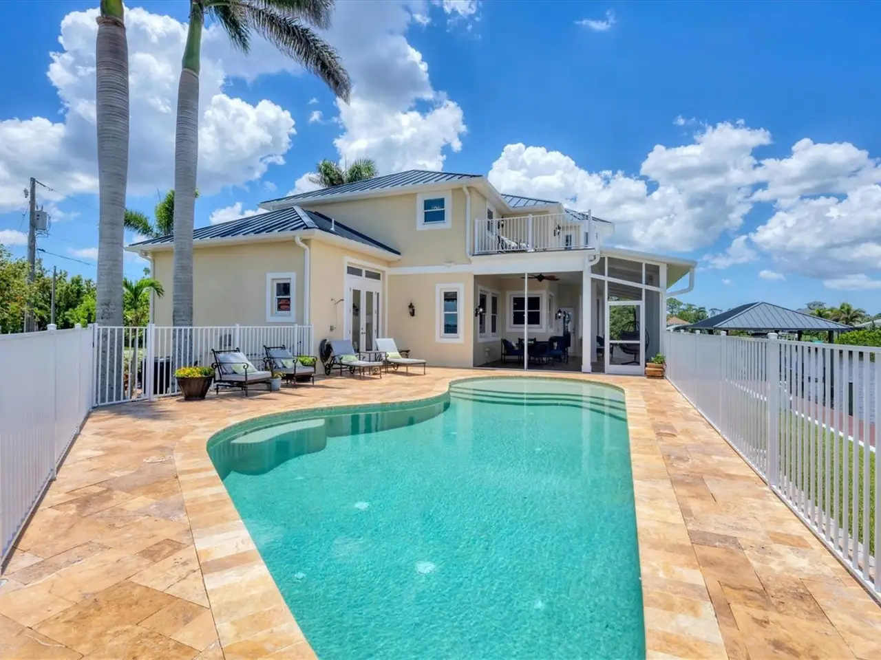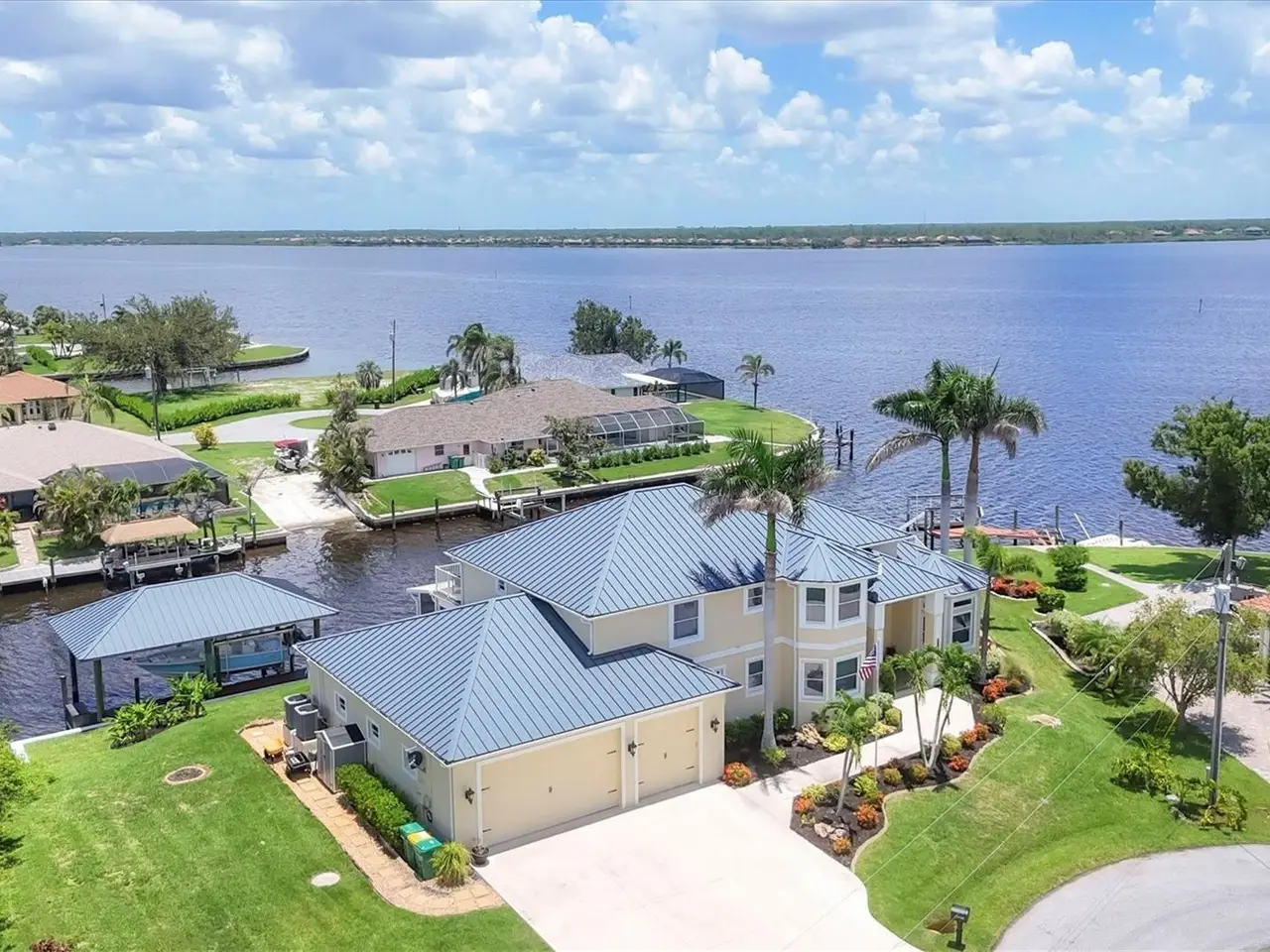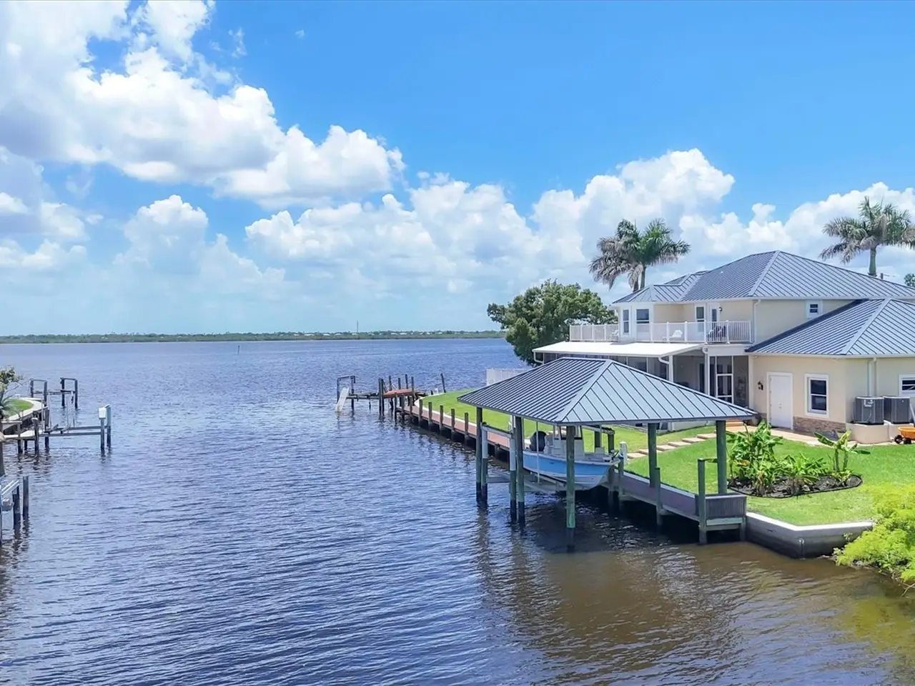 Introducing "River Breeze at Paradise Point" the whimsical name of this breathtaking property, affectionately bestowed by the current owners. This stunning waterfront estate, stretching across 0.39 acres, is perched along the Myakka River with quick access to Charlotte Harbor and a 30-minute boat ride to the Gulf. It's every boater's dream to the best fishing in Southwest Florida, featuring 185 feet of concrete seawall, a 167-foot captain's walk, and a 2023 metal-roofed boathouse with a 16,000 lb remote-controlled boat lift. Enjoy dolphin, manatee, and bald eagle sightings, or cast a line for record snook, world-renown tarpon, and redfish all from your backyard. The home offers 3,825 sq ft of living space and a spacious, well-organized 1,327 sq ft 4+ car garage with 10.5-foot ceilings. Inside, the soaring 20-foot foyer with a sweeping staircase leads into a bright music room with 12-foot bamboo tray ceiling, and an entertainer's dream kitchen featuring a massive quartz island, updated cabinetry, stainless appliances, and three built-in dishwashers. The kitchen flows seamlessly into the dining and bar areas and out to a 56-foot screened patio and extended lanai perfect for year-round indoor-outdoor living. Step out to the heated saltwater pool, surrounded by open-air lounge space ideal for relaxing in the Florida sunshine. The primary suite is a private retreat with a sitting area, two walk-in closets, a luxurious 14x14 bathroom with a 5x7 glass shower, and direct access to a private waterfront balcony. The primary guest suite also features a private balcony and river views. Every bedroom is en suite, ensuring comfort and privacy for guests. Throughout the home, enjoy travertine and engineered wood flooring with porcelain tile in 2nd level bathrooms, detailed crown molding, and abundant storage including multiple custom closets. Additional recent upgrades include a new standing seam metal roof (house and boathouse), two new A/C units with whole-home UV filtration, spray foam insulation, PECS plumbing system, impact-resistant windows and doors throughout, and fresh interior/exterior paint. The pool features a new heat pump, chlorine generator, and variable-speed pump, while rebuilt decks and upgraded kitchen and baths further elevate the home's quality and style. Tucked away in Gulf Cove, a hidden gem community known for its quiet streets, friendly neighbors, and walkable, bike-friendly atmosphere, this exceptional home offers luxury, comfort, and breathtaking water views delivering unmatched waterfront living in a peaceful coastal setting.