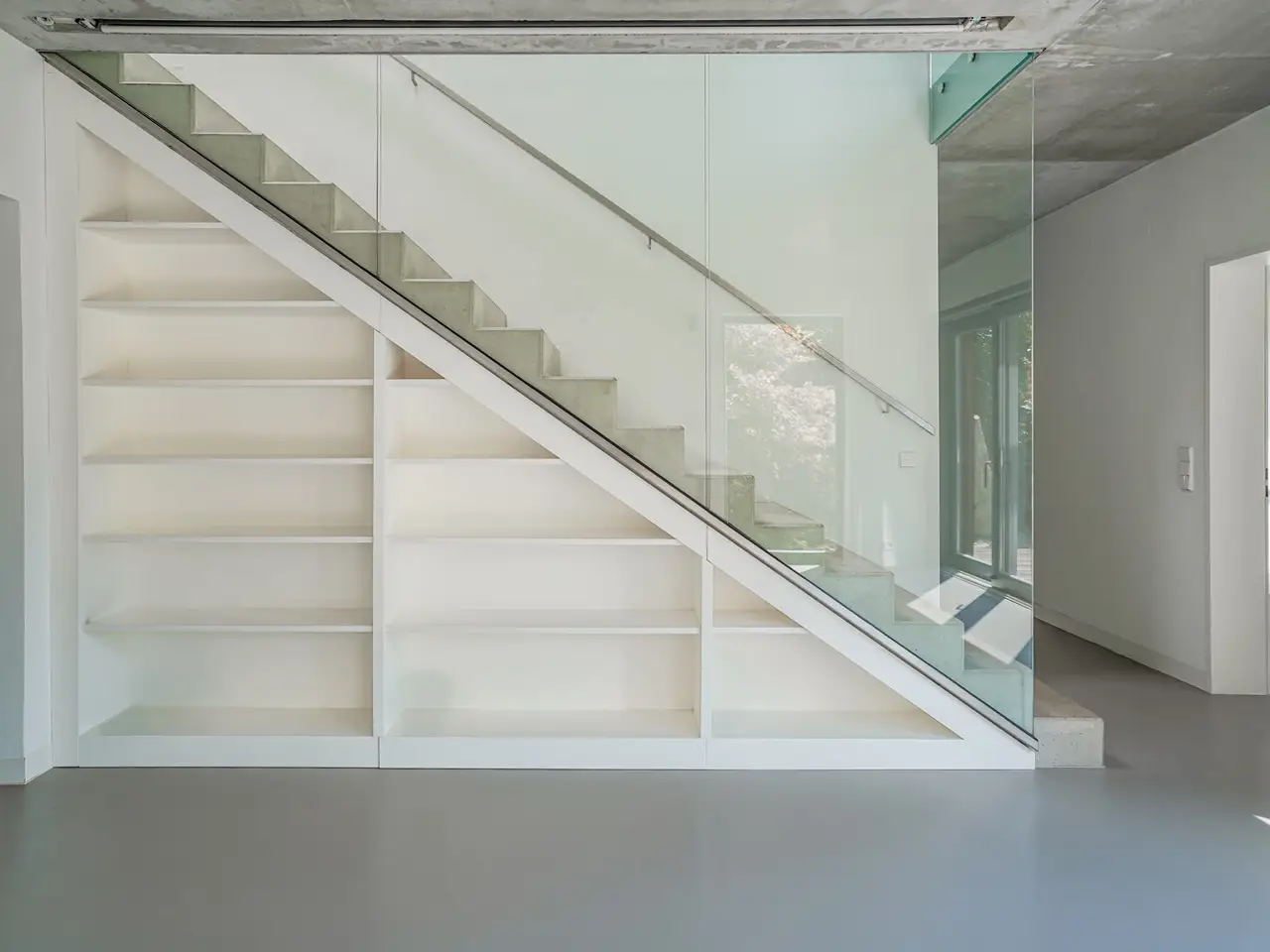 A house for people who are looking for something special: In one of the most sought-after locations in Biesdorf-Nord, this extraordinary detached house presents itself as a rare synthesis of clear Bauhaus architecture and purist industrial interior. Outside, the flat roof, precise lines and warm wood cladding characterize the timeless appearance; inside, exposed concrete, generous openness and a consistently well thought-out room layout inspire. A style that rarely appears on the market. As soon as you enter through the hallway, it becomes clear that this house is no ordinary new build, but an architecturally composed one-off. The clear lines, the soft feel of the concrete surfaces and the view through the floor-to-ceiling glass surfaces immediately make everyday life fade away. The living room attracts attention first: A separate, spacious room that nevertheless does not feel isolated. A continuous window front allows an unobstructed view across the terrace into the garden. The modern lift and slide doors open the room almost silently and merge the indoor and outdoor areas. Here you can relax with the glass open on summer evenings or sit comfortably in front of the projector cinema in winter - the built-in screen elegantly lowers and transforms the room into a private cinema. The staircase - made of exposed concrete - is not only functional, but also makes an architectural statement. It stands as a floating connection between the floors and at the same time as a visual room divider. The space under the staircase was optimally used with custom-made shelves - ideal for books or decorations. The cooking and dining area opens up behind the staircase: The modern fitted kitchen with central cooking island dominates here. The lines are minimalist, the fittings uncompromisingly modern - a place where cooking becomes an experience. Whether social evenings with friends or sensual evenings with the family. The first floor also has a friendly guest WC, a utility room with space for a washing machine, dryer and technical equipment, as well as a spacious room. The latter offers a direct view of the garden thanks to its wide window front - perfect as a master bedroom on the first floor or a guest room. A staircase with a glass side panel leads to the upper floor. The play of light is noticeable as soon as you go up: an integrated skylight floods the area with daylight. The upper area is deliberately designed as a private retreat - away from the hustle and bustle on the first floor. Three large bedrooms offer plenty of space for individual furnishing ideas - whether as a bedroom, children's room or guest room. A fourth, somewhat more compact room is ideal as an office, dressing room or hobby room. The bathroom is a statement of modern wellness architecture: generously proportioned, with a floor-level shower, a bathtub for relaxing moments, double washbasins and tasteful tiles. This is where functionality meets spa atmosphere. From the upper floor, the intelligently positioned windows provide views of the garden - a small but very deliberate detail that floods the day with light. From the living room, you can access the terrace - perfect for long evenings with family and friends. The garden offers impressive dimensions: approx. 30 m deep and approx. 18 m wide. Whether a pool, play area, fruit and vegetable beds or wide lawns - every idea finds its place here. A wooden garden shed accommodates equipment; at the rear end of the property, a solid shed with two lockable rooms completes the offer. This house is not a standard, but an architectural statement. A unique, one-of-a-kind and very individual home.