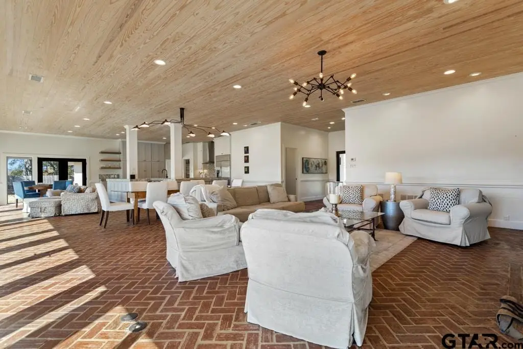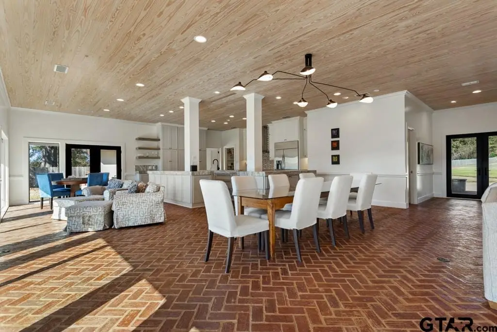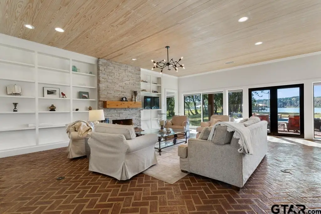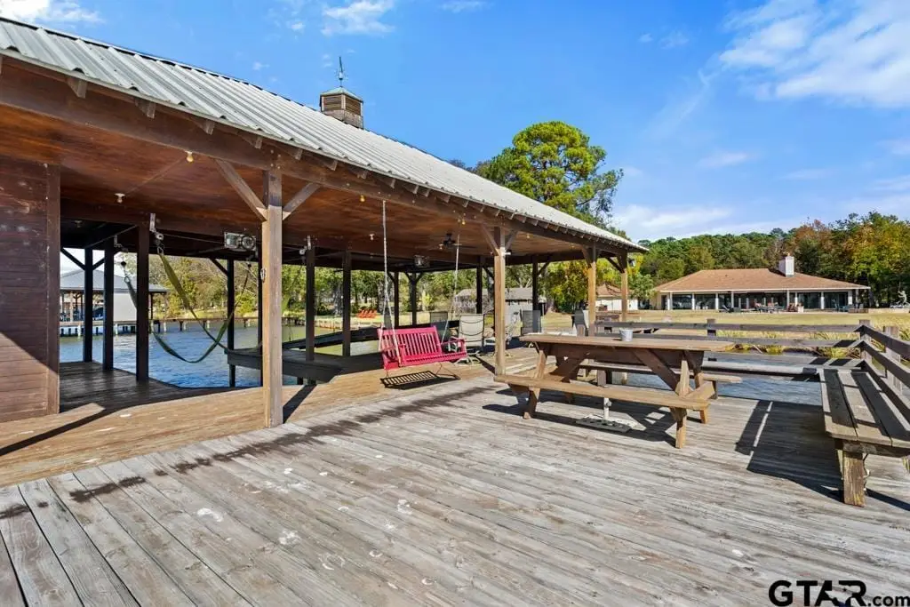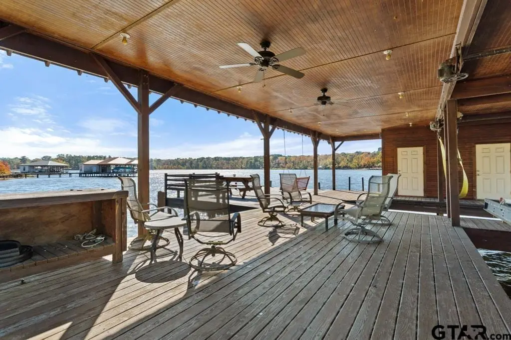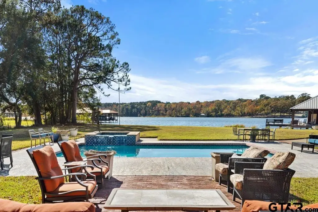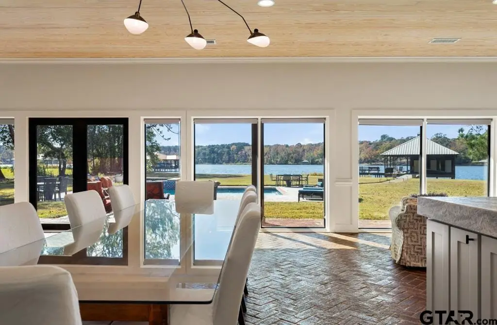 Fabulous gated Lake Tyler dream property offering deep water, a quiet dead-end cul-de-sac location, and a beautifully level lot with exceptional outdoor amenities. Enjoy a gunite pool and hot tub, plus an impressive boathouse with storage, double lifts, and generous covered and open lounging areas'perfect for lake living. The one-level main home features a huge primary suite with fireplace, his-and-hers private baths, and an open living, kitchen, and dining layout'each showcasing big water views. The living area includes a fireplace, custom built-ins, brick floors, wood ceilings, and custom fixtures throughout. The dream kitchen offers extensive workspace and cabinetry, double Bosch convection ovens, built-in refrigerator, wine fridge, ice maker, and a warming drawer, creating outstanding flow for entertaining. A private guest suite offers comfort and privacy, while the separate guest house connected by a covered walkway'adds three additional bedrooms and three and a half baths, ideal for multi-generational living or extended stays. Quality construction shines throughout with 2x6 insulated walls, custom 4-panel doors, tall ceilings, and Pella windows. A rare opportunity to own a truly exceptional Lake Tyler retreat designed for comfort, luxury, and unforgettable lakeside living.