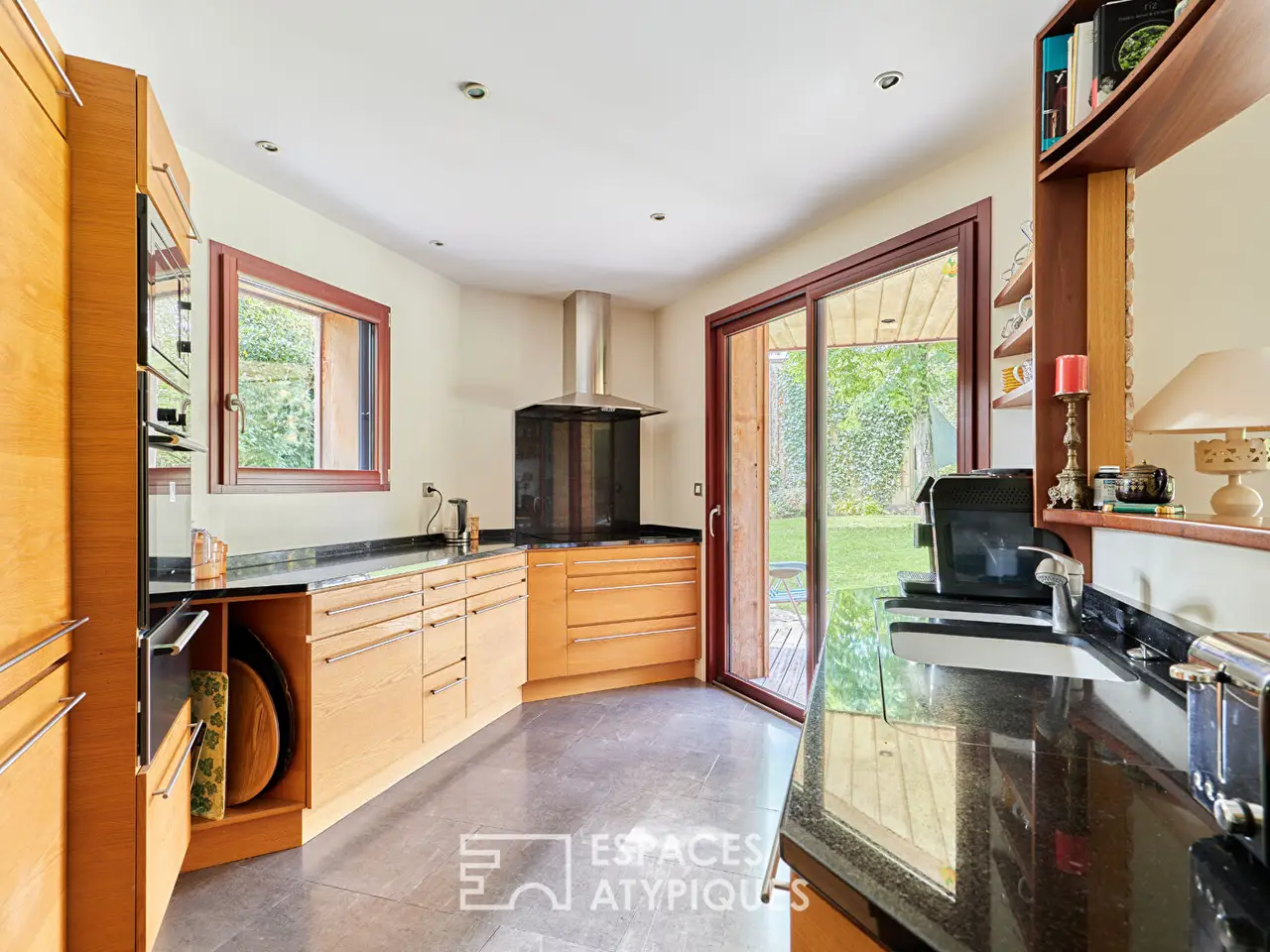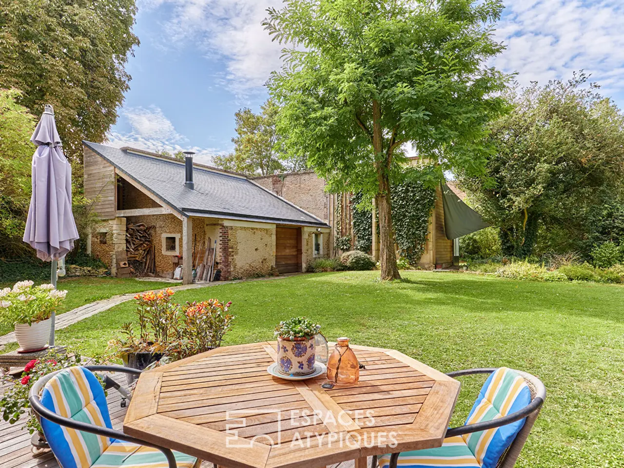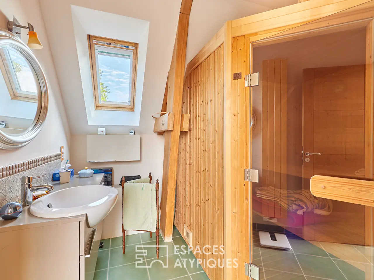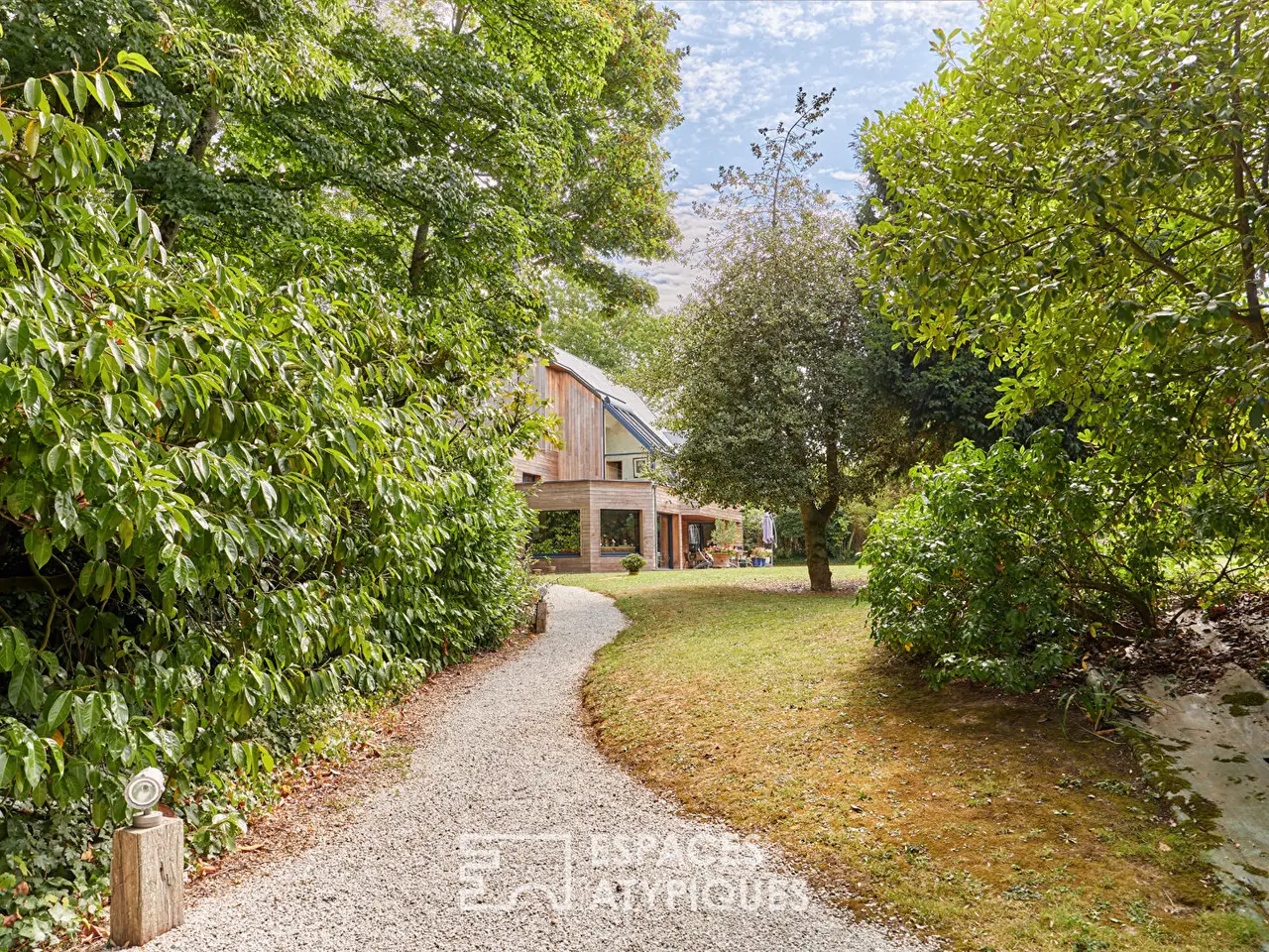 Located a few minutes from Caen and the beaches of the Cote de Nacre, this magnificent 250 sqm house, designed by an architect in 2006, has been discreetly placed in a wooded and privileged environment of approximately 3600 sqm, sheltered from view. The entrance with cloakroom reveals a living room with an enveloping and warm atmosphere, easily communicating with the outdoor space thanks to the large south-west-facing openings that punctuate the facade. This central island invites you to share convivial moments around the dining room, by the fireplace or in the family room on the mezzanine. A half-floor leads to the 33 sqm master suite with its bathroom (bath and shower), dressing room, and private terrace. The mezzanine overlooking the property and with its terrace is the ideal observation point to admire the surrounding wildlife, offering a unique view of the property. The first floor accommodates three sleeping areas, one with a private bathroom and the other two sharing a beautifully equipped shower room. The sleeping areas benefit from clever storage, for a minimalist visual effect. Every detail testifies to the owners' commitment to creating an exceptional living space, where calm, softness and serenity are the key words. In addition to a remarkable enclosed landscaped garden, this property complex is completed by a laundry room / linen room, a storeroom, a wine cellar, and a carport. This architecture with pure lines combines noble materials and cutting-edge technology (underfloor heating, geothermal energy by well, red cedar wood cladding) and allows this pretty house to rank at the top of the DPE classification (B). Finally, a large outbuilding benefiting from beautiful glass roofs offers great possibilities for additional developments. This green paradise, located in a verdant setting, opens up many possibilities for those who like to stroll or observe wildlife at nightfall. Distances: Caen city center: approximately 10 minutes Cote de Nacre beaches: approximately 15 minutes ENERGY CLASS: B / CLIMATE CLASS: A Estimated average amount of annual energy expenditure for standard use, established from energy prices on January 1, 2021, between: 1,940 euros and 2,670 euros. Information on the risks to which this property is exposed is available on the Georisques website: www.georisques.gouv.fr REF. 12221 Additional information * 8 rooms * 4 bedrooms * 2 bathrooms * 1 bathroom * Outdoor space : 3600 SQM * Property tax : 3 999 € Energy Performance Certificate Primary energy consumption b : 102 kWh/m2.year High performance housing