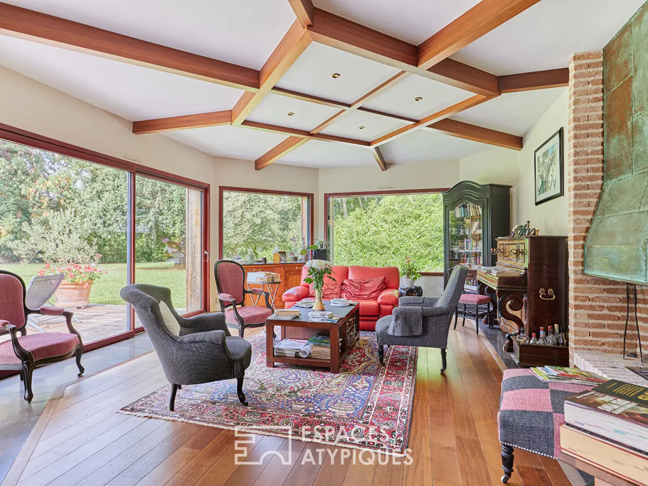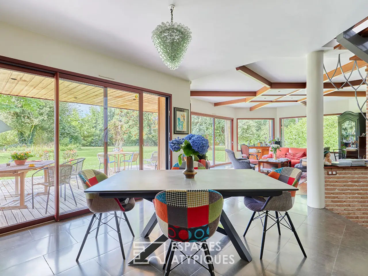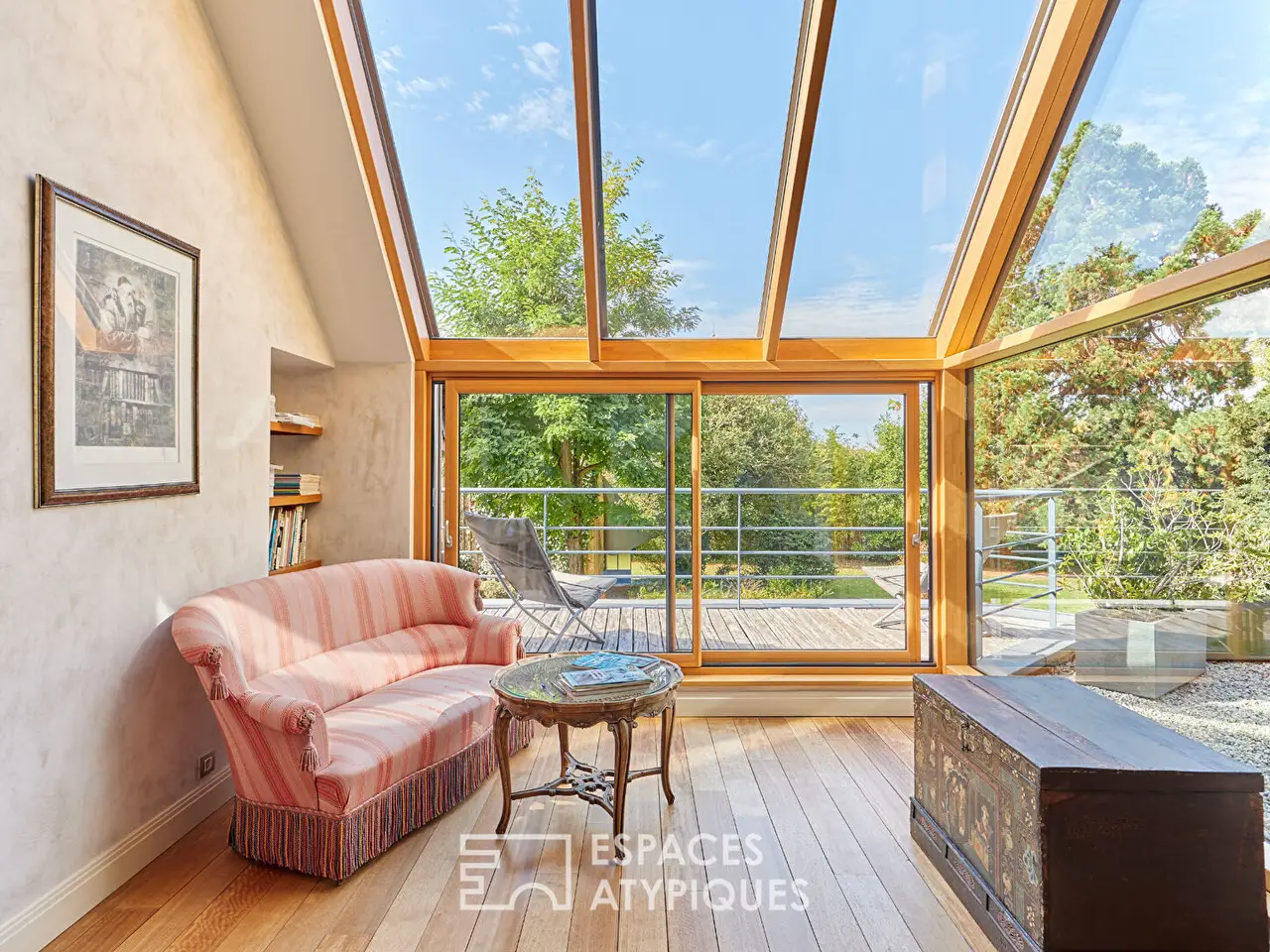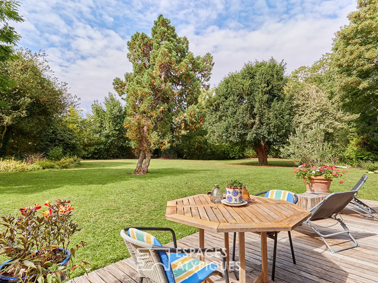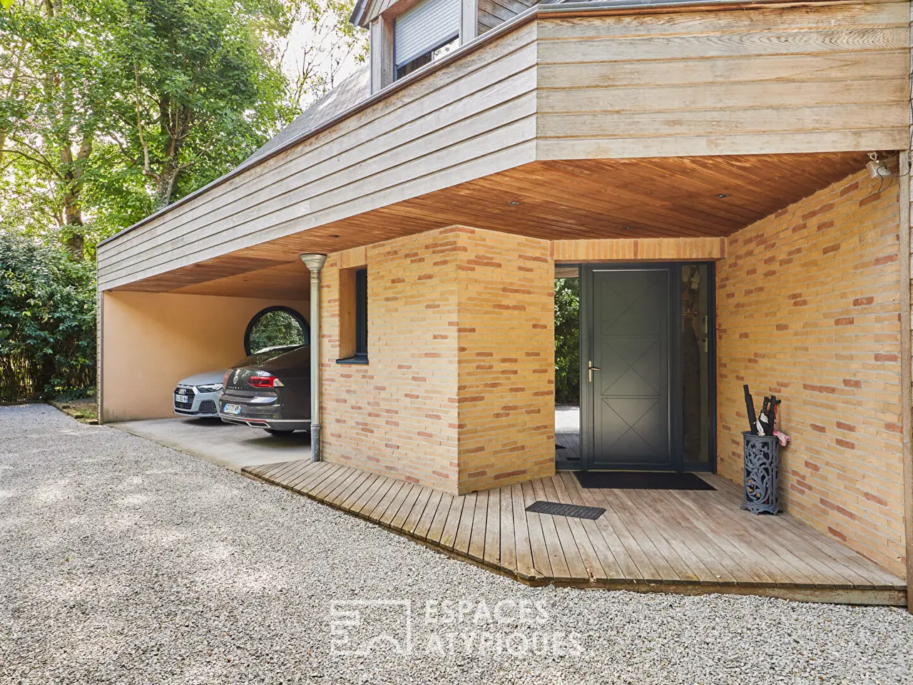 Located a few minutes from Caen and the beaches of the Cote de Nacre, this magnificent 250 sqm house, designed by an architect in 2006, has been discreetly placed in a wooded and privileged environment of approximately 3600 sqm, sheltered from view. The entrance with cloakroom reveals a living room with an enveloping and warm atmosphere, easily communicating with the outdoor space thanks to the large south-west-facing openings that punctuate the facade. This central island invites you to share convivial moments around the dining room, by the fireplace or in the family room on the mezzanine. A half-floor leads to the 33 sqm master suite with its bathroom (bath and shower), dressing room, and private terrace. The mezzanine overlooking the property and with its terrace is the ideal observation point to admire the surrounding wildlife, offering a unique view of the property. The first floor accommodates three sleeping areas, one with a private bathroom and the other two sharing a beautifully equipped shower room. The sleeping areas benefit from clever storage, for a minimalist visual effect. Every detail testifies to the owners' commitment to creating an exceptional living space, where calm, softness and serenity are the key words. In addition to a remarkable enclosed landscaped garden, this property complex is completed by a laundry room / linen room, a storeroom, a wine cellar, and a carport. This architecture with pure lines combines noble materials and cutting-edge technology (underfloor heating, geothermal energy by well, red cedar wood cladding) and allows this pretty house to rank at the top of the DPE classification (B). Finally, a large outbuilding benefiting from beautiful glass roofs offers great possibilities for additional developments. This green paradise, located in a verdant setting, opens up many possibilities for those who like to stroll or observe wildlife at nightfall. Distances: Caen city center: approximately 10 minutes Cote de Nacre beaches: approximately 15 minutes ENERGY CLASS: B / CLIMATE CLASS: A Estimated average amount of annual energy expenditure for standard use, established from energy prices on January 1, 2021, between: 1,940 euros and 2,670 euros. Information on the risks to which this property is exposed is available on the Georisques website: www.georisques.gouv.fr REF. 12221 Additional information * 8 rooms * 4 bedrooms * 2 bathrooms * 1 bathroom * Outdoor space : 3600 SQM * Property tax : 3 999 € Energy Performance Certificate Primary energy consumption b : 102 kWh/m2.year High performance housing