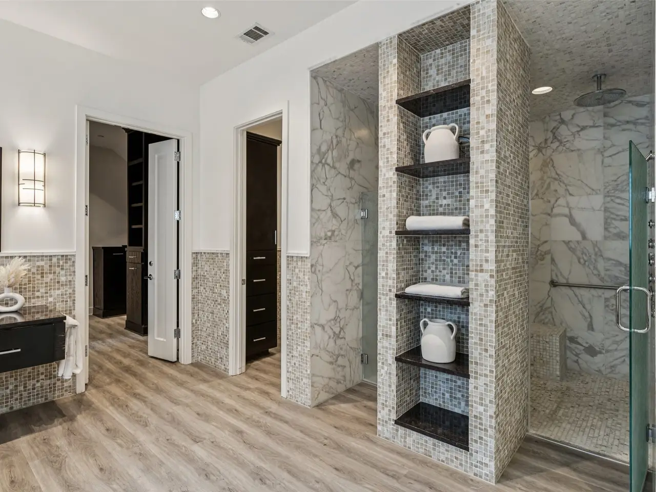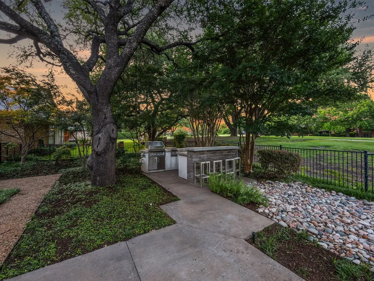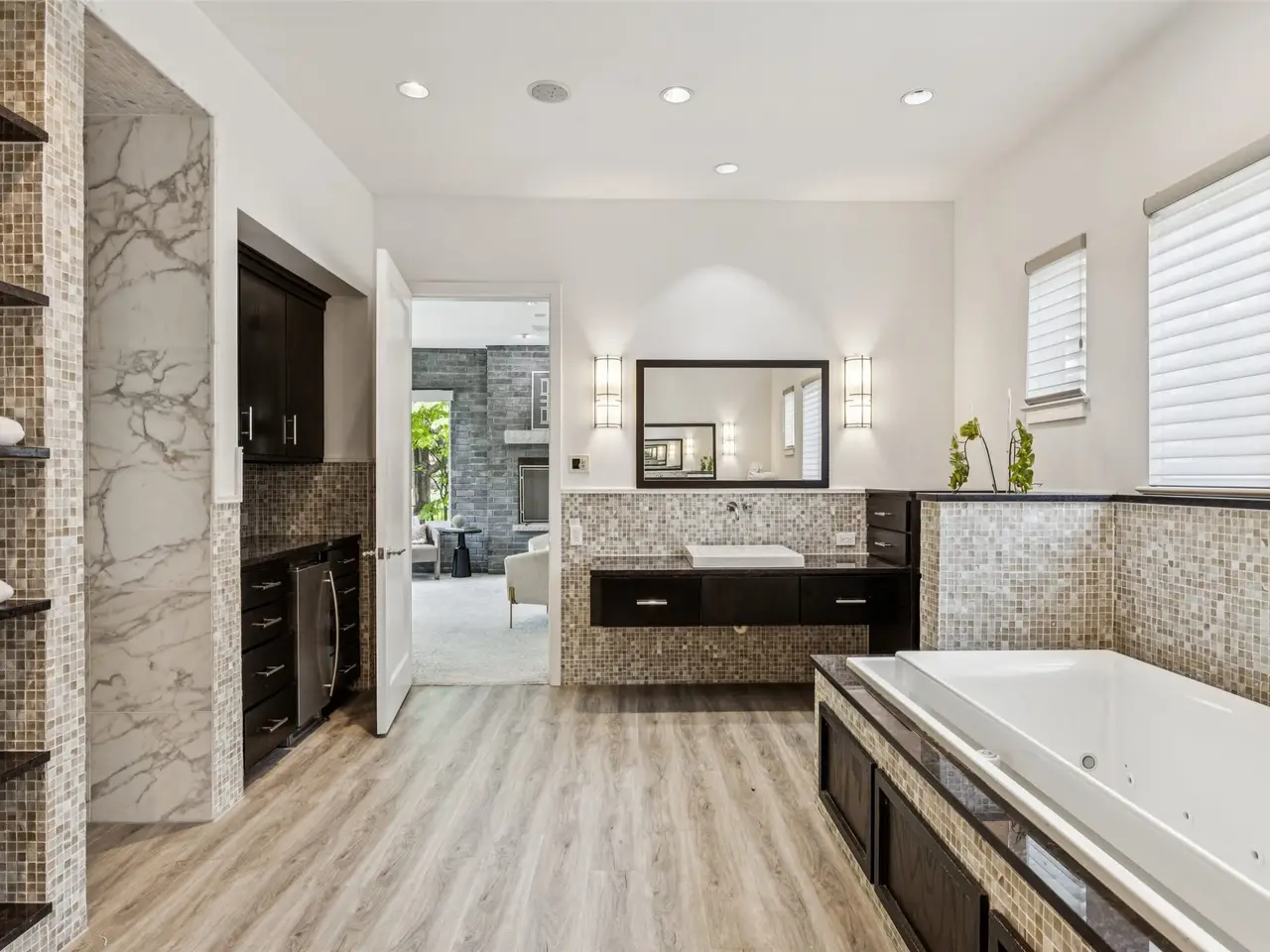 Perfectly positioned on the 16th hole of Bent Tree Country Club, this exceptional custom home offers over 7,100 square feet of luxury living on a 0.379-acre golf course lot. A circle drive, mature trees, lush landscaping, and two water features create a striking first impression, while the interior showcases thoughtful design, refined finishes, and modern functionality. The expansive layout includes five living areas, four bedrooms with en suite baths and custom walk-in closets, and three additional half baths. The gourmet kitchen is a chefs dream with Sub-Zero refrigerator freezers, Thermador gas range with grill, griddle, and double ovens, double Thermador dishwashers, a Miele built-in coffee system, oversized island, custom cabinets, walk-in pantry, and built-in desk. Entertaining is effortless with three wet bars, a 700-bottle climate-controlled wine room, media room with built-in speakers, and multiple gathering spaces. The luxurious primary suite features a gas fireplace, spa-inspired bathroom with dual vanities, frameless shower, SOK soaking tub, smart bidet, and a boutique-style closet with built-in Viking safe and ironing board. A private laundry room and coffee bar with beverage fridge offer added convenience. Hunter Douglas automatic window treatments are found throughout the home. Enjoy panoramic golf course views from the backyard oasis with a sparkling pool, spa, covered patio, and a gourmet outdoor kitchen. Additional highlights include a metal roof with gutters and leaf guards, Lutron lighting, smart home systems including Nest and iAquaLink, Flo by Moen water shutoff, two tankless water heaters, updated HVAC units, fire suppression system, and a spacious three-car garage with built-ins.