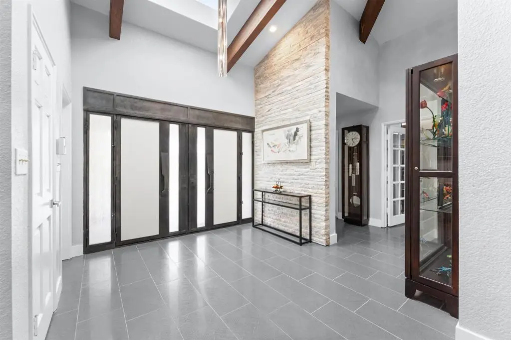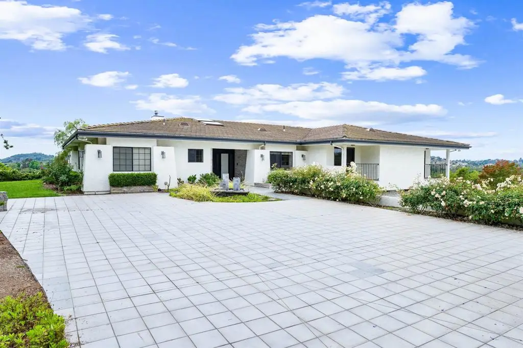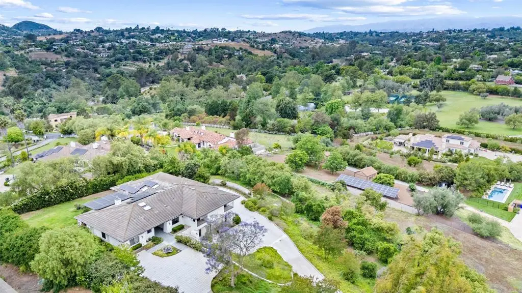 Welcome to an extraordinary lifestyle in Fallbrook's prestigious Rolling Hills gated community, offering privacy and security with 24-hour guard service. Enter through beautifully landscaped grounds featuring tranquil water features and lush park-like settings. Enjoy access to the clubhouse and tennis courts amid rolling hillsides. This impeccably modernized estate sits on 2.65 fully fenced acres, perfect for gatherings and includes a sprawling orchard of avocados and fruit trees, irrigated mainly by a well with a new pump, filter, motor, and reservoirs installed in 2023. Step inside to a formal entry and living room with cathedral-beam ceilings, a sleek linear fireplace, and abundant natural light from skylights. The gourmet kitchen boasts Viking appliances, a grey quartz island, white quartz countertops, a walk-in pantry, and a breakfast area opening to the patio. All secondary bathrooms are newly remodeled with a fresh modern look; the guest bath features a charming retro-modern style. The primary bathroom is fully transformed with a large walk-in shower, oversized rain showerhead, and a luxurious soaking tub. A water softener was installed in 2021. The spacious primary suite includes a private deck with panoramic views. Two additional bedroom suites each have full baths and deck access overlooking the grove. The living room opens to a game room, ideal for entertaining. A new elevator (2024) connects the main level to the oversized 4-car garage with insulated stainless steel doors and ample storage. An attached 500 sq ft ADU with a kitchenette, exterior entrance, and parking adds versatility. Dual A/C and heating systems ensure comfort year-round. Exterior stucco repairs and paint were completed in March 2023. Owned solar panels installed in 2019 provide energy efficiency. Live in one of Fallbrook's most sought-after neighborhoods, close to new wineries, restaurants, golf courses, and just a short drive to beaches and vibrant entertainment. Don't miss this magnificent estate--contact us today to schedule your private tour.