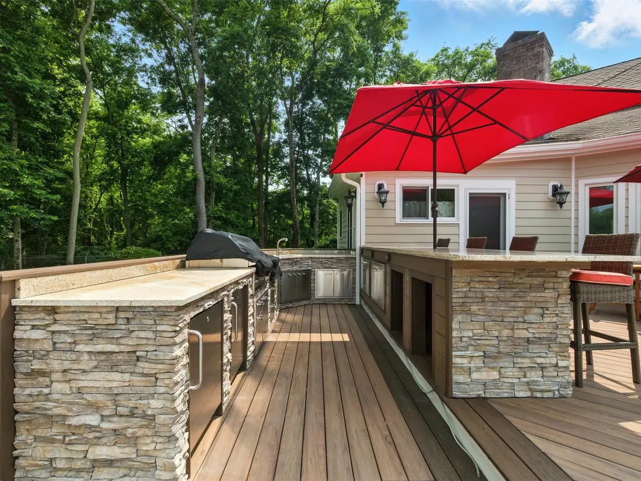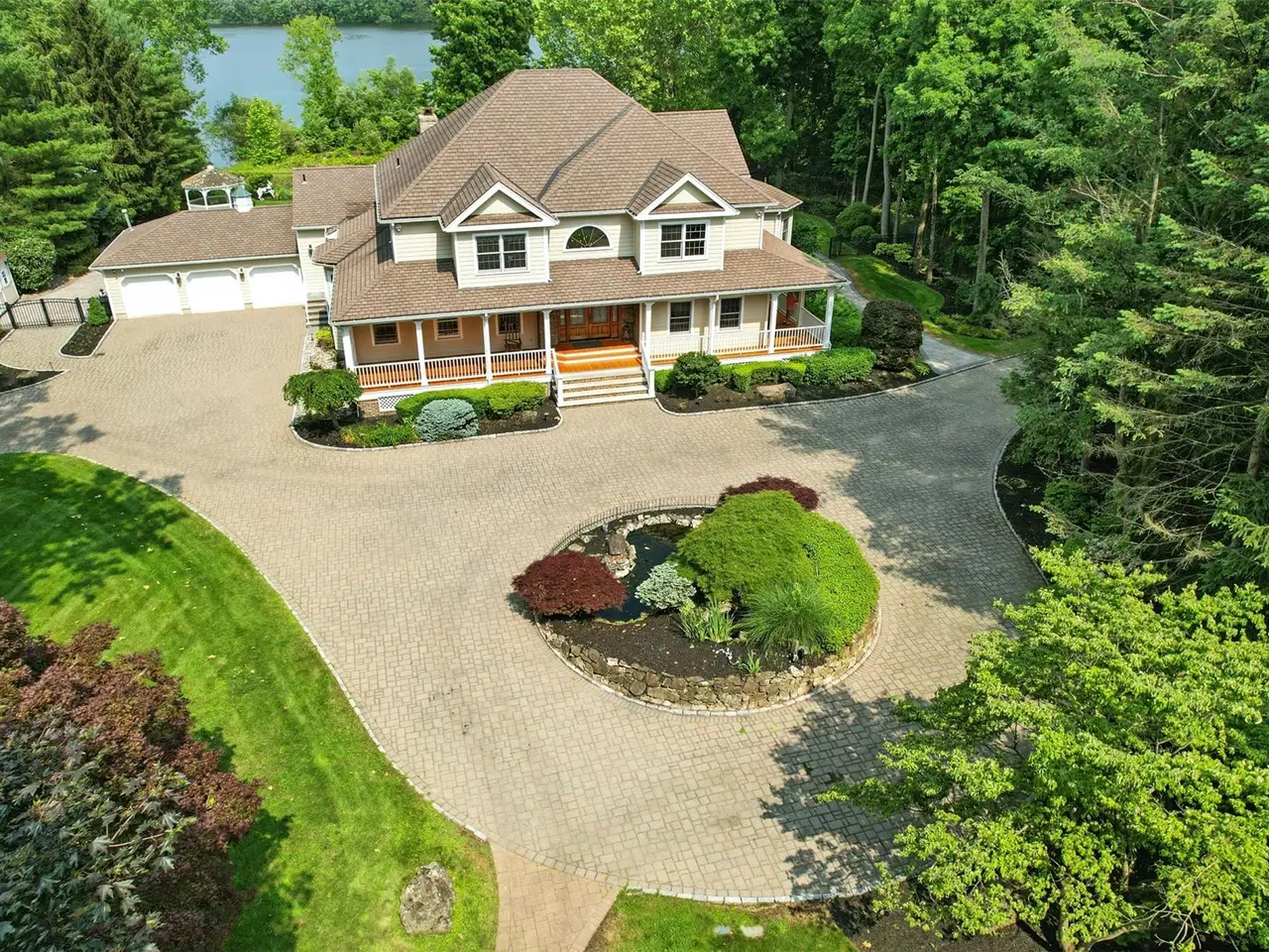 Welcome to Carousel Estate: A Waterfront Sanctuary Less Than 30 Miles from Manhattan. Tucked behind a private gated entrance and surrounded by over 3 acres of lush and thoughtfully designed landscaping, is a rare waterfront estate that offers total seclusion. From soaring eagles to vibrant blue jays, wildlife abounds- making this property feel like a world all your own. This one-of-a-kind estate offers sweeping views of Lake Tappan from nearly every angle. The circular paver driveway makes a grand first impression, featuring a landscaped center island with a koi pond. The layout offers ample parking and effortless access to three-car garage, all surrounded by lush lawns and mature trees providing both privacy and curb appeal. The grounds are a true resort-like paradise: lounge beside the saltwater pool and spa, dine on the expansive Trek deck with built-in outdoor kitchen, unwind in the custom gazebo, or gather around the fire pit under the stars all while enjoying complete privacy and sweeping waterfront views. This grand residence spans approximately 6,000 square feet, showcasing a masterful blend of classic elegance and modern luxury, all set against the backdrop of Lake Tappan. Glass-inlaid entry doors open to a bright and airy two-story foyer where soaring ceilings, an elegant chandelier, and a dual staircase make a lasting first impression. Natural light pours through the arched transom window above, setting a welcoming tone as the home opens into the formal dining room and living spaces beyond. The right of the foyer features a sunken formal living room with oversized windows and detailed wood trim. Formal dining room offers timeless style with inlay hardwood floors and a crystal chandelier. At the heart of the home, the custom Ethan Allen kitchen features warm wood cabinetry, granite countertops, and a large center island with counter seating. High-end Wolf and Sub-Zero appliances are seamlessly integrated, and a side entrance off the driveway provides easy everyday access. The kitchen opens to the casual dining area and continues into a sunlit gathering room with vaulted ceilings, exposed wood beam accents, and a striking floor-to-ceiling stone fireplace. A wall of windows including elegant arched transoms- fills the space with natural light and captures peaceful lake views. French doors lead directly to the deck making indoor-outdoor living feel effortless. The first floor primary suite offers vaulted ceilings, a stone fireplace, and direct access to the back deck and lake views. The spa-inspired en-suite bath features a jetted soaking tub, steam shower, and double vanity. Two separate home offices on the main level offer versatility for work, reading, or creative space. One features custom built-ins, wood flooring, and French doors for privacy, while the other is wrapped in windows with panoramic views of the lake and pool. The second level offers three generously sized bedrooms- two joined by a Jack-and-Jill bath, and one with its own private en-suite. A versatile upstairs den provides the perfect spot for movie nights, quiet study, or simply unwinding. Tucked away on the third floor, this spacious suite with its own full bath and peaceful lake views offers a quiet retreat. Whether used as a guest sanctuary, creative studio, or additional bedroom, it provides privacy, comfort, and flexibility. The spacious basement offers endless potential, a blank canvas of approximately 3000 additional sq ft. Bonus features include a security camera system, alarm system, sprinkler and landscape lighting systems, new landscaping, multi-zone high-efficiency heating with a backup boiler, five-zone high-efficiency cooling with UV lights, a third-floor sprinkler system and so much more. Subdivision potential adds even more long-term value. Ideally located on a quiet cul-de-sac in the award-winning Pearl River school district, Carousel Estate offers the rare opportunity to live an extraordinary lifestyle every day.