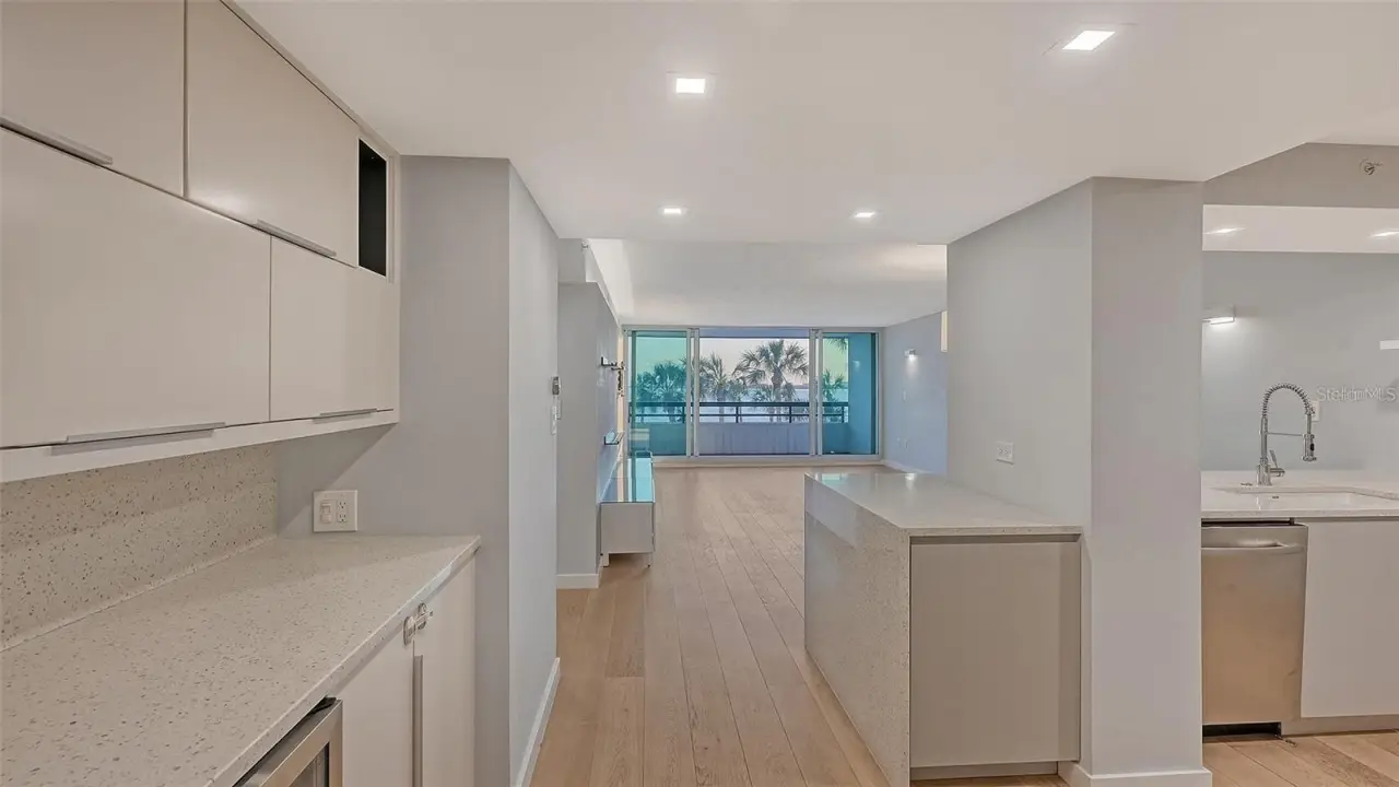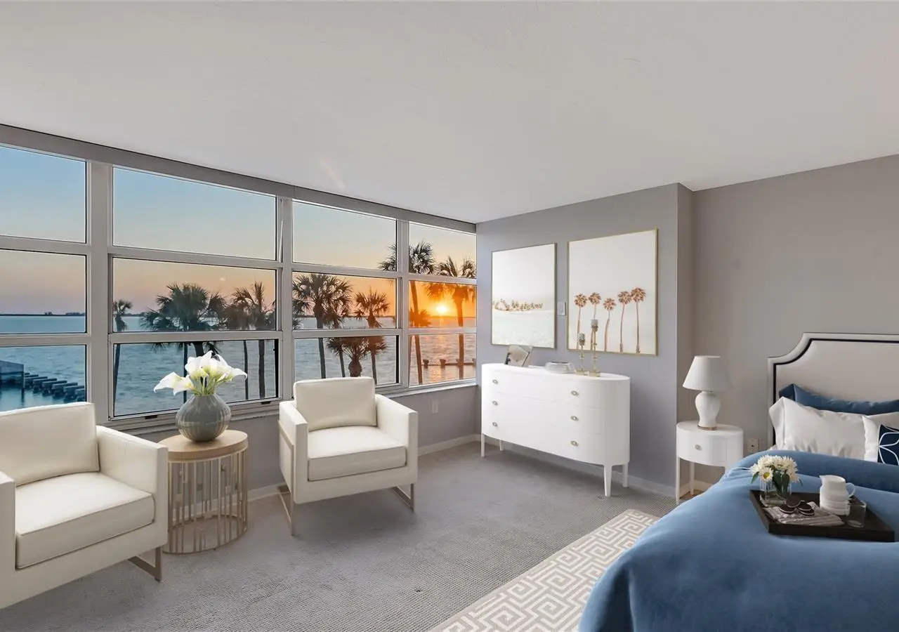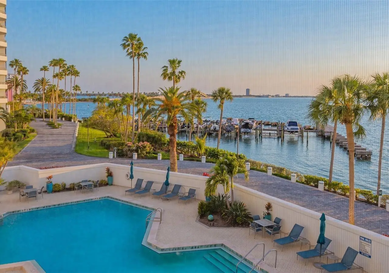 One or more photo(s) has been virtually staged. Direct Bayfront living in the heart of Sarasota at Condo on the Bay. This fully renovated 2 bed/2 bath residence features beautiful panoramic views of the Sarasota Bayfront with breathtaking sunsets over LBK and Ringling Bridge. Step into the inviting Great Room - greeted by a wall of impact glass floor-to-ceiling sliding doors that seamlessly blend the outdoors in, opening to a spacious balcony overlooking one of two residents pools, just steps from one of the long piers and boat slips. Interior features include White Oak engineered hardwood flooring flowing throughout the main living space, complemented by custom built-in cabinetry and a dry bar with a wine refrigerator for easy entertaining. A chef's delight, the modern kitchen features Elite Woodwork of Sarasota Cabinetry, stainless steel appliances including an induction cooktop and built-in wall oven and microwave, quartz countertops, Walnut wood backsplash, built-in pantry, and breakfast bar for casual dining. A conveniently located laundry closet with full-size stackable front-loading washer and dryer completes the kitchen. A true oasis, the master suite has serene water views, remote-controlled Hunter Douglas shades, and plenty of storage space with a large walk-in customized closet plus a full entry wall of built-in cabinetry. The updated en-suite bathroom features dual floating vanities, modern floor-to-ceiling tile, a walk-in shower with frameless glass enclosure and multiple shower heads. The generously sized secondary bedroom boasts double built-in closets and a secondary bathroom with a floating vanity, walk-in shower with a frameless glass enclosure, and a built-in linen closet. New Ruud A/C in March 2023. Set directly on Sarasota Bay, the highly sought after community offers a lifestyle of sophistication and serenity. A range of amenities include staffed 24-hour security gated guardhouse, 'sky lobbies located on a number of floors throughout, two resort-style pools overlooking the bay, two fitness centers, tennis courts, pickleball courts, concierge services and boat/kayak docks with a fishing pier. This pet-friendly Tower II residence includes one assigned under-building parking space with secure access and storage. Just steps away from Sarasota Bay Park and the vibrant culture and arts scene of Downtown Sarasota, world-class dining, shopping and entertainment. A short drive to St. Armand's Circle and Lido Beach. Don't wait - it is time to experience a luxurious urban life from the 3rd floor of Tower II, in the Bayfront heart of Downtown Sarasota!