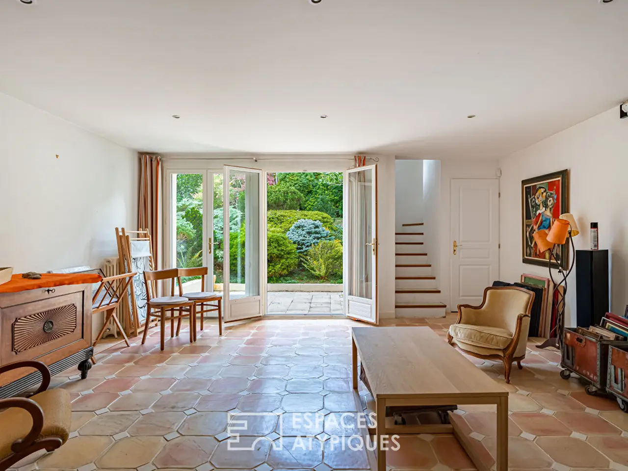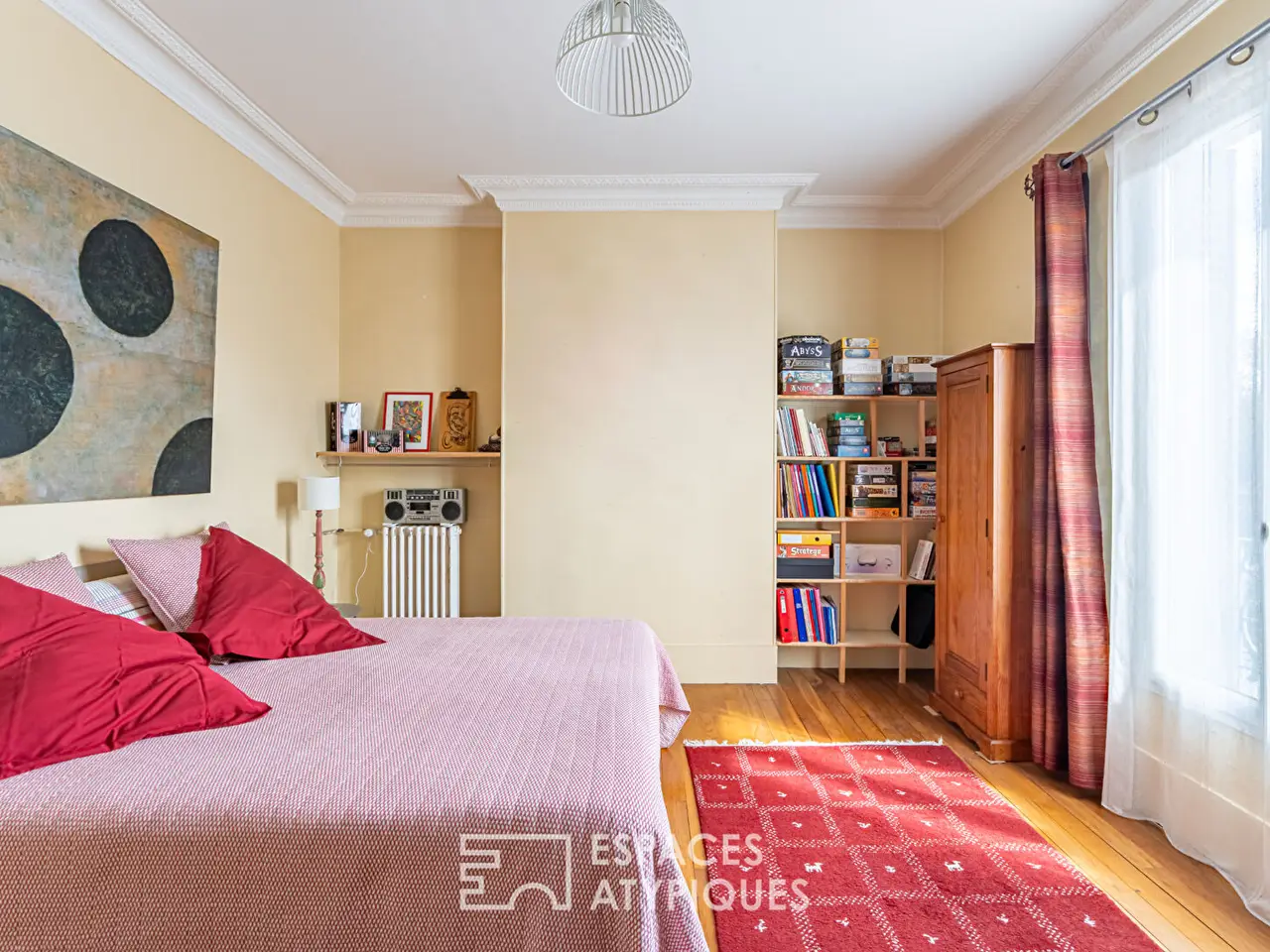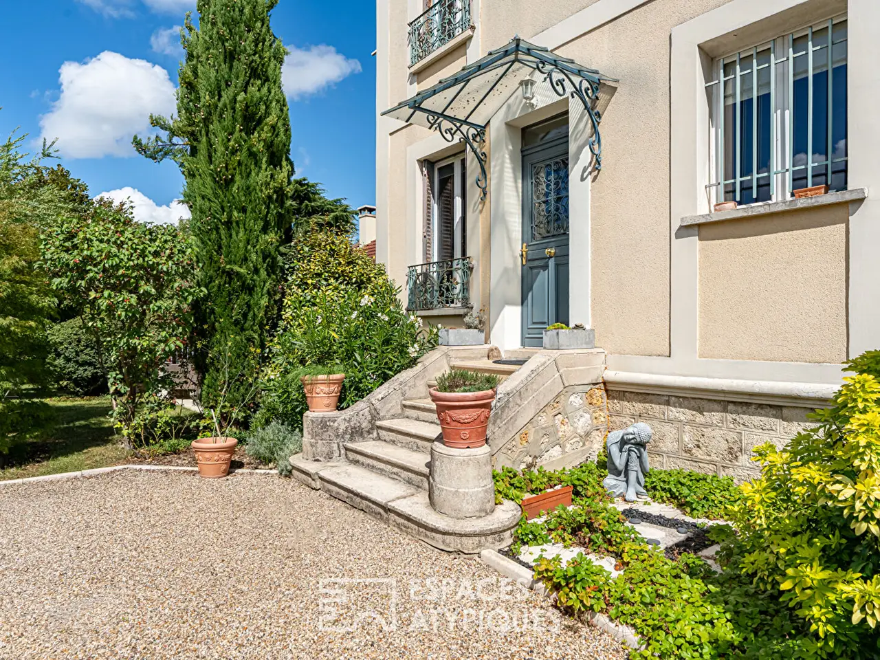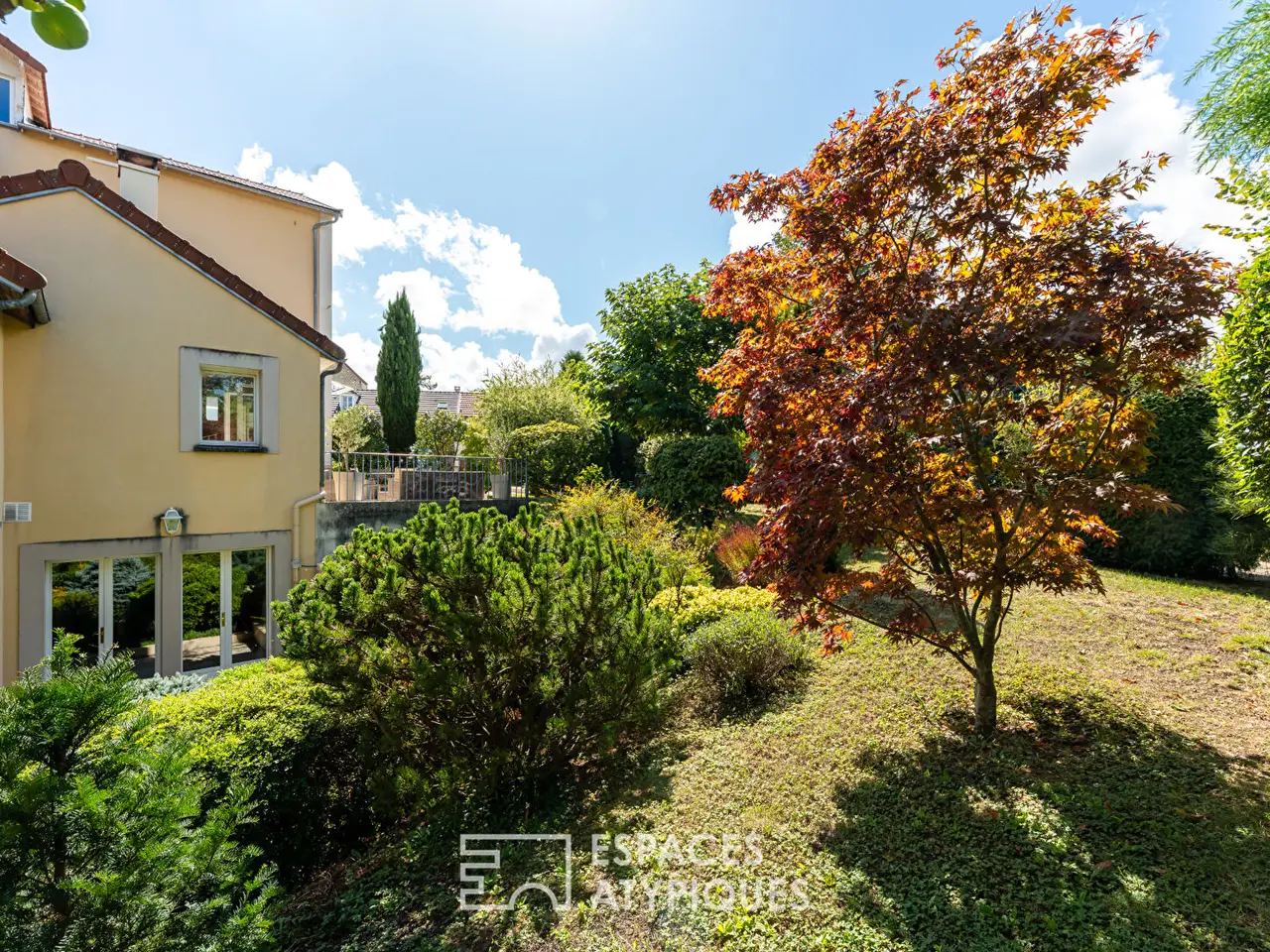 In a sought-after area, hidden from view, this pretty bourgeois house has benefited from a beautiful extension that opens onto a 722 sqm garden, enclosed and quiet. After a flight of steps, the wide entrance, decorated with cement tiles and old parquet flooring, offers a charming independent kitchen with triple exposure, then continuously, a 17 sqm bedroom which benefits from a shower room. The reception room of 44 sqm bathed in light, decorated with its fireplace, opens onto a large terrace surrounded by its garden beautifully arranged with flowers and shrubs subtly shaded. The lower level has a generous bedroom/workshop of 44 sqm facing its private terrace. This beautiful volume can easily be organized into a suite with its bathroom or into an office for an independent profession, with its exterior access. The first floor is organized around the landing which distributes three pretty bedrooms of 11, 12 and 17 sqm which share a bathroom. The last floor consists of a landing which leads to a large bedroom with storage of 23 sqm, an office and an attic games room of 18 sqm. Finally, the basement includes a boiler room, cellar and two storage rooms. The garden allows two above-ground parking spaces (electric terminal). A rare property, combining character, comfort and prime location, in a calm and green environment, in the immediate vicinity of many amenities. ENERGY CLASS: E / CLIMATE CLASS: E. Estimated average amount of annual energy expenditure for standard use, established from 2021 energy prices: between EUR5,040 and EUR6,880 Nursery and elementary schools 3 and 5 min walk away. N 13, A14 5 min by car, Tram 13 9 min on foot, International High School 9 min on foot, REF. 12700 Additional information * 8 rooms * 6 bedrooms * 1 bathroom * 1 bathroom * Outdoor space : 722 SQM * Parking : 2 parking spaces * Property tax : 3 294 € Energy Performance Certificate Primary energy consumption e : 278 kWh/m2.year High performance housing