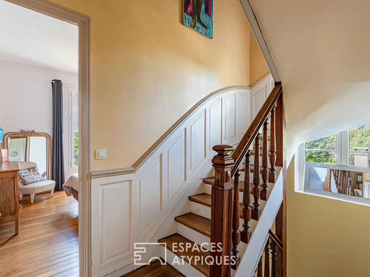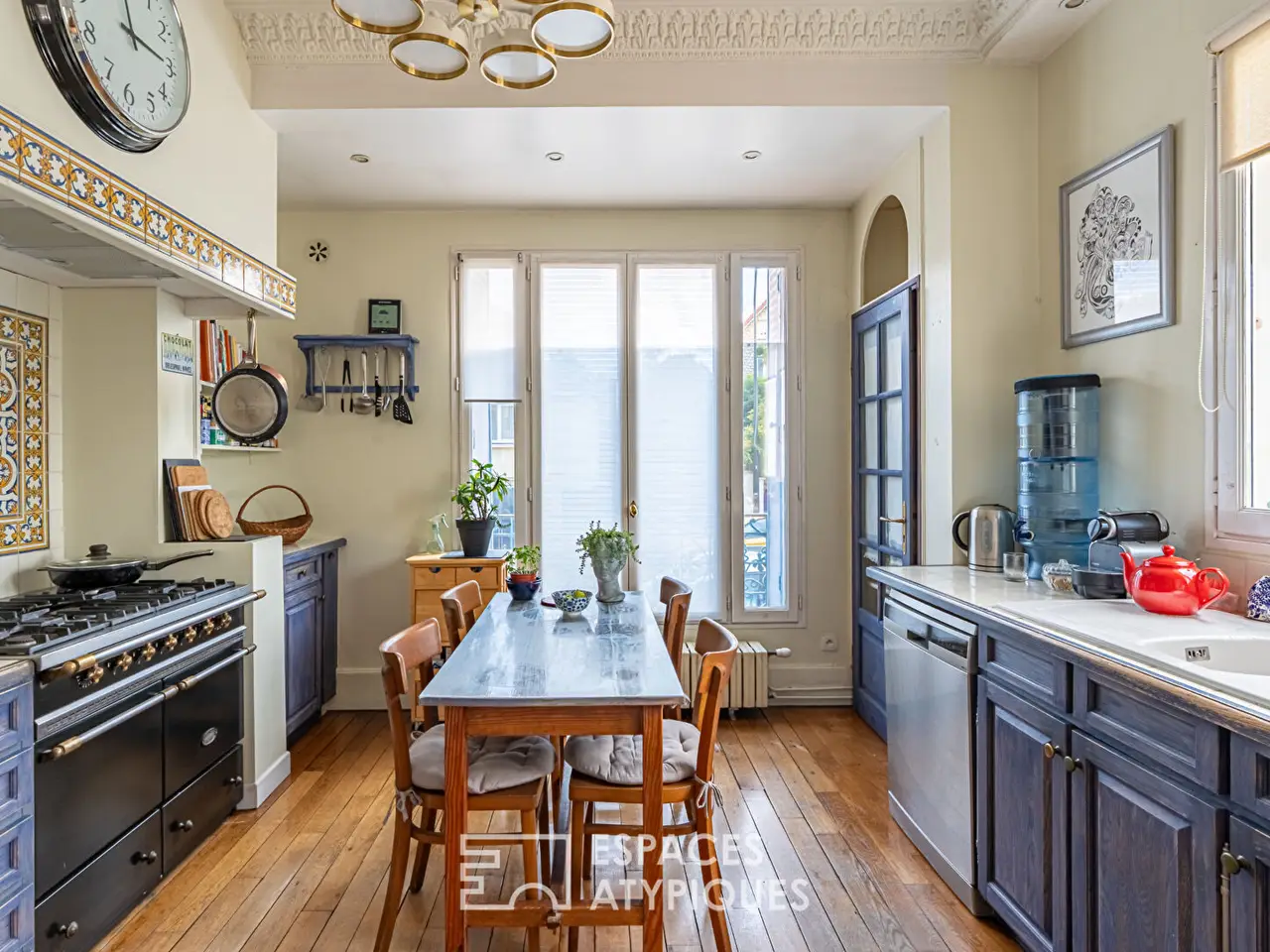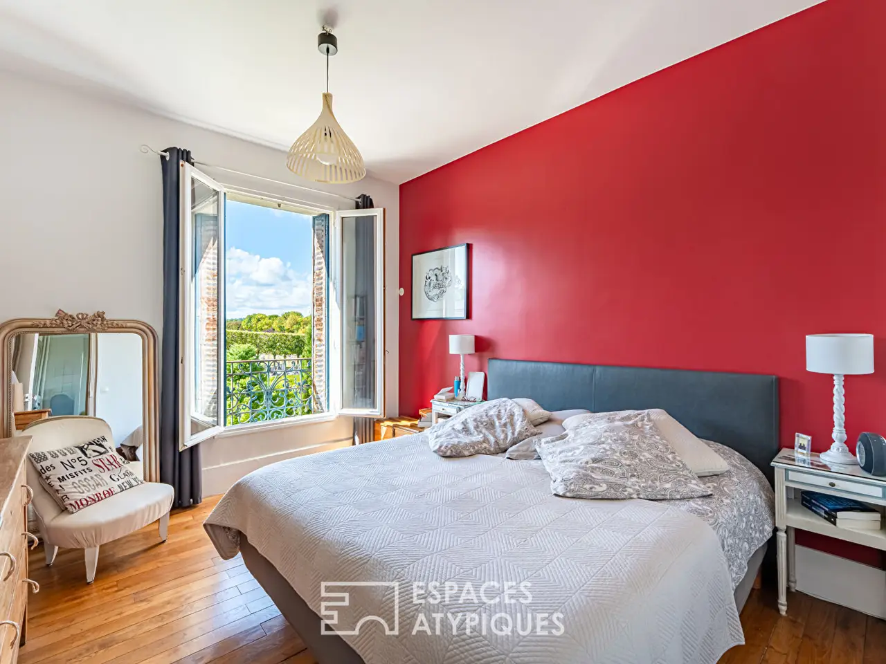 In a sought-after area, hidden from view, this pretty bourgeois house has benefited from a beautiful extension that opens onto a 722 sqm garden, enclosed and quiet. After a flight of steps, the wide entrance, decorated with cement tiles and old parquet flooring, offers a charming independent kitchen with triple exposure, then continuously, a 17 sqm bedroom which benefits from a shower room. The reception room of 44 sqm bathed in light, decorated with its fireplace, opens onto a large terrace surrounded by its garden beautifully arranged with flowers and shrubs subtly shaded. The lower level has a generous bedroom/workshop of 44 sqm facing its private terrace. This beautiful volume can easily be organized into a suite with its bathroom or into an office for an independent profession, with its exterior access. The first floor is organized around the landing which distributes three pretty bedrooms of 11, 12 and 17 sqm which share a bathroom. The last floor consists of a landing which leads to a large bedroom with storage of 23 sqm, an office and an attic games room of 18 sqm. Finally, the basement includes a boiler room, cellar and two storage rooms. The garden allows two above-ground parking spaces (electric terminal). A rare property, combining character, comfort and prime location, in a calm and green environment, in the immediate vicinity of many amenities. ENERGY CLASS: E / CLIMATE CLASS: E. Estimated average amount of annual energy expenditure for standard use, established from 2021 energy prices: between EUR5,040 and EUR6,880 Nursery and elementary schools 3 and 5 min walk away. N 13, A14 5 min by car, Tram 13 9 min on foot, International High School 9 min on foot, REF. 12700 Additional information * 8 rooms * 6 bedrooms * 1 bathroom * 1 bathroom * Outdoor space : 722 SQM * Parking : 2 parking spaces * Property tax : 3 294 € Energy Performance Certificate Primary energy consumption e : 278 kWh/m2.year High performance housing