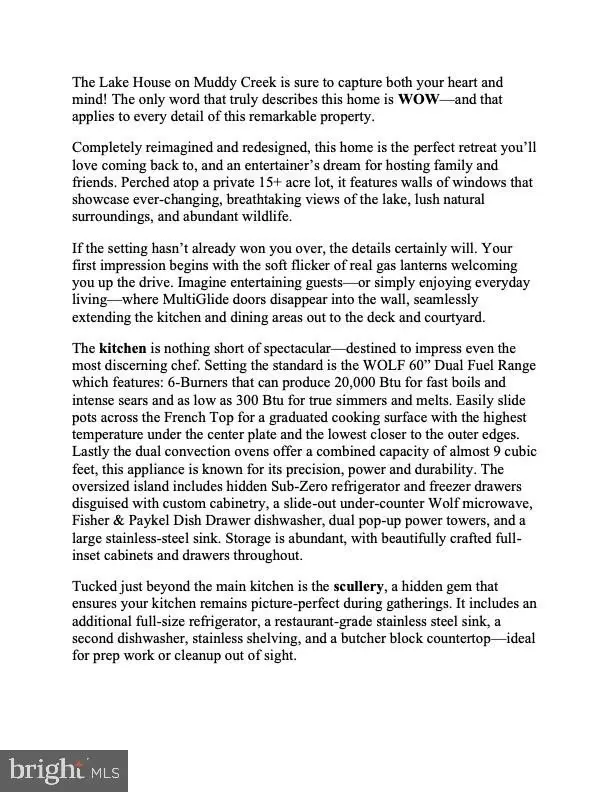 The Lake House on Muddy Creek - A Truly One-of-a-Kind Retreat Perched on a private 15+ acre lot with sweeping lake views from every angle, this completely reimagined home offers a rare blend of tranquility and jaw-dropping luxury with unmatched convenience. Key Highlights: · Walls of windows + disappearing MultiGlide doors blur the line between indoors and out - perfect for everyday serenity or hosting unforgettable gatherings. · Chef's dream kitchen featuring a 60""� WOLF Dual Fuel Range, hidden Sub-Zero fridge/freezer drawers, oversized island, scullery with second dishwasher & fridge, and a perfectly placed wet bar with pass-through to the screened porch. · Screened porch with real gas lanterns and premium ipe decking set the tone for magical evenings outdoors. · Soaring living room with vaulted ceilings, custom built-ins, and slate fireplace (gas-ready). · Main-level primary suite with spa-style bath, marble walk-in shower, floating double vanity, and laundry-ready walk-in closet. · Lower level built for fun - radiant heated floors, wood-burning fireplace, huge family/game room, full guest suite, and large laundry/storage room. Additional Perks: · European-style vestibule entry with red doors & custom tile. · Stunning guest bath with hand-laid tile & slate walk-in shower. · Multiple patios for sunrise & sunset lounging. · Wildlife, lake views, and absolute privacy - all just beyond your windows. You're just: · 5 minutes to Hartge Yacht Harbor - perfect for Chesapeake Bay boaters. · Surrounded by local favorites like Pirates Cove and Stan and Joes Riverside for waterfront dining and relaxed weekends. · 10-15 minutes to shopping and errands in Edgewater (grocery, Target, restaurants, coffee shops). · 20 minutes to Downtown Annapolis for dining, festivals, and Naval Academy charm. · 35-40 minutes to Washington, D.C. - ideal for commuters. · Close to major routes (Rt 2, Rt 50, I-97) and 30 minutes to BWI Airport for effortless travel. If you've been looking for true privacy without sacrificing convenience, this home delivers it all - a world away when you're here, yet minutes from everywhere you need to be. Coming Soon status may likely change to Active status prior to the date noted in MLS. Additional photos and details will soon be uploaded. Final Walkthrough Tour is now uploaded.