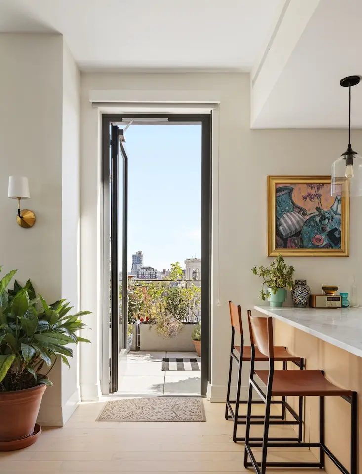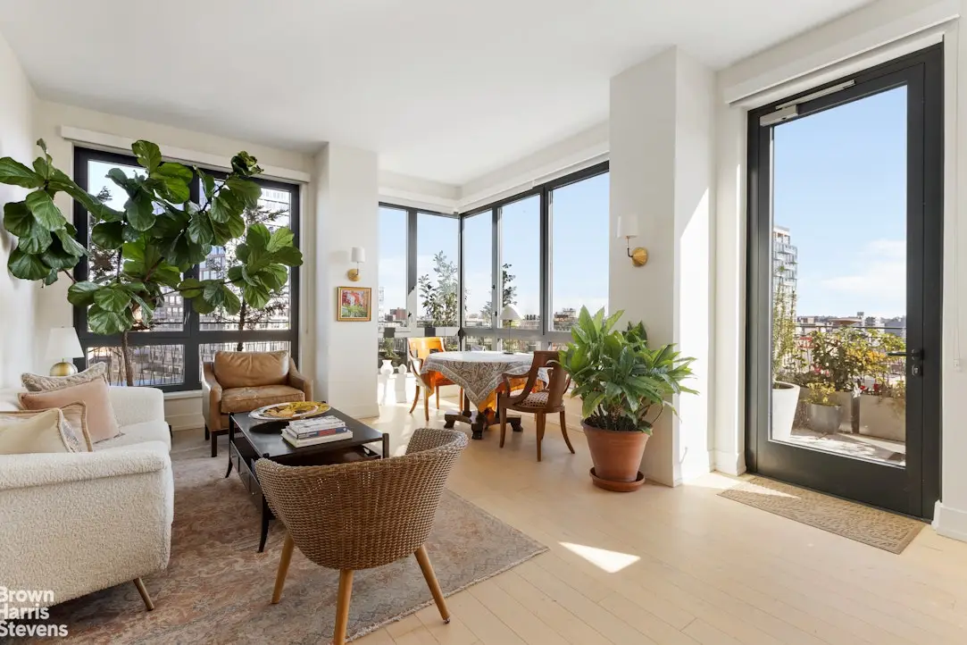 Perched on the northeast corner of one of Prospect Heights' premier full-service condominiums, residence 901 is an oversized, light-filled, modern sanctuary with panoramic eastern and northern views and a sprawling 463SF private terrace, perfect for morning coffee, alfresco dining, or simply taking in the sunrise. Floor-to-ceiling windows flood the 1308 square feet of the home with natural light, highlighting its elegant finishes and airy layout. The gourmet kitchen is a dream for both everyday living and entertaining, featuring a full suite of Miele appliances, sleek custom cabinetry, and a waterfall countertop island offering additional seating and prep space. A massive walk-in coat closet anchors the entryway, ensuring an organized and functional home. The gracious northern-facing primary suite features a large walk-in closet and a spa-inspired en-suite bath, while the guest bedroom sits beside a beautifully appointed full bathroom. Additional conveniences include an LG washer and dryer and ample built-in storage throughout. Residents of 550 Vanderbilt Avenue enjoy a curated collection of luxury amenities, including a 24-hour doorman and concierge, state-of-the-art fitness center, yoga and meditation studios, children's playroom, resident lounge, and a landscaped roof deck with sweeping views of Brooklyn and Manhattan. Perfectly situated in Prospect Heights, this home offers immediate access to some of Brooklyn's most beloved destinations, including Prospect Park, the Brooklyn Botanic Garden, and Barclays Center. A dynamic dining and shopping scene surrounds you, with neighborhood favorites just minutes away. Nearby 2, 3, B, Q, and C subway lines make commuting effortless, connecting you to Manhattan and beyond with ease.