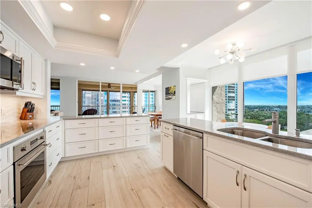 Immerse yourself in the prestigious beachfront lifestyle of Park Shore at the upscale La Mer tower. This beautifully maintained and tastefully updated 10th-floor residence offers 2,226 square feet of living space, featuring two bedrooms and two bathrooms with expansive views of the Gulf reaching all the way to Sanibel Island, and pristine white sand beaches. Floor-to-ceiling windows on three sides and a large, screened lanai flood the interior with natural light, offering breathtaking panoramas from sunrise to sunset. The well-designed floor plan includes a spacious primary suite with abundant closet space, a separate breakfast nook off the kitchen, and a wet bar ideal for entertaining. Additional features include electric hurricane shutters and partial impact glass for peace of mind and a deeded parking space. La Mer is one of Park Shore's premier buildings, offering a guard-gated entry, on-site management, 24-hour security, a resort-style pool and spa, a fitness room, and available guest suites. Residents enjoy access to the private Park Shore Beach promenade and the option to lease or purchase a boat slip at the Venetian Bay Yacht Club. Ideally located just across from the renowned shopping and dining of Venetian Village and a short drive to the vibrant cultural experiences of Fifth Avenue South, Third Street South, Waterside Shops, and Mercato, La Mer offers effortless access to the very best of Naples' world-class lifestyle.