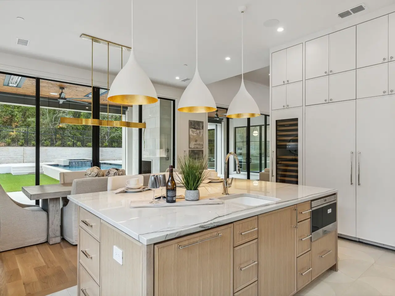 Discover the charm of this exquisite Heritage Home in the sought-after gated community of The Knolls in Westlake. Enter through the breathtaking foyer adorned with wide plank white oak floors, leading you to a striking floating staircase. The spacious design allows for gatherings, while the sophisticated kitchen, equipped with soft-close cabinets and drawers, elegant quartzite countertops, designer lighting, and top-of-the-line Wolf-SubZero appliances, appeals to those with a taste for luxury. Experience the catering kitchen equipped with an ice maker, steam oven and warming drawer. Indulge in the opulent master suite boasting a custom closet and a lavish bathroom featuring Calacatta Gold Marble with his and her vanities and a steam shower. Step into the backyard and find a secluded paradise bordered by a lush greenbelt, featuring a custom pool and spa. The covered patio, enhanced with motorized screens, heaters, and an outdoor kitchen, sets the stage for unforgettable summer evenings.
