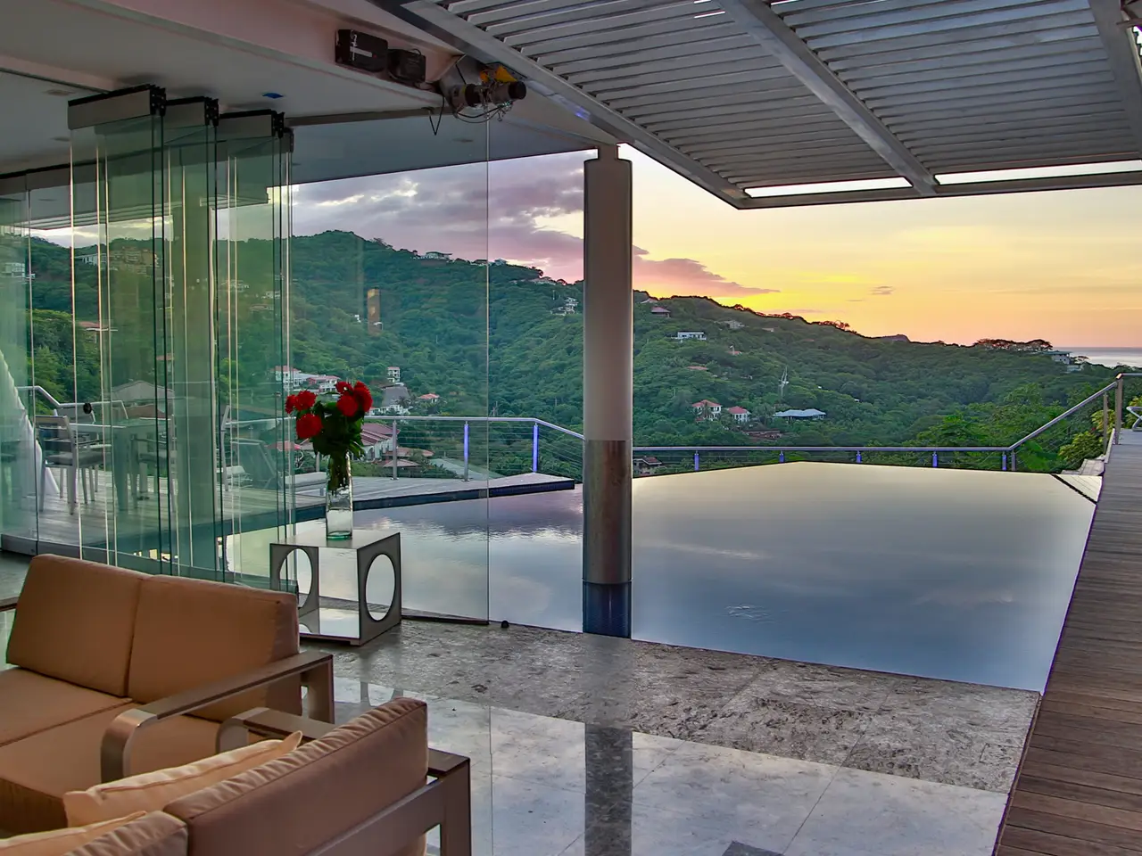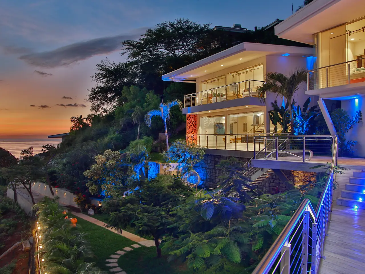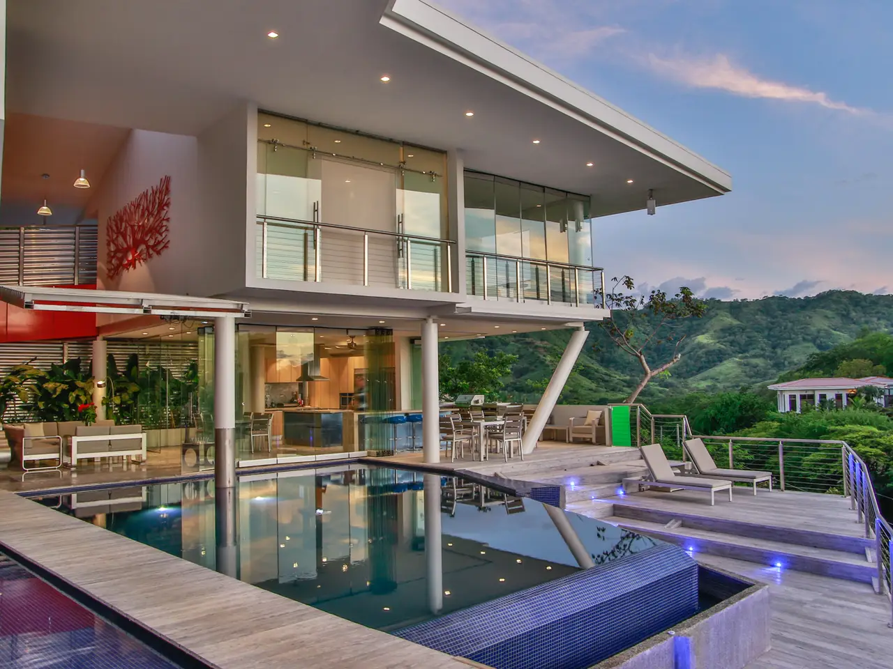 Welcome to Malinche Palace, an incredible 8 bed, 8.5 bath income producing ocean view home perched above the Pacific in Playa Ocotal in Guanacaste, Costa Rica. Experience breathtaking views of the ocean and mountains in almost every direction. Modern design meets comfortable indoor outdoor living, and has the capacity to cater to large groups. This gorgeous property has 12% net returns and has many rentals on the books! From the moment you enter you will discover an open living space connecting the large kitchen and dining and entertaining areas, surrounded by unique floor to ceiling glass walls that open completely, allowing views in every direction. The kitchen is sleek, stylish and modern, designed to keep up with the gourmet and look amazing. The walls open onto the outdoor living area and the multi-level terraces around the infinity pool with its beautiful teak walkway. Imagine having dinner out here every night and listening to the tropical sounds and the waves. The art deco style orange staircase leads to 4 bedrooms, each with unique mosaic tiled ensuite bathrooms and walls of glass with gorgeous views. Most open onto a private veranda overlooking the terraces, pool and tropical gardens below. The stunning coastal views from the principal bedroom encompass mountain, ocean and the boats in the bay below. The separate guest house has a full kitchen, living and dining area that is open and spacious, and well connected to the outdoors with walls of glass doors to capture the amazing views for your guests’ enjoyment. The 2 guest bedrooms also feature ensuites and private verandas. There is a ground floor garden suite that is handicap accessible and a large media room. Last, but not least, there is an incredible honeymoon suite with a wall of glass that overlooks the boats and beach bay of Playa Ocotal. Are you looking for a stunning investment property with amazing returns? Look no more. Casa Malinche Palace is the one for you!