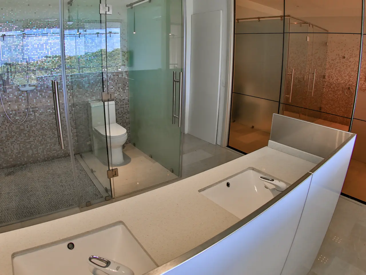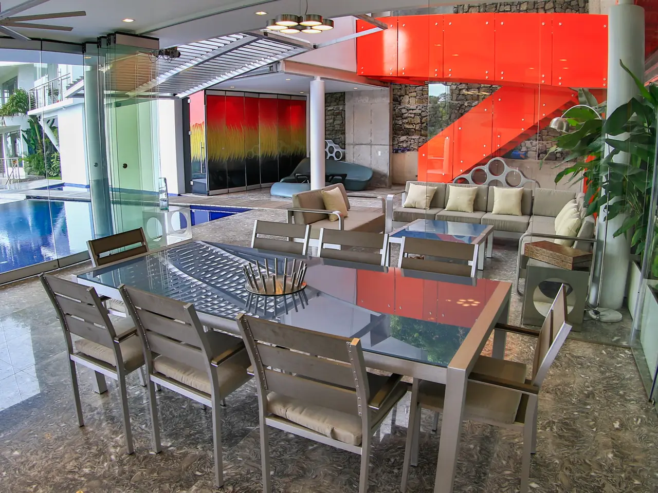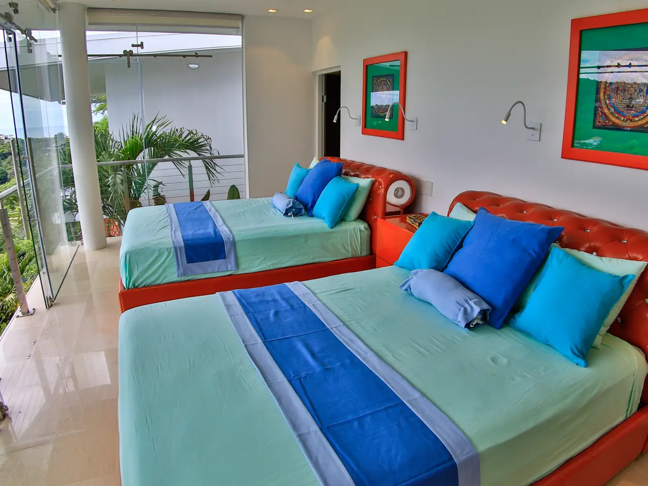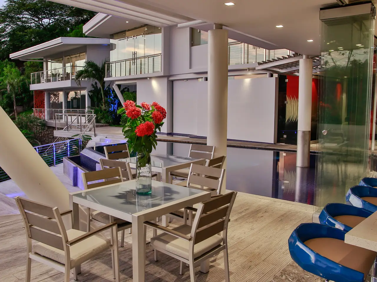 Welcome to Malinche Palace, an incredible 8 bed, 8.5 bath income producing ocean view home perched above the Pacific in Playa Ocotal in Guanacaste, Costa Rica. Experience breathtaking views of the ocean and mountains in almost every direction. Modern design meets comfortable indoor outdoor living, and has the capacity to cater to large groups. This gorgeous property has 12% net returns and has many rentals on the books! From the moment you enter you will discover an open living space connecting the large kitchen and dining and entertaining areas, surrounded by unique floor to ceiling glass walls that open completely, allowing views in every direction. The kitchen is sleek, stylish and modern, designed to keep up with the gourmet and look amazing. The walls open onto the outdoor living area and the multi-level terraces around the infinity pool with its beautiful teak walkway. Imagine having dinner out here every night and listening to the tropical sounds and the waves. The art deco style orange staircase leads to 4 bedrooms, each with unique mosaic tiled ensuite bathrooms and walls of glass with gorgeous views. Most open onto a private veranda overlooking the terraces, pool and tropical gardens below. The stunning coastal views from the principal bedroom encompass mountain, ocean and the boats in the bay below. The separate guest house has a full kitchen, living and dining area that is open and spacious, and well connected to the outdoors with walls of glass doors to capture the amazing views for your guests’ enjoyment. The 2 guest bedrooms also feature ensuites and private verandas. There is a ground floor garden suite that is handicap accessible and a large media room. Last, but not least, there is an incredible honeymoon suite with a wall of glass that overlooks the boats and beach bay of Playa Ocotal. Are you looking for a stunning investment property with amazing returns? Look no more. Casa Malinche Palace is the one for you!