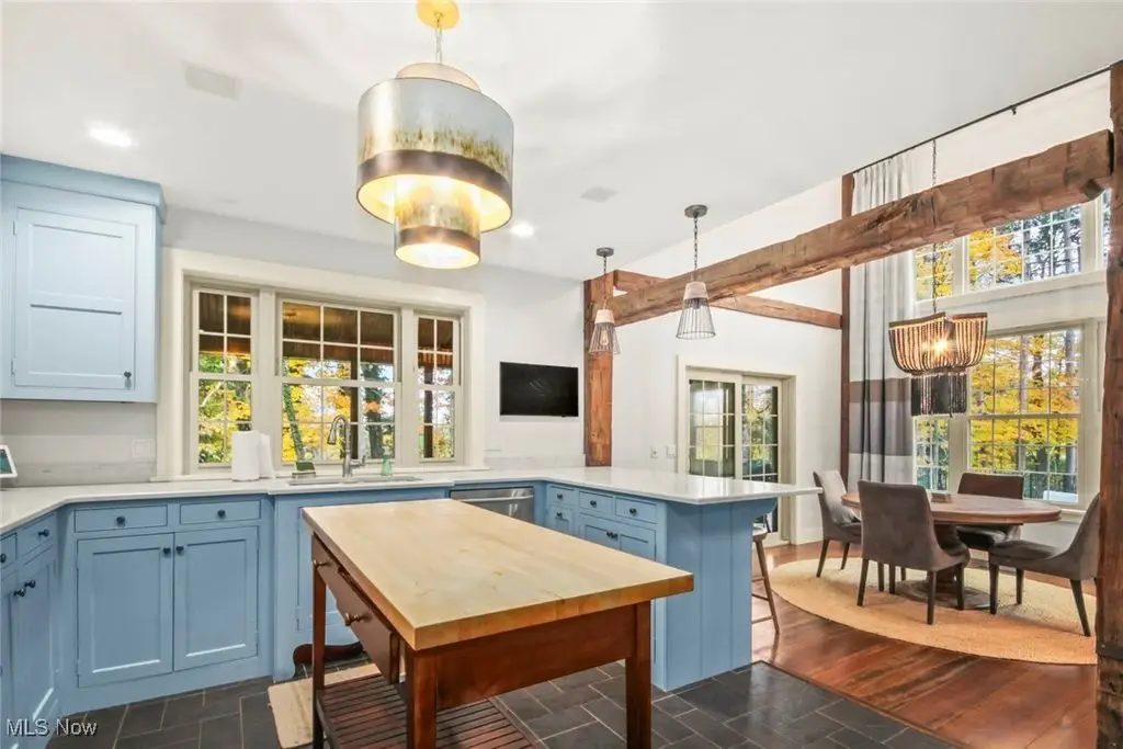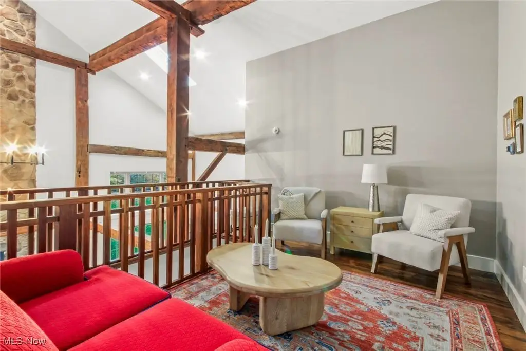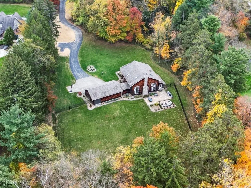Over 3 acres with public utilities in Canfield! From Tippecanoe turn onto the winding driveway with 4 lamp posts to guide you after sunset to this New England style home built with the beams from an old barn that was on the property. This home has incredible views from every window as well as lots of natural light. The Great room is both warm and rustic with wide plank flooring, walls of windows and floor to ceiling stone gas fireplace. Open from great room is a flex space with built-in shelves and cabinetry, that can be a library/dining room or whatever you need it to be. The kitchen is both beautiful and functional with custom made cabinetry, quartz countertops, peninsula with seating, slate flooring, coffee bar and drink area with mini fridge, floating shelves, and a waterline. Morning room/dinette area is bright and has sliding doors to the screened in porch. First floor master bedroom is part of a 480 sq ft addition and total renovation of original Master. A beautifully done hallway leads you to double doors into a luxurious Master suite. Gorgeous hardwood flooring, a custom walk-in closet, office area, and a master bathroom you will want to stay in, with tiled oversized shower, soaking tub, white oak cabinets, floating shelves, and separate commode room. Wood staircase leads to the upstairs open loft with cathedral ceiling, beams, wood railings and wall of wood shelving. Enough space for a nice size sitting room, a quiet place to read. From loft access two bedrooms with each having their own full bathroom. The basement is finished with rec room, bedroom 4 and full bathroom. First floor laundry, front foyer, half bath, three car oversized garage. All lighting fixtures have been replaced ,including the garage lights and the 4 lamp posts along the driveway. The owner has had the landscaping redone and planted new grass. Backyard has a new stone patio with gas firepit, built-in grill with granite top. New beautiful fence in backyard. Tree lined property.