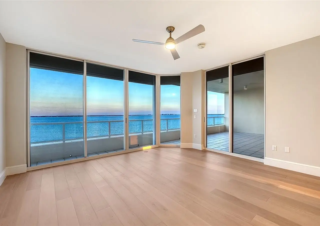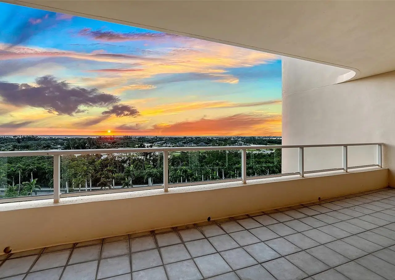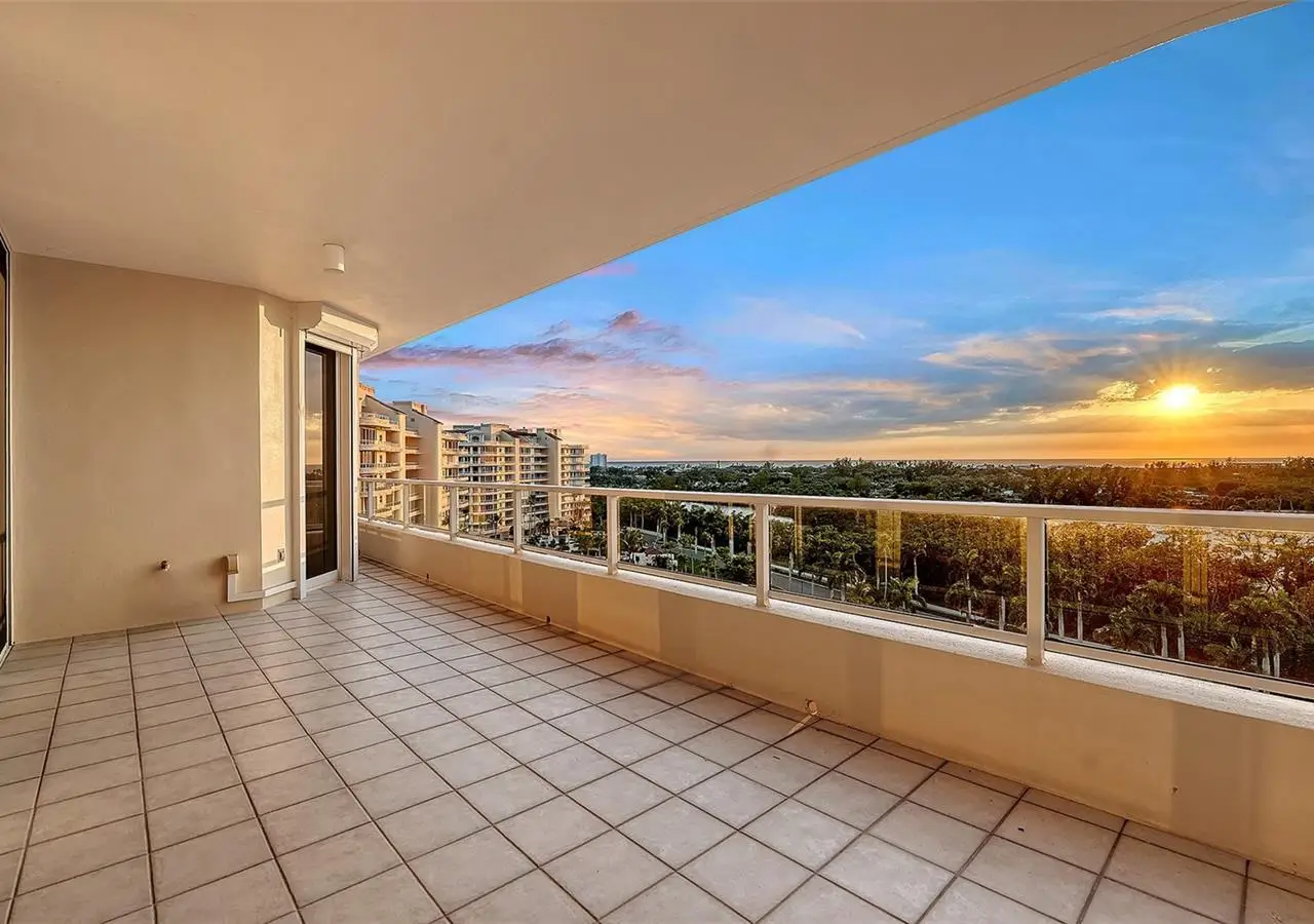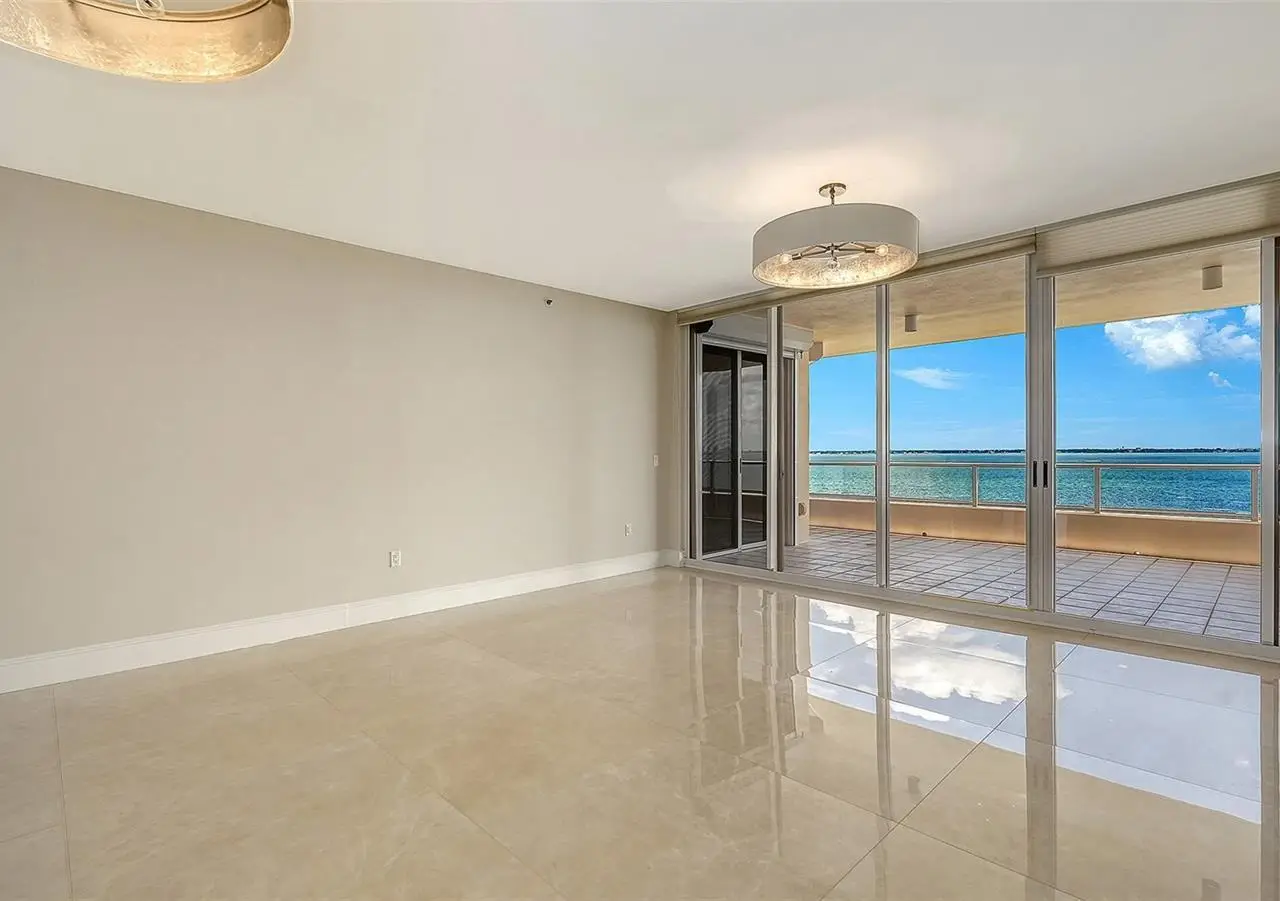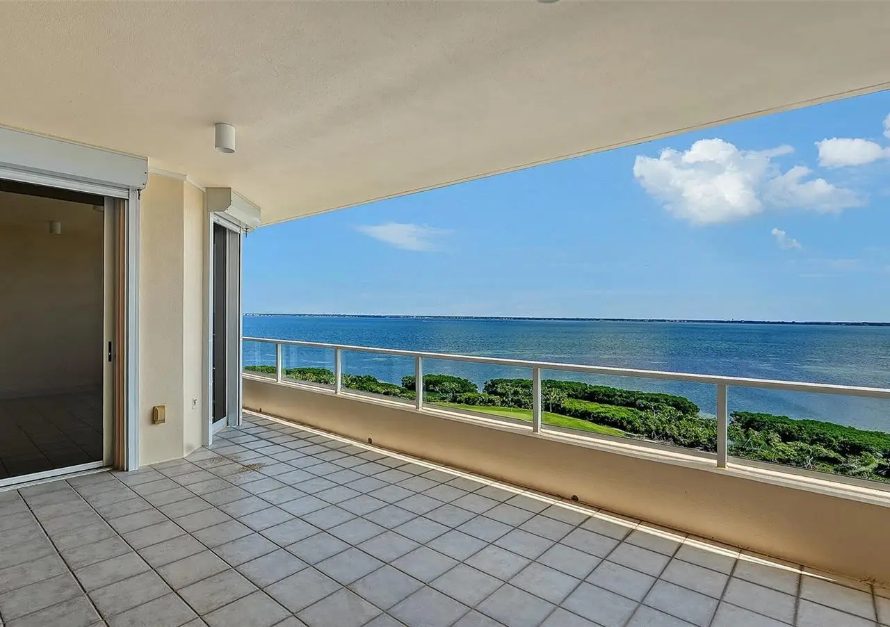 Welcome to Grand Bay. Experience the essence of refined coastal living, where breathtaking panoramic water and city views take center stage. Awaken to the sunrise over Sarasota Bay's skyline with limitless views of the bay and golf course, and unwind with stunning sunsets over the Gulf, an ever-changing display of beauty from every room. Perfectly situated on the 8th floor, this elegant home welcomes you through a private-access, controlled elevator leading to a stunning foyer framed by contemporary glass double doors. The Cayman open floor plan immediately reveals sweeping vistas, while large porcelain tile flooring flows seamlessly through the living areas and onto two outdoor terraces ideal for quiet relaxation. The stunning updated kitchen features two-toned cabinetry, Wolf and Sub-Zero appliances, under-cabinet lighting, quartz countertops, and an inviting breakfast bar. An adjacent eat-in area with floor-to-ceiling sliders opens to a private covered terrace, a perfect setting for entertaining guests and boundless vistas. The primary suite is a lavish retreat, complete with white oak floors, two walk-in closets and a spa-inspired bath showcasing, a soaking tub, glass shower, and dual vanities. The guest suite offers private terrace access for stunning sunset views, complemented by white oak floors and an en-suite bath. Discover versatility with a den/office that doubles as an occasional guest room, providing privacy with elegant pocket doors that separate it from the formal dining room, and a 3rd full bath just steps away. A well thought out conversion has added a built-in office area adding functionality to round out the interior. Residents enjoy various first-rate amenities, including 24-hour guard gates, a clubhouse, two community pools and spas, a large fitness center with saunas, and tennis courts. Stroll the neighborhood's scenic walking paths or enjoy deeded access to the exclusive gated Bay Isles Beach Club offering locker rooms, barbecues, volleyball nets, covered picnic areas and a sandy white beach. Located behind the Bay Isles secure gates, this secluded neighborhood rests on the rolling greens of the Longboat Key Club's golf course. Grand Bay residents find it hard to leave this special community. This residence truly captures the best refined Bay and beach lifestyle - sophisticated, exclusive, and ready to be enjoyed.