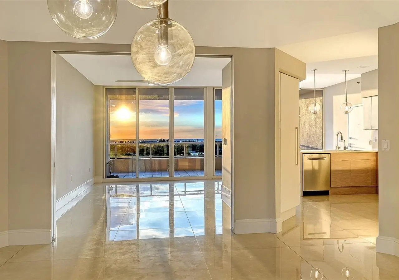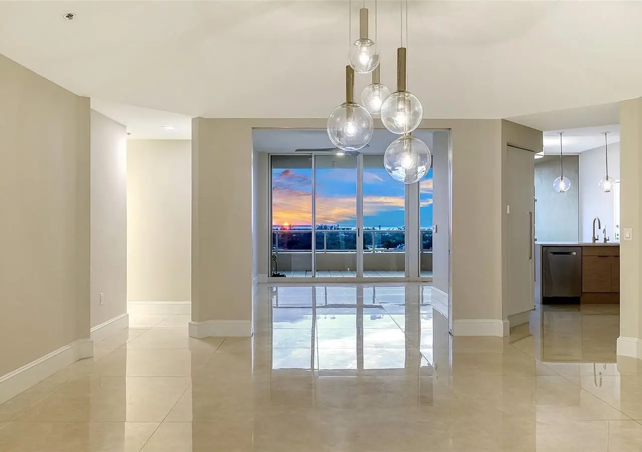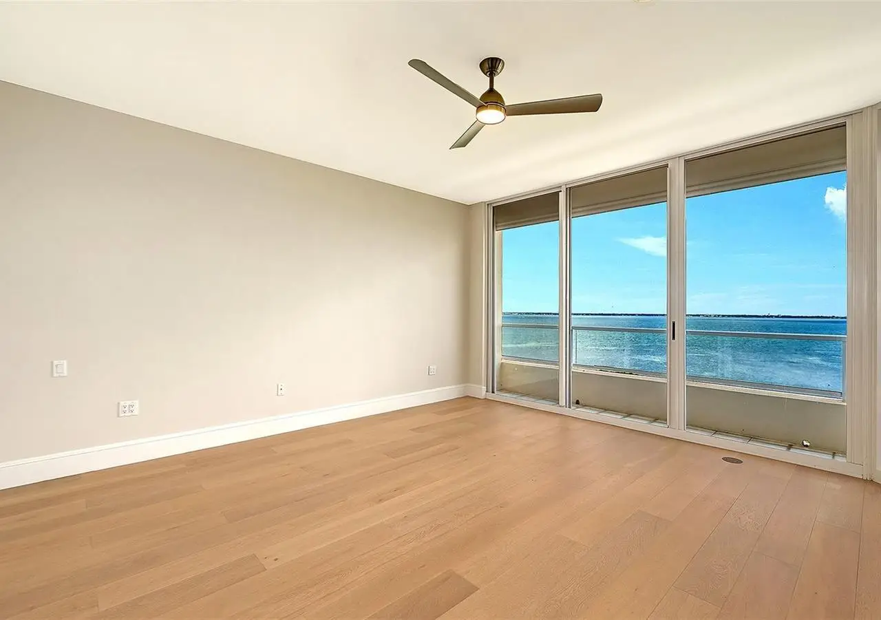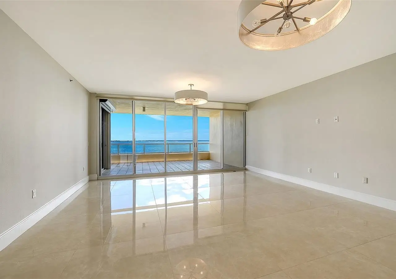 Welcome to Grand Bay. Experience the essence of refined coastal living, where breathtaking panoramic water and city views take center stage. Awaken to the sunrise over Sarasota Bay's skyline with limitless views of the bay and golf course, and unwind with stunning sunsets over the Gulf, an ever-changing display of beauty from every room. Perfectly situated on the 8th floor, this elegant home welcomes you through a private-access, controlled elevator leading to a stunning foyer framed by contemporary glass double doors. The Cayman open floor plan immediately reveals sweeping vistas, while large porcelain tile flooring flows seamlessly through the living areas and onto two outdoor terraces ideal for quiet relaxation. The stunning updated kitchen features two-toned cabinetry, Wolf and Sub-Zero appliances, under-cabinet lighting, quartz countertops, and an inviting breakfast bar. An adjacent eat-in area with floor-to-ceiling sliders opens to a private covered terrace, a perfect setting for entertaining guests and boundless vistas. The primary suite is a lavish retreat, complete with white oak floors, two walk-in closets and a spa-inspired bath showcasing, a soaking tub, glass shower, and dual vanities. The guest suite offers private terrace access for stunning sunset views, complemented by white oak floors and an en-suite bath. Discover versatility with a den/office that doubles as an occasional guest room, providing privacy with elegant pocket doors that separate it from the formal dining room, and a 3rd full bath just steps away. A well thought out conversion has added a built-in office area adding functionality to round out the interior. Residents enjoy various first-rate amenities, including 24-hour guard gates, a clubhouse, two community pools and spas, a large fitness center with saunas, and tennis courts. Stroll the neighborhood's scenic walking paths or enjoy deeded access to the exclusive gated Bay Isles Beach Club offering locker rooms, barbecues, volleyball nets, covered picnic areas and a sandy white beach. Located behind the Bay Isles secure gates, this secluded neighborhood rests on the rolling greens of the Longboat Key Club's golf course. Grand Bay residents find it hard to leave this special community. This residence truly captures the best refined Bay and beach lifestyle - sophisticated, exclusive, and ready to be enjoyed.