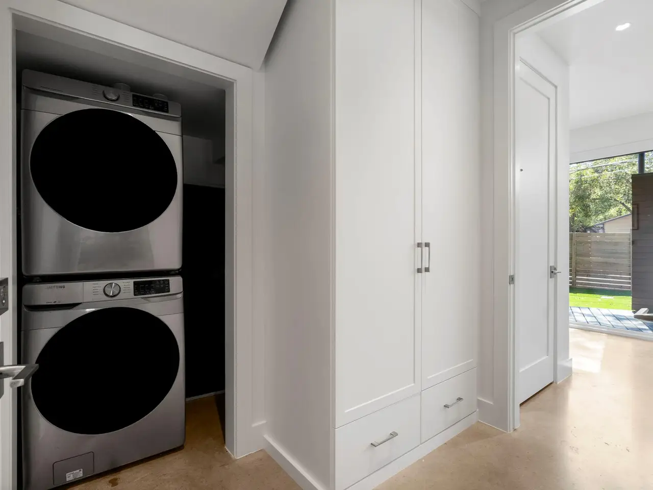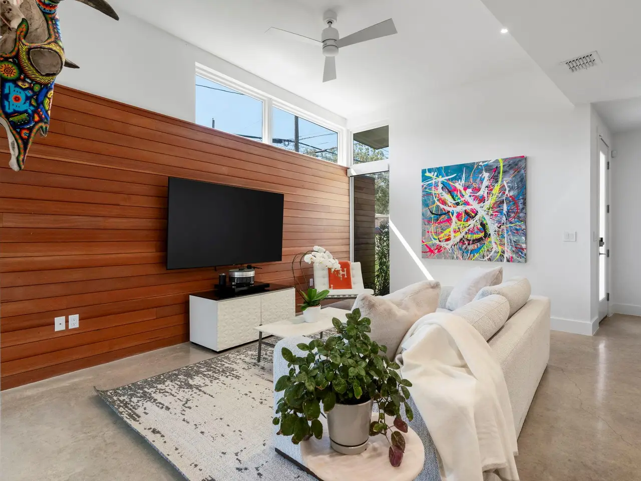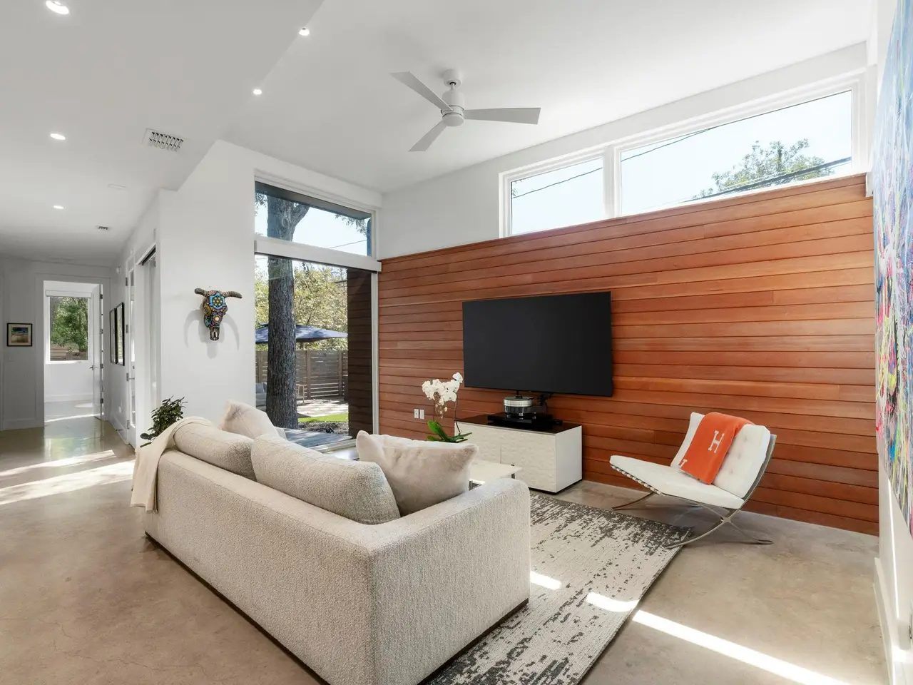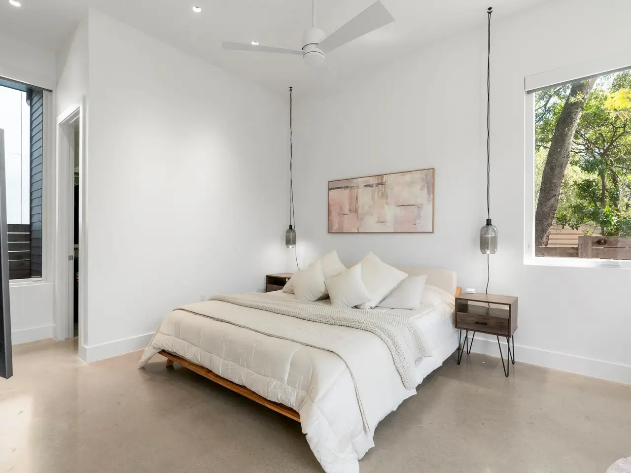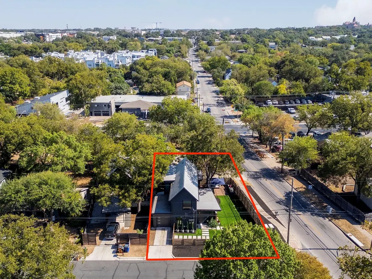 Live the 78704 lifestyle in comfort and style. Situated on a corner lot near South First Street, this modern residence blends convenient, lock-and-leave ease with thoughtful, design-forward upgrades. Tall ceilings and concrete floors ground the main level, while white oak flooring continues upstairs for a warm, cohesive look. The kitchen shines with stainless Bertazzoni appliances, a gorgeous tile backsplash, and an over-sized breakfast island. A $70K Lutron HomeWorks system with Ketra lighting and automated shades elevates every room with tailored light and effortless control.The main-level primary suite features two walk-in closets and a serene, spa-style walk-in shower, and dual raised vanities. Upstairs, a flexible second living room/den/office accompanies two additional bedrooms and a full bath, creating the ideal separation of spaces. Custom cabinetry in the mudroom and hallway keeps daily life streamlined, and the garage was enclosed to create additional protected parking with an EV charging port.Outdoors, the fenced yard is fully turfed, fully irrigated, and designed for gatherings with an extended 475 SF patio and deck beneath a leafy canopy, plus room for a pool, if desired. Recent exterior washing, retaped roof, and refreshed soffits reflect conscientious care. A side wood shed organizes garden and lawn tools. This is comfortable, convenient luxury in the heart of 78704, minutes to coffee, dining, and South Austin's best parks and boutiques.