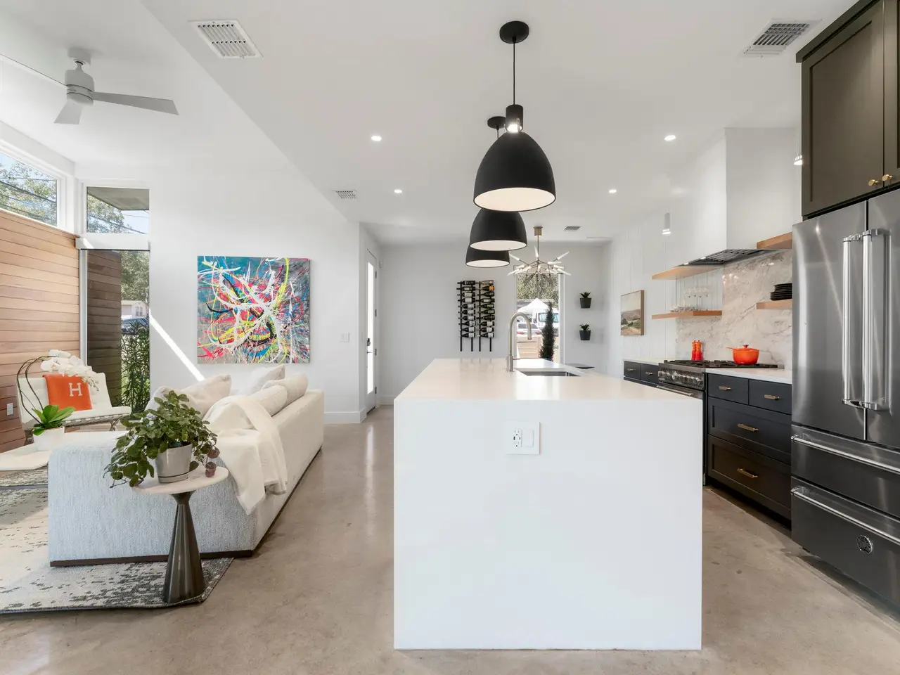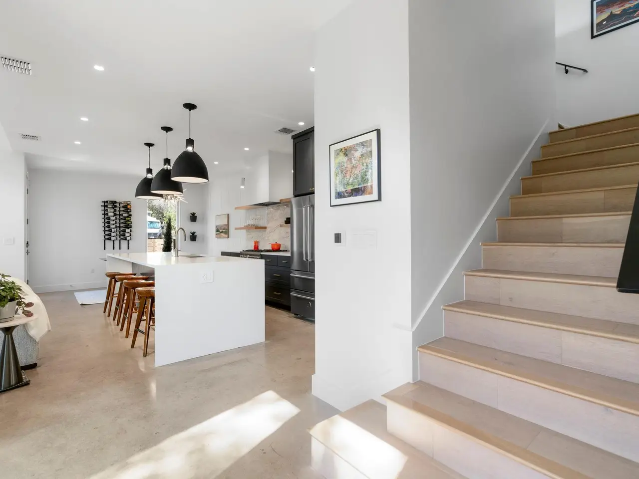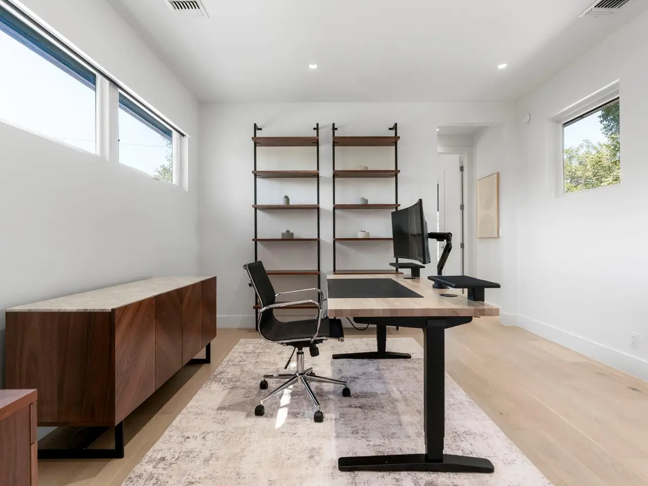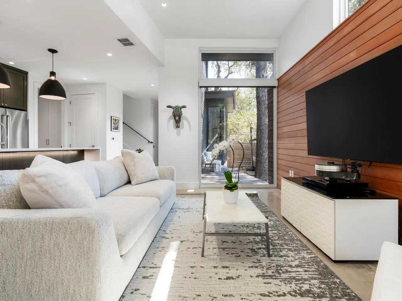 Live the 78704 lifestyle in comfort and style. Situated on a corner lot near South First Street, this modern residence blends convenient, lock-and-leave ease with thoughtful, design-forward upgrades. Tall ceilings and concrete floors ground the main level, while white oak flooring continues upstairs for a warm, cohesive look. The kitchen shines with stainless Bertazzoni appliances, a gorgeous tile backsplash, and an over-sized breakfast island. A $70K Lutron HomeWorks system with Ketra lighting and automated shades elevates every room with tailored light and effortless control.The main-level primary suite features two walk-in closets and a serene, spa-style walk-in shower, and dual raised vanities. Upstairs, a flexible second living room/den/office accompanies two additional bedrooms and a full bath, creating the ideal separation of spaces. Custom cabinetry in the mudroom and hallway keeps daily life streamlined, and the garage was enclosed to create additional protected parking with an EV charging port.Outdoors, the fenced yard is fully turfed, fully irrigated, and designed for gatherings with an extended 475 SF patio and deck beneath a leafy canopy, plus room for a pool, if desired. Recent exterior washing, retaped roof, and refreshed soffits reflect conscientious care. A side wood shed organizes garden and lawn tools. This is comfortable, convenient luxury in the heart of 78704, minutes to coffee, dining, and South Austin's best parks and boutiques.